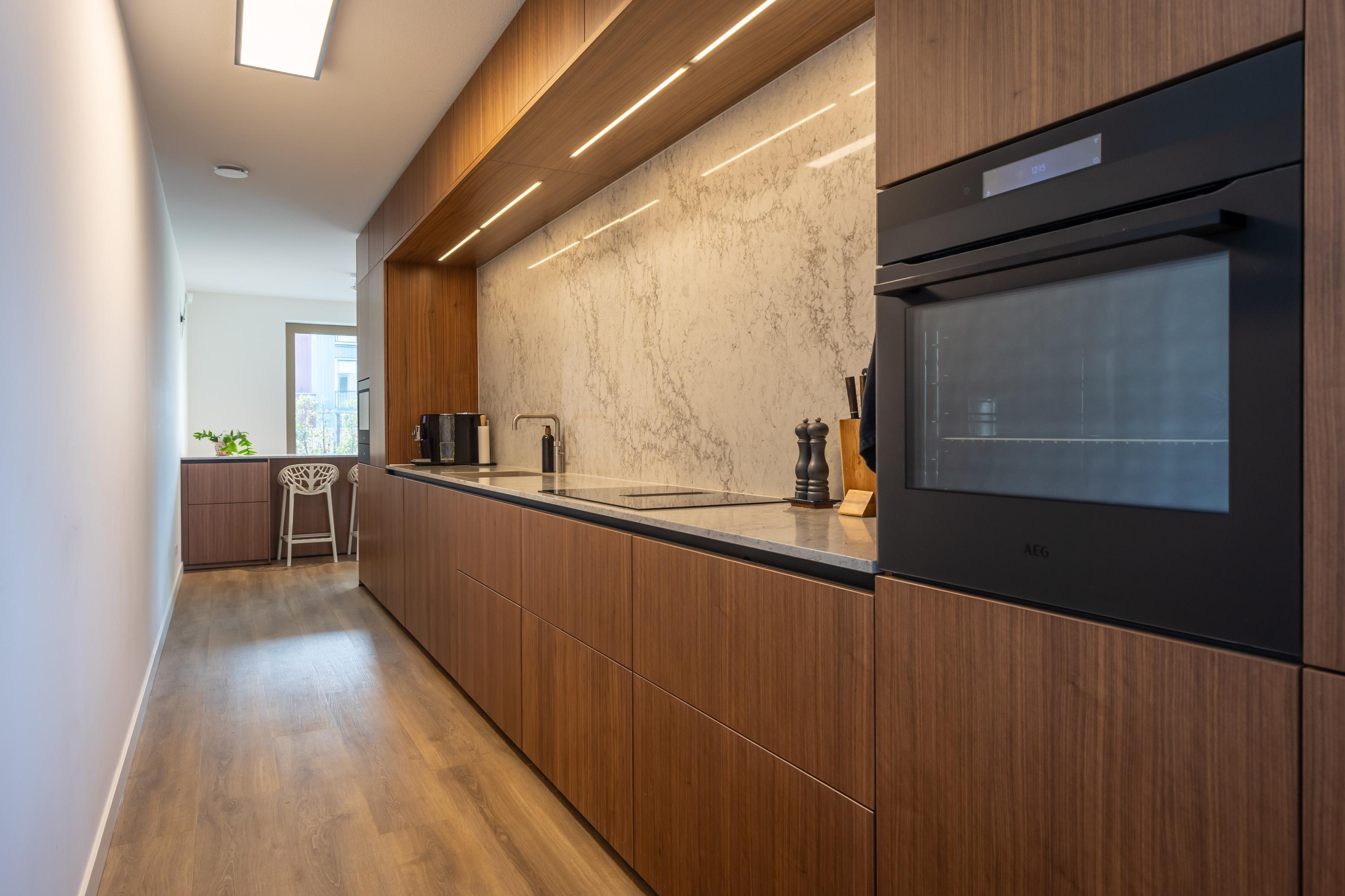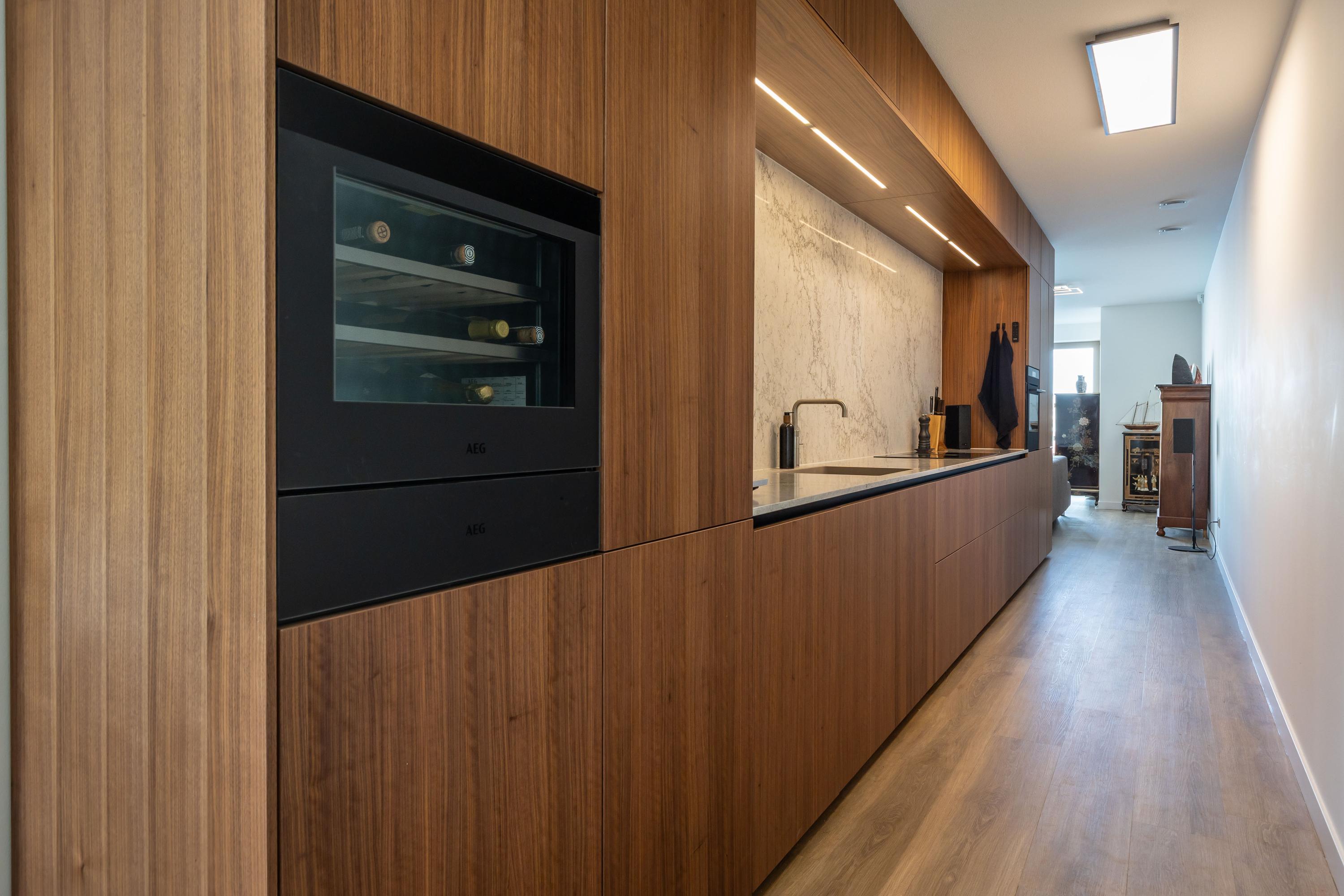 Between the living room and the dining area lies the striking 7.20-metre kitchen by NEXT-125, a design on par with high-end interior architecture. The tall units include a wine climate cabinet, warming drawer, combi oven and fridge-freezer. The wide induction hob with integrated extraction, silent dishwasher and Quooker tap complete the ensemble. The walnut cabinetry is paired with a luxurious composite worktop and splashback in a marble design with continuous veining, creating a look that is calm, luxurious and timeless.