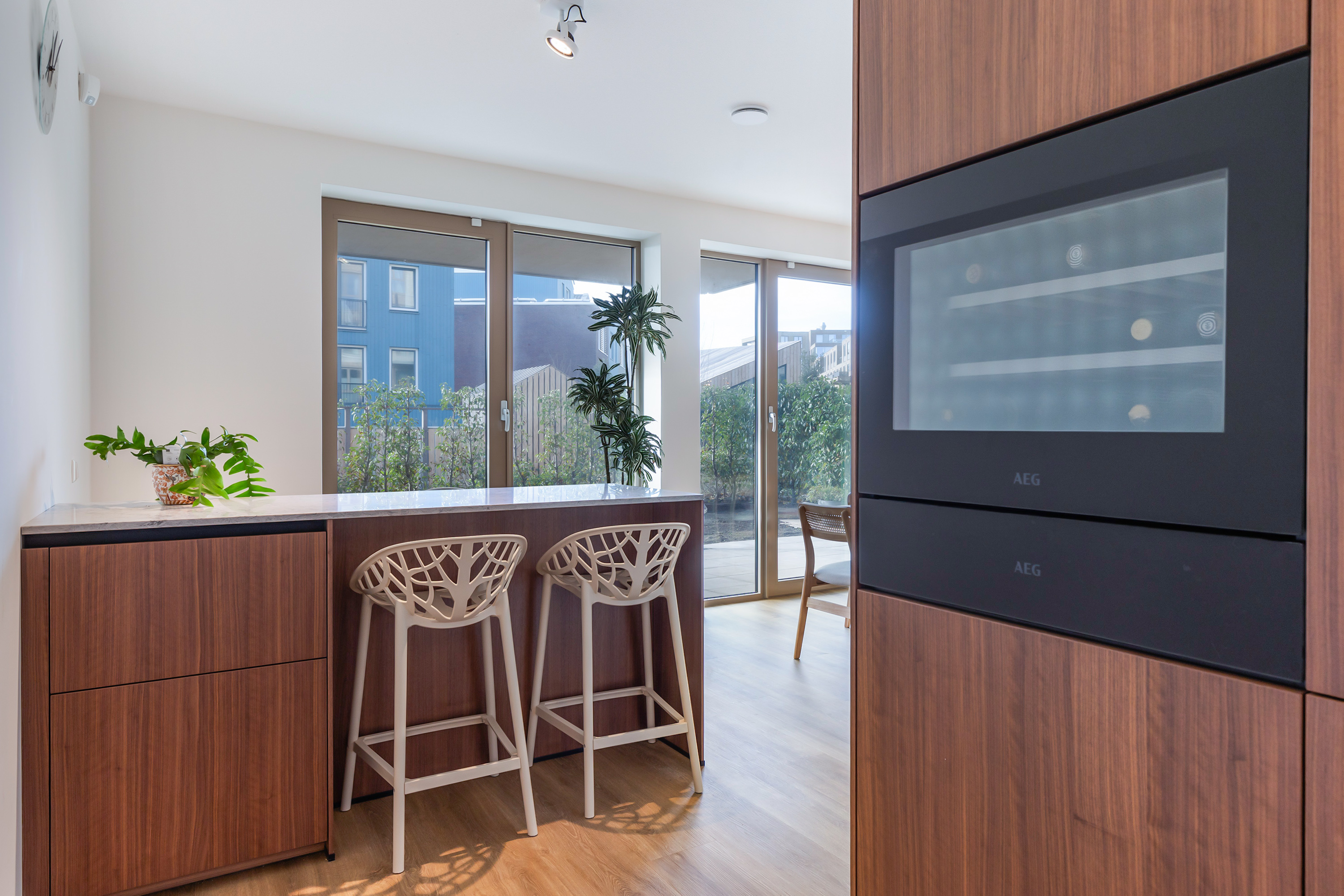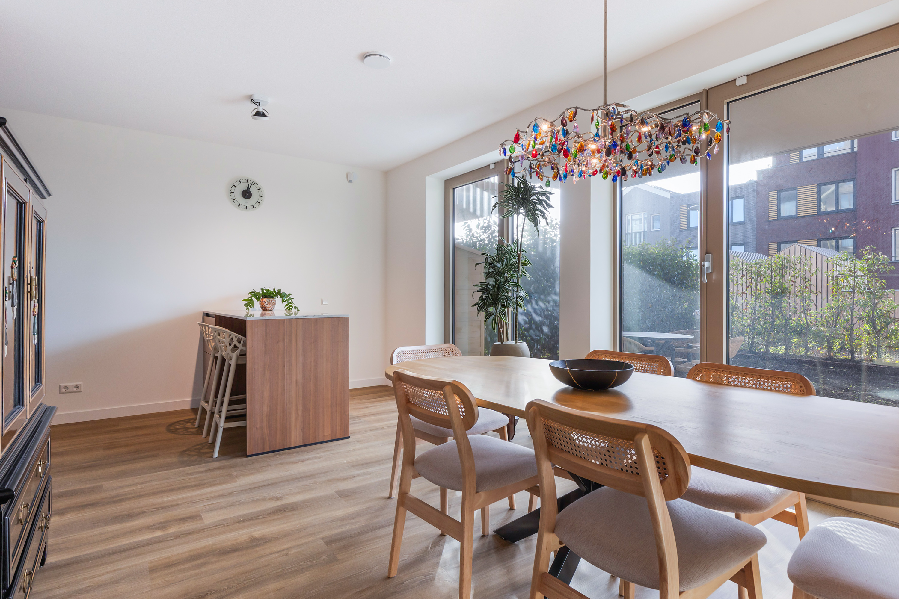 In the dining area stands a matching kitchen island with storage and a bar for two stools. This space lends itself perfectly to long dinners, relaxed evenings with guests, or a quiet breakfast overlooking the garden. The generous dimensions easily accommodate a large dining table.