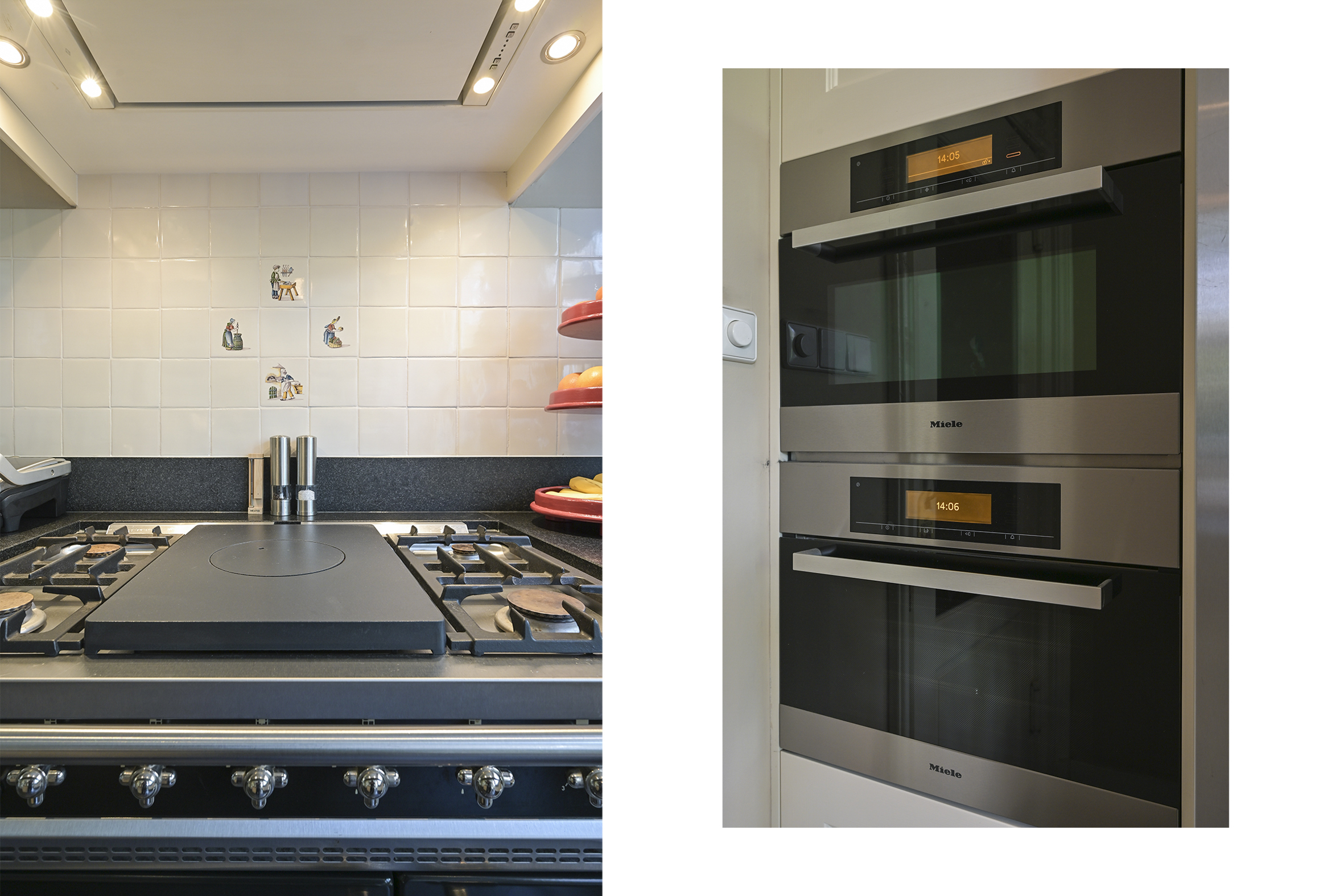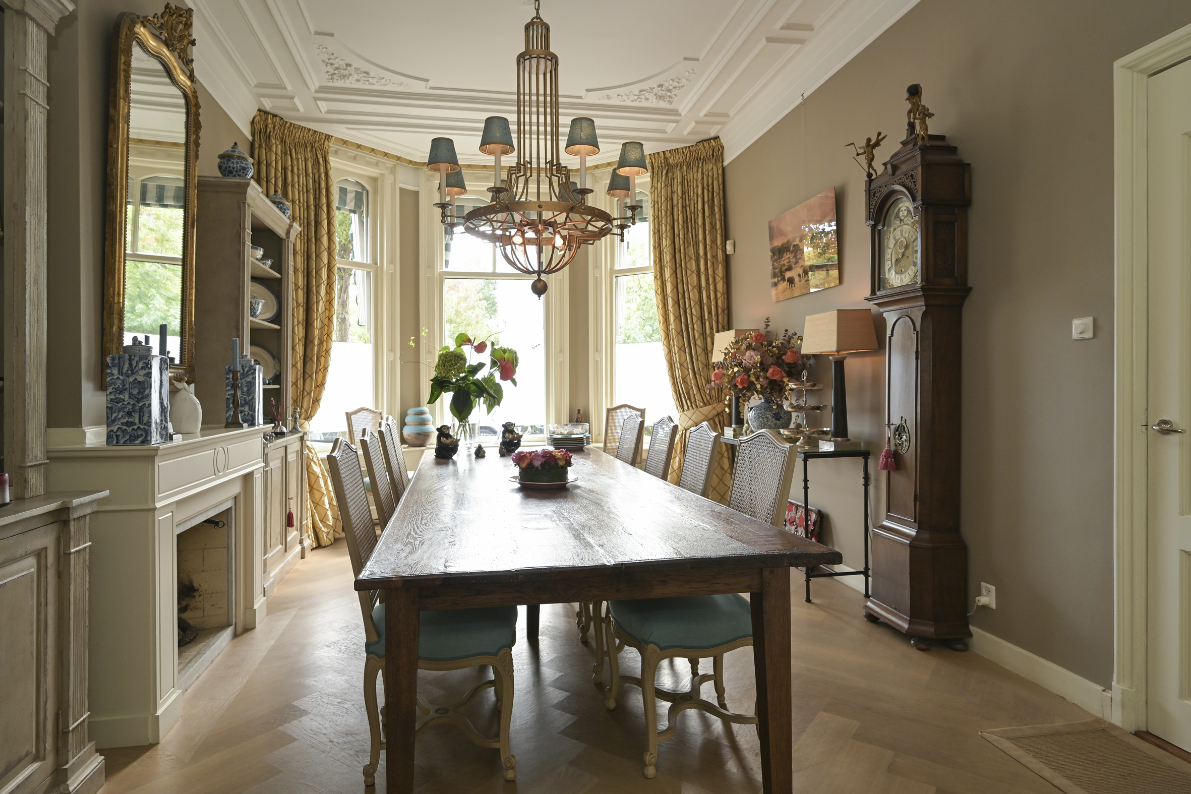 Layout: entrance, vestibule with built-in wardrobes and draft separation, hallway with storage space under the stairs, modern toilet with washbasin, and access to the cellar. Delightful, spacious living/dining room with suite separation featuring high sliding doors and built-in cupboards. Both rooms feature high ornate ceilings, beautiful oak parquet floors, and marble fireplaces with (gas) fires. The back room is connected to the full-width eat-in kitchen by a transparent partition, featuring built-in appliances, an island, and a gas fireplace. Double French doors lead to the delightfully private rear garden with a back entrance.