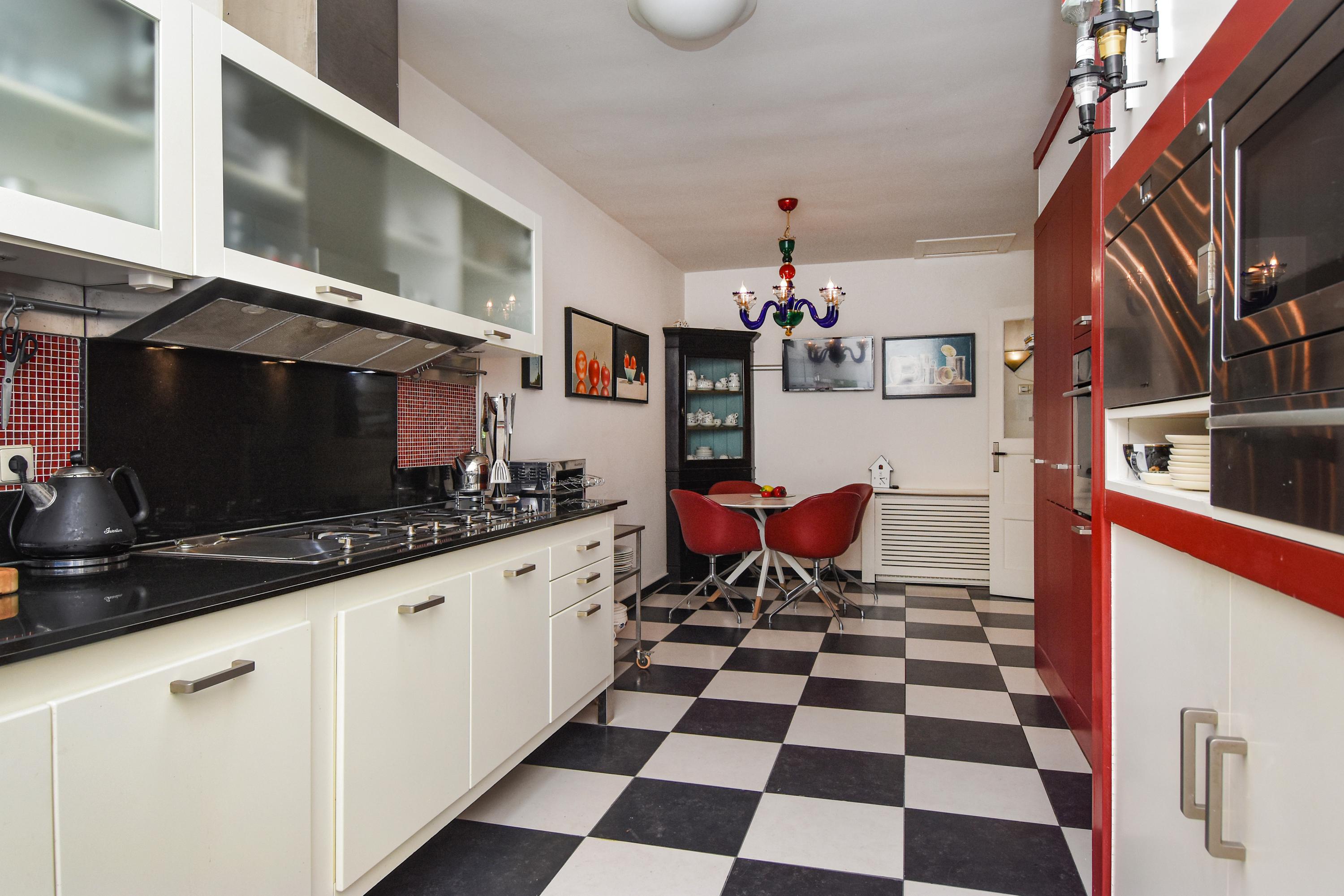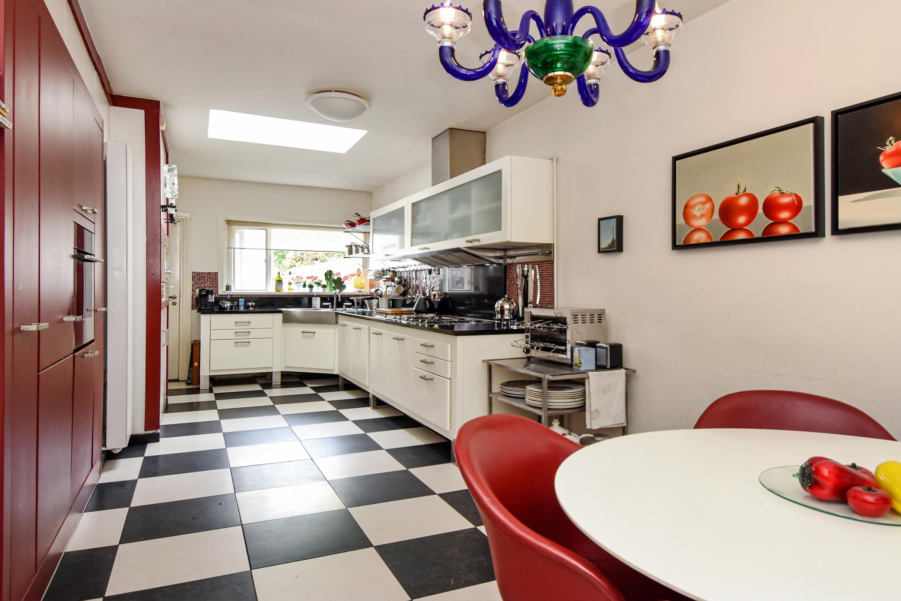 The spacious kitchen, illuminated by a skylight, has a black and white tiled floor and ample storage space including a separate cupboard housing the central heating unit. Built-in appliances include an oven, fridge, and freezer; above the five-burner gas stovetop and grill plate set in the stylish stone countertop is a wide extractor fan.