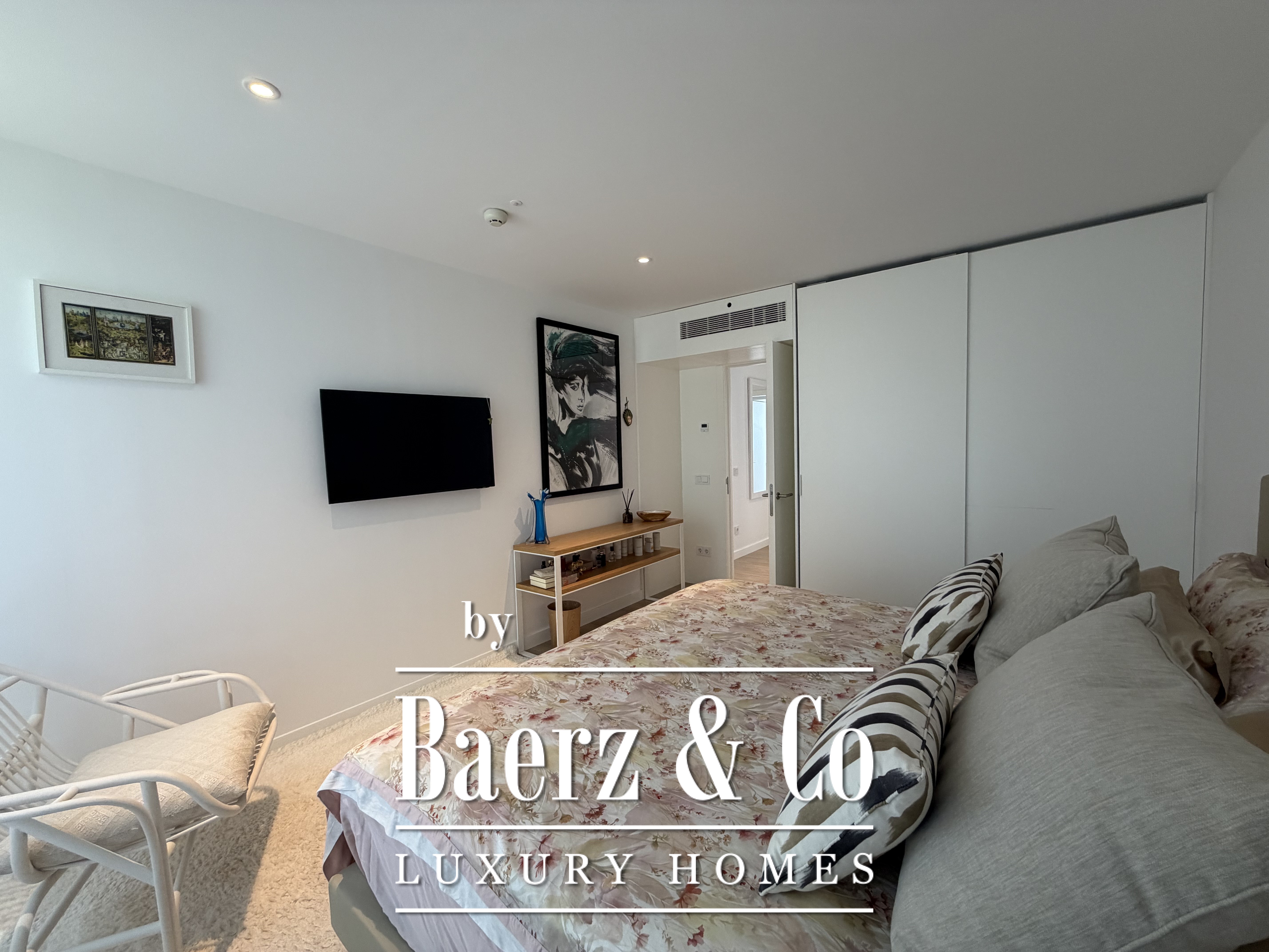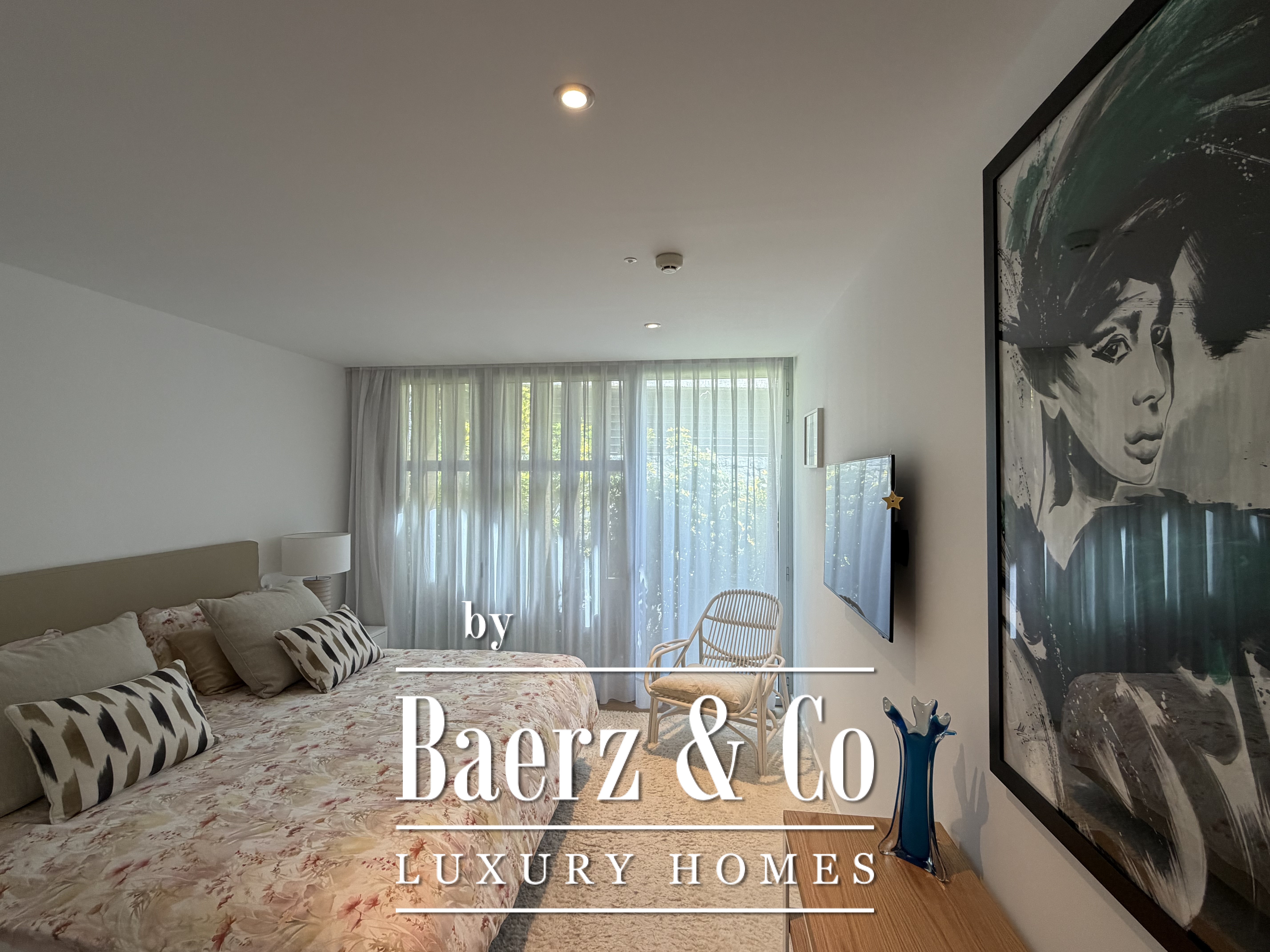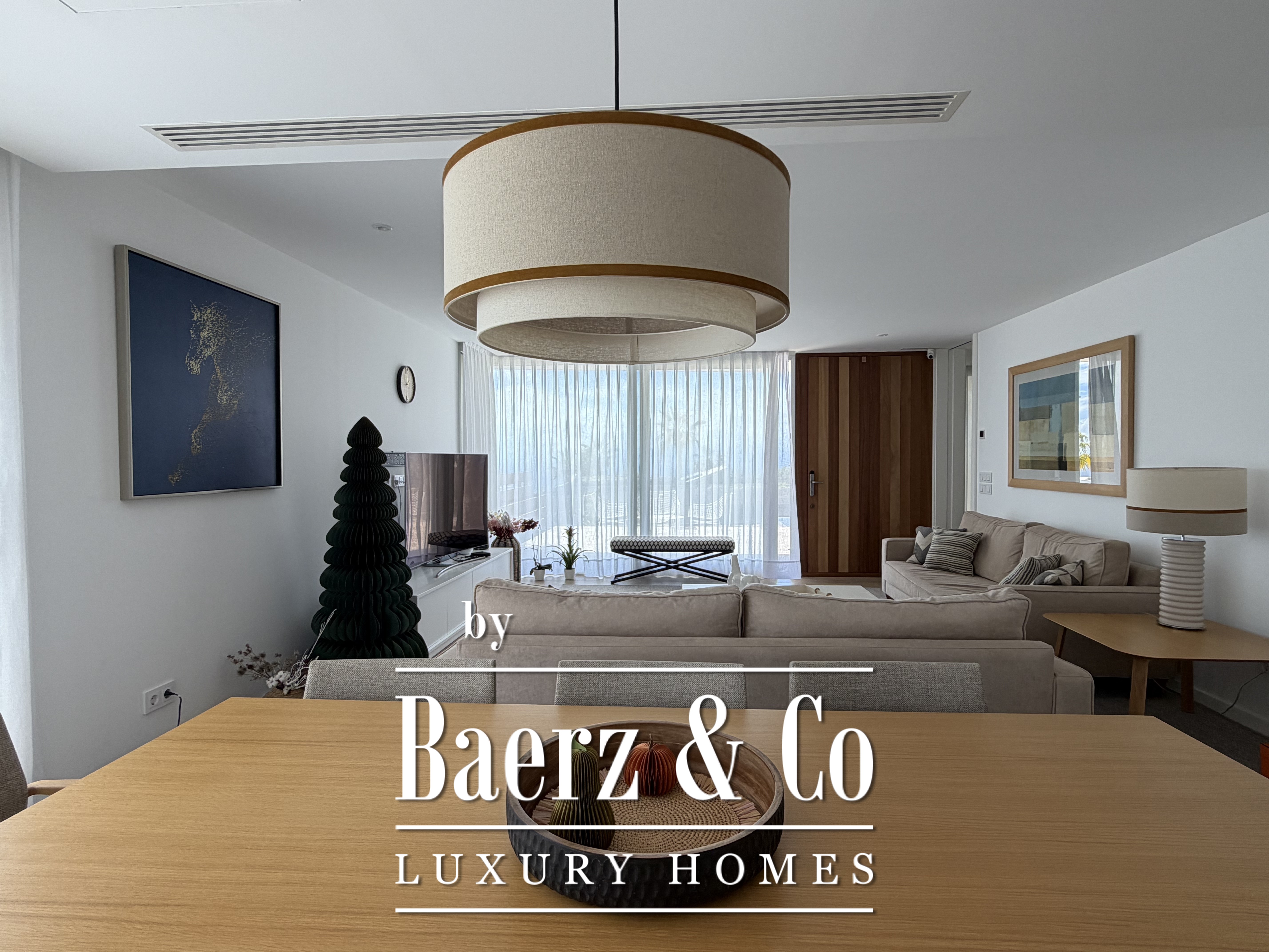 Natural light fills the interiors through expansive windows, framing the horizon and creating seamless access to the terrace and landscaped garden. Three bedrooms offer dressing rooms, while two bathrooms feature modern showers, underscoring the emphasis on refined functionality. The bright living room invites relaxation, whether enjoying a quiet moment or sharing the space with guests.