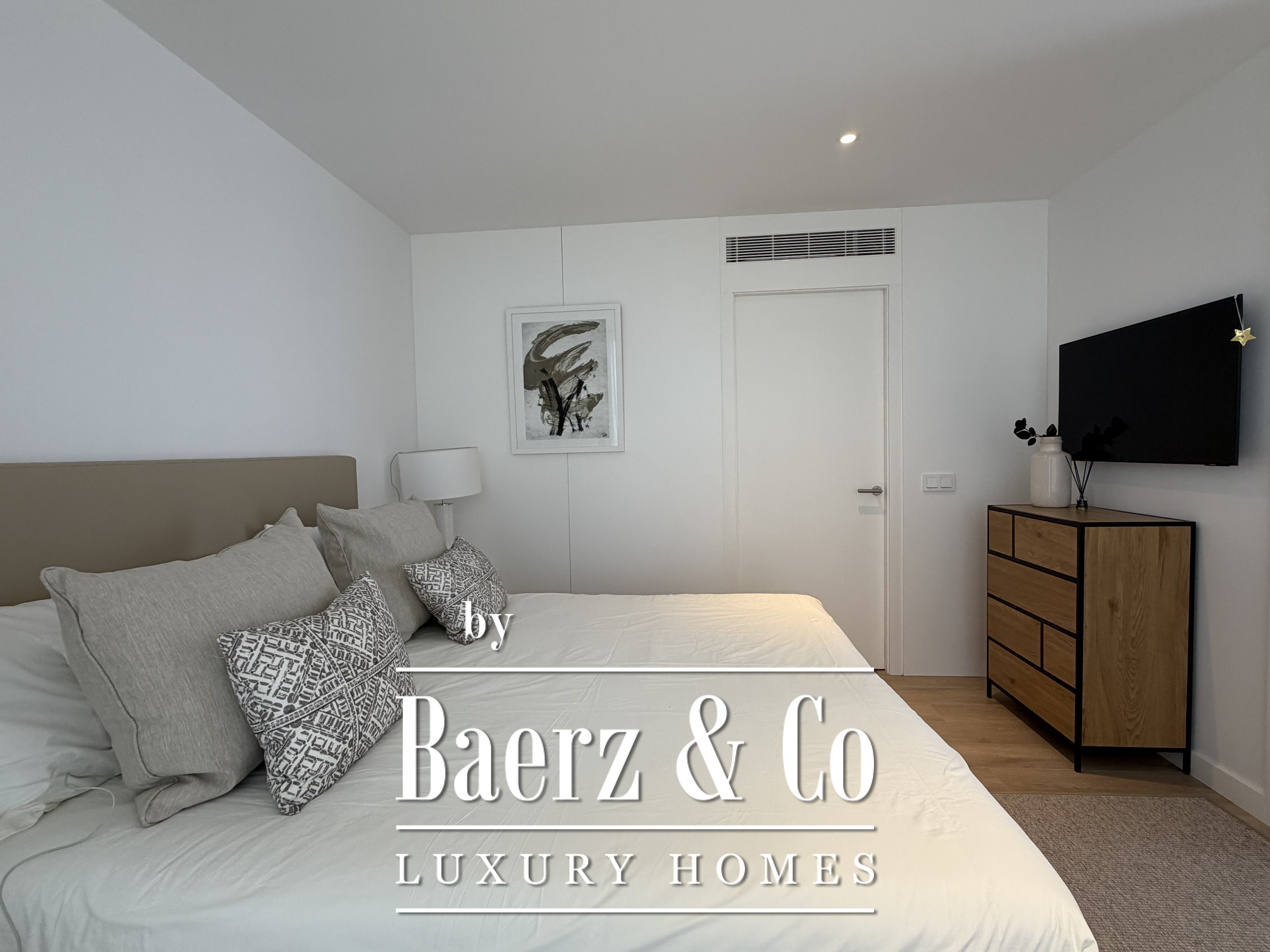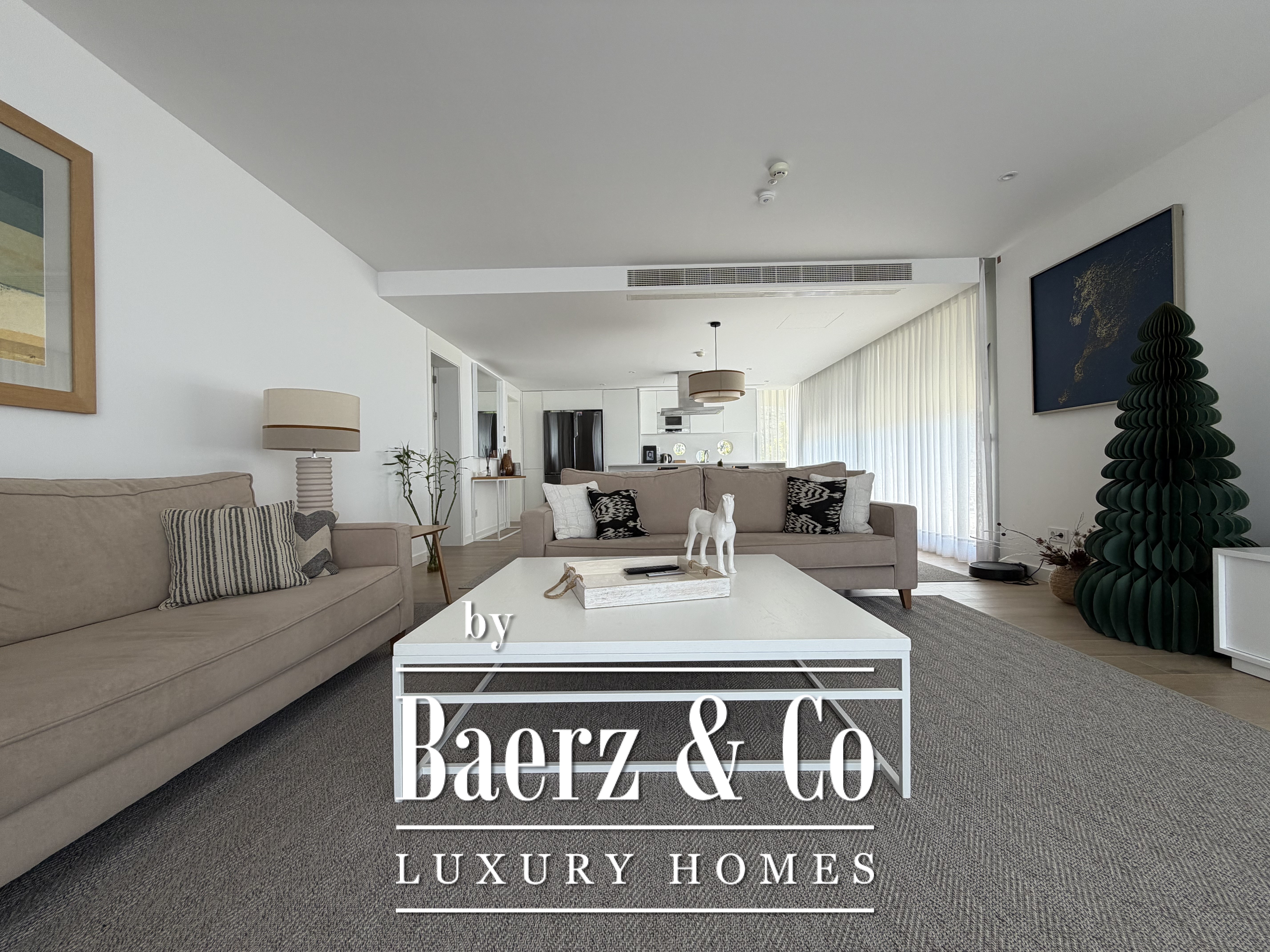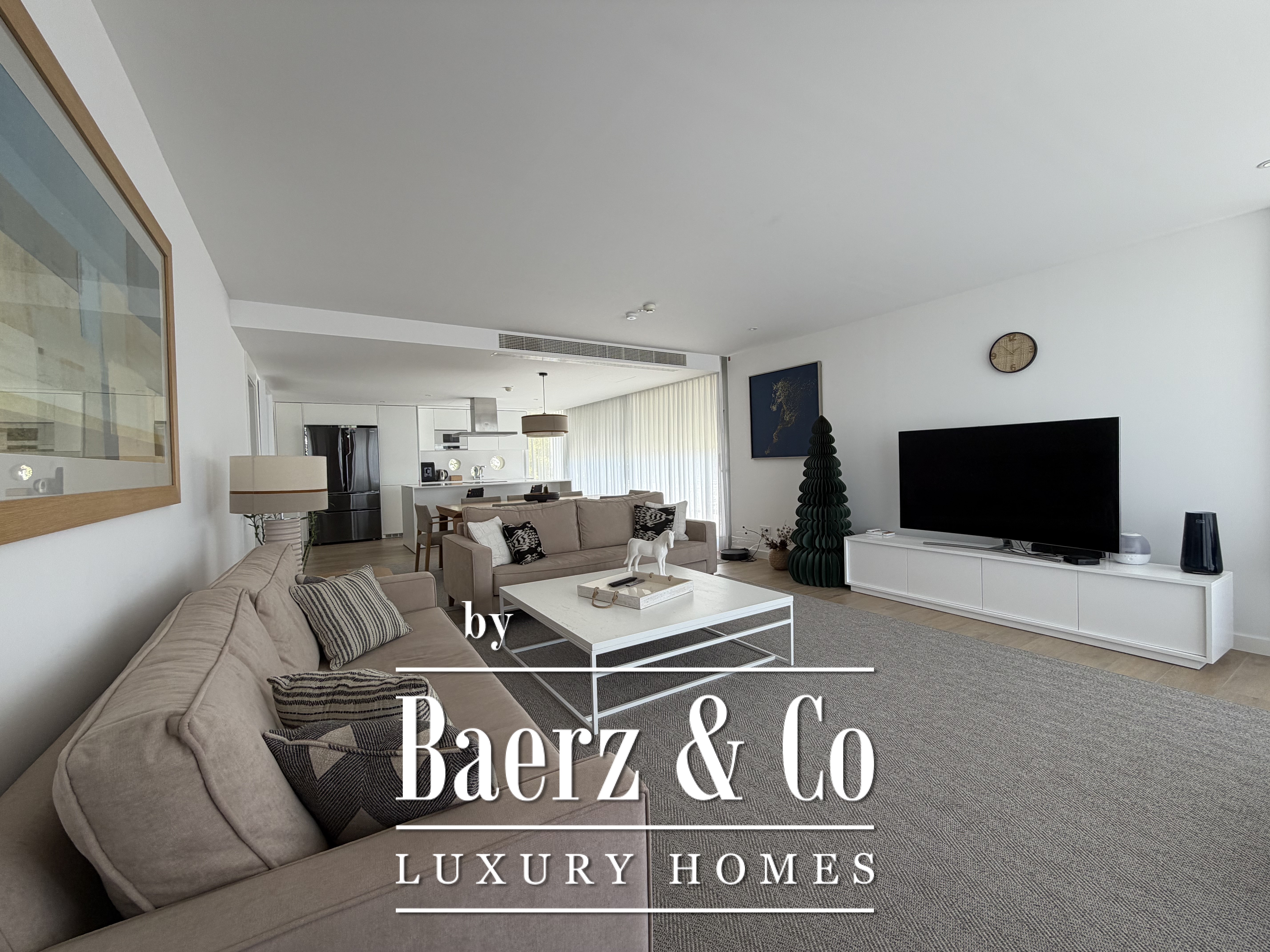 Natural light fills the interiors through expansive windows, framing the horizon and creating seamless access to the terrace and landscaped garden. Three bedrooms offer dressing rooms, while two bathrooms feature modern showers, underscoring the emphasis on refined functionality. The bright living room invites relaxation, whether enjoying a quiet moment or sharing the space with guests.