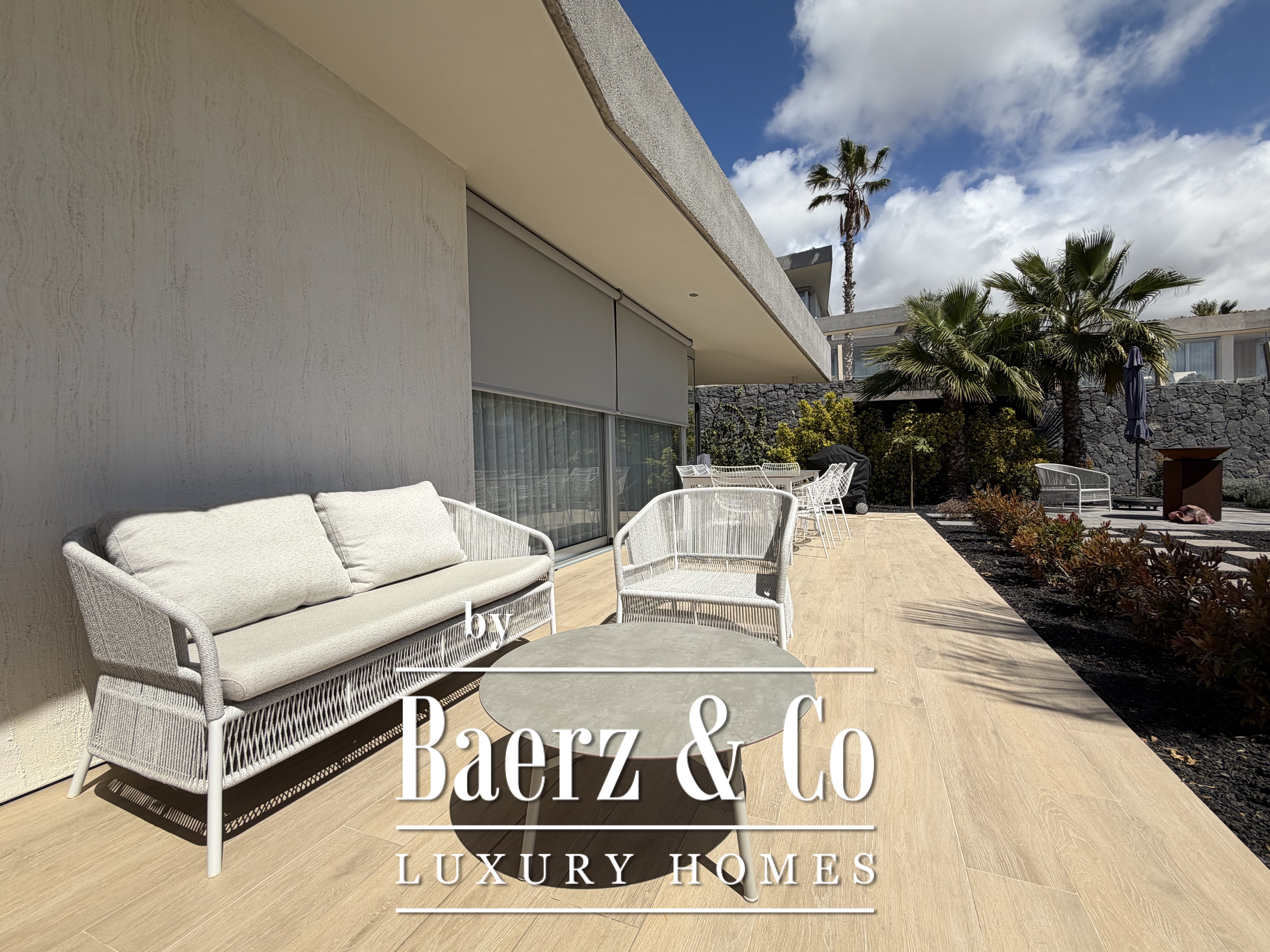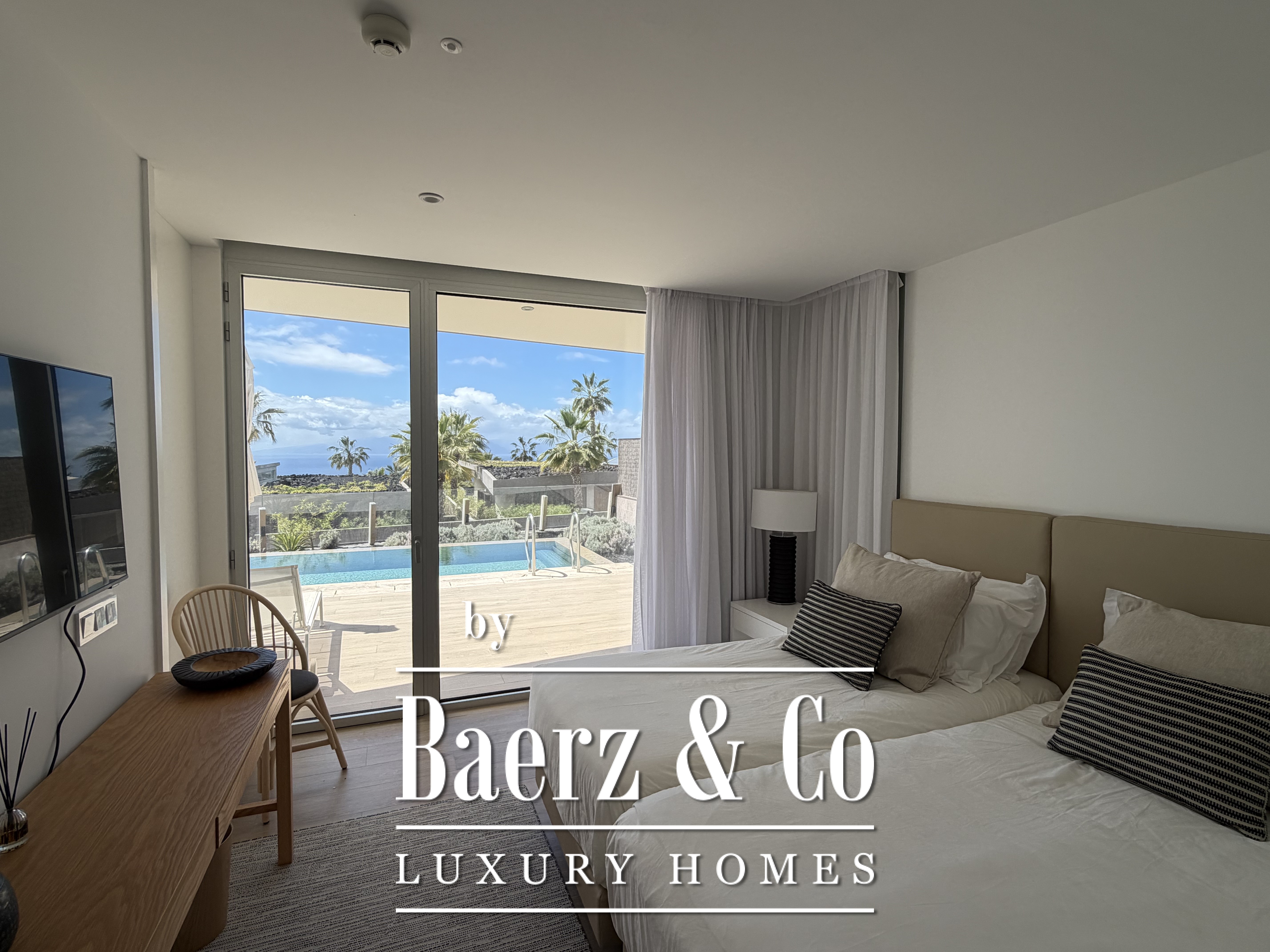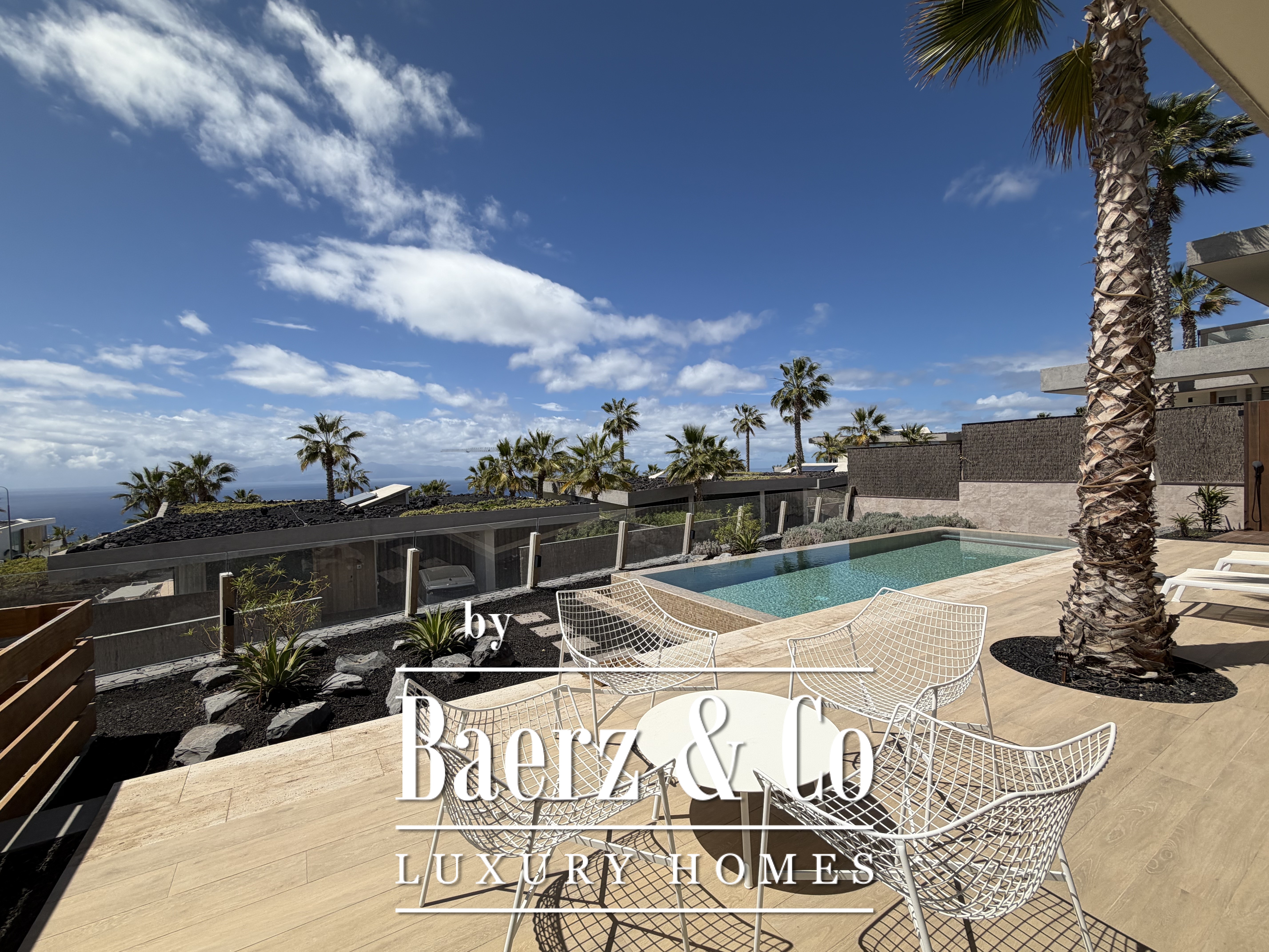 Villa Abama with ocean views welcomes you to the distinguished enclave of southern Tenerife, where contemporary design meets comfort over 265 m² of living space. This single-story villa stands within the esteemed Abama resort, privately set on a 662 m² plot with privileged views across the Atlantic, the golf course, and the island of La Gomera.