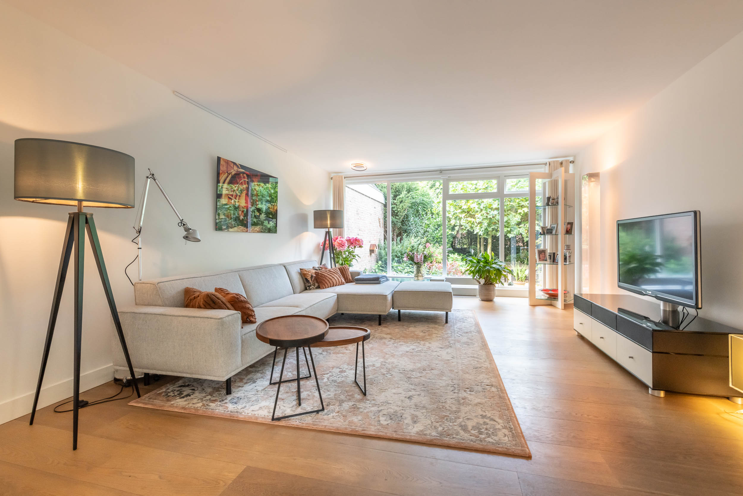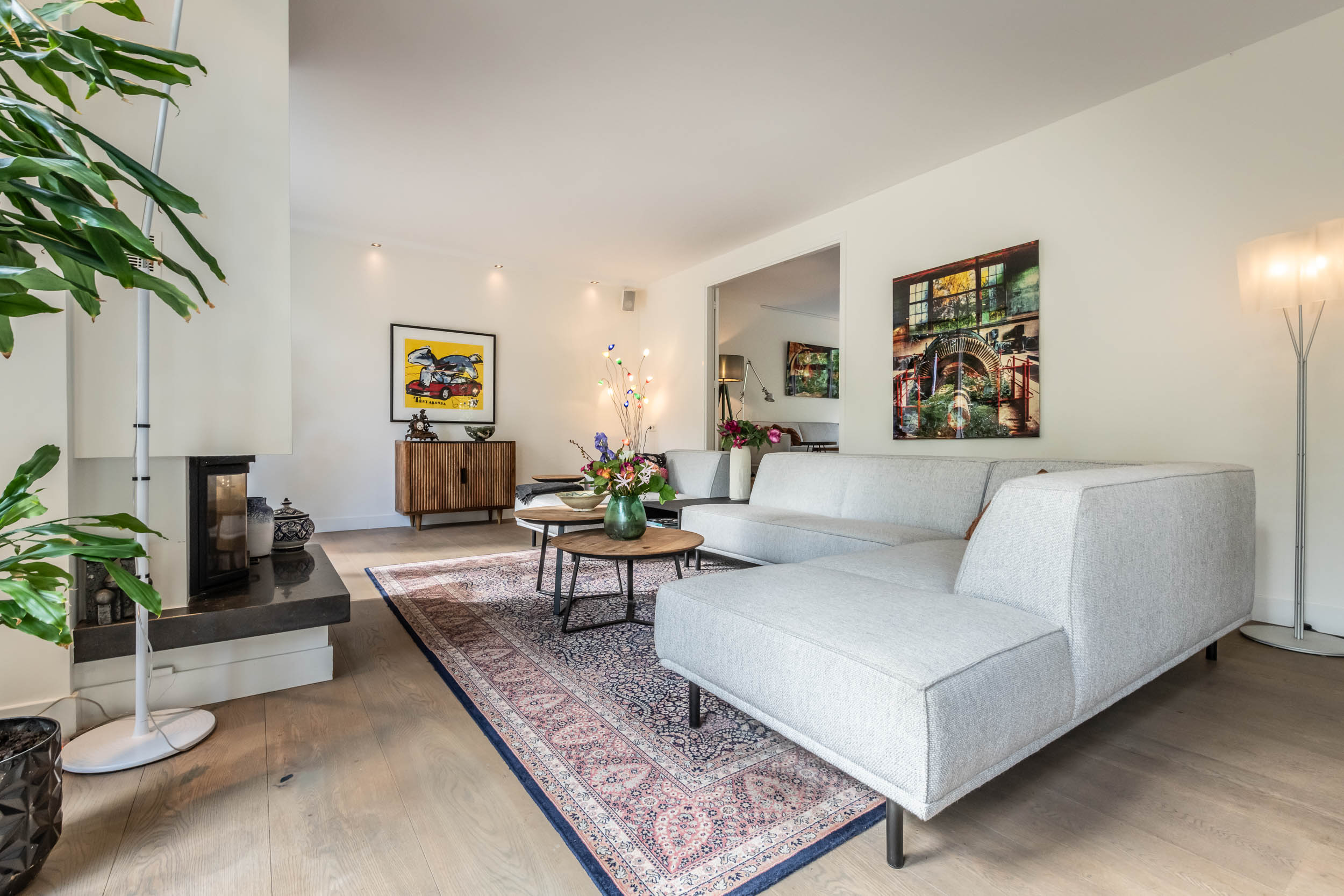Entrance hall, spacious hallway with toilet and urinal, bright and spacious living room with fireplace, oak flooring and doors to the front terrace. A double door connects to the second living room/TV room with large windows and a view of the back garden. Luxurious, tailor-made kitchen-diner (’t Spant in Heemstede, 2022) featuring underfloor heating, a sink/kitchen island and various built-in appliances: wine climate cabinet, ovens, Quooker with sparkling water feature, coffee machine, Bora electric hob with flex zones and dishwasher. Door to the side garden.