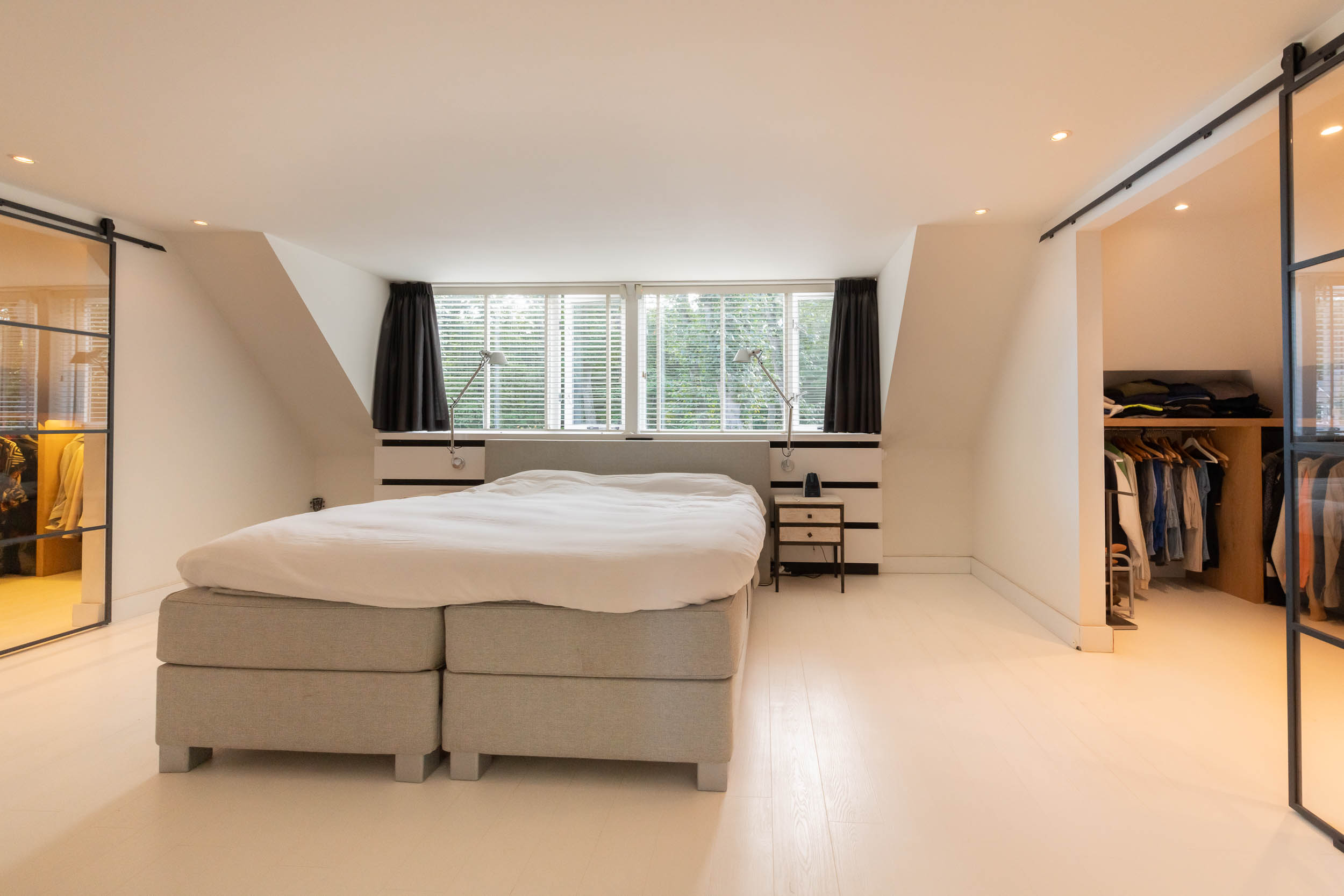 Landing, three bedrooms, including the spacious master bedroom (formerly two rooms) with walk-in wardrobes on both sides. Modern, tailor-made bathroom (’t Spant in Heemstede, 2022) with large dormer window, double washbasin unit, toilet, ample cupboard space, underfloor heating, freestanding bathtub, walk-in shower with Sunshower and hand shower.