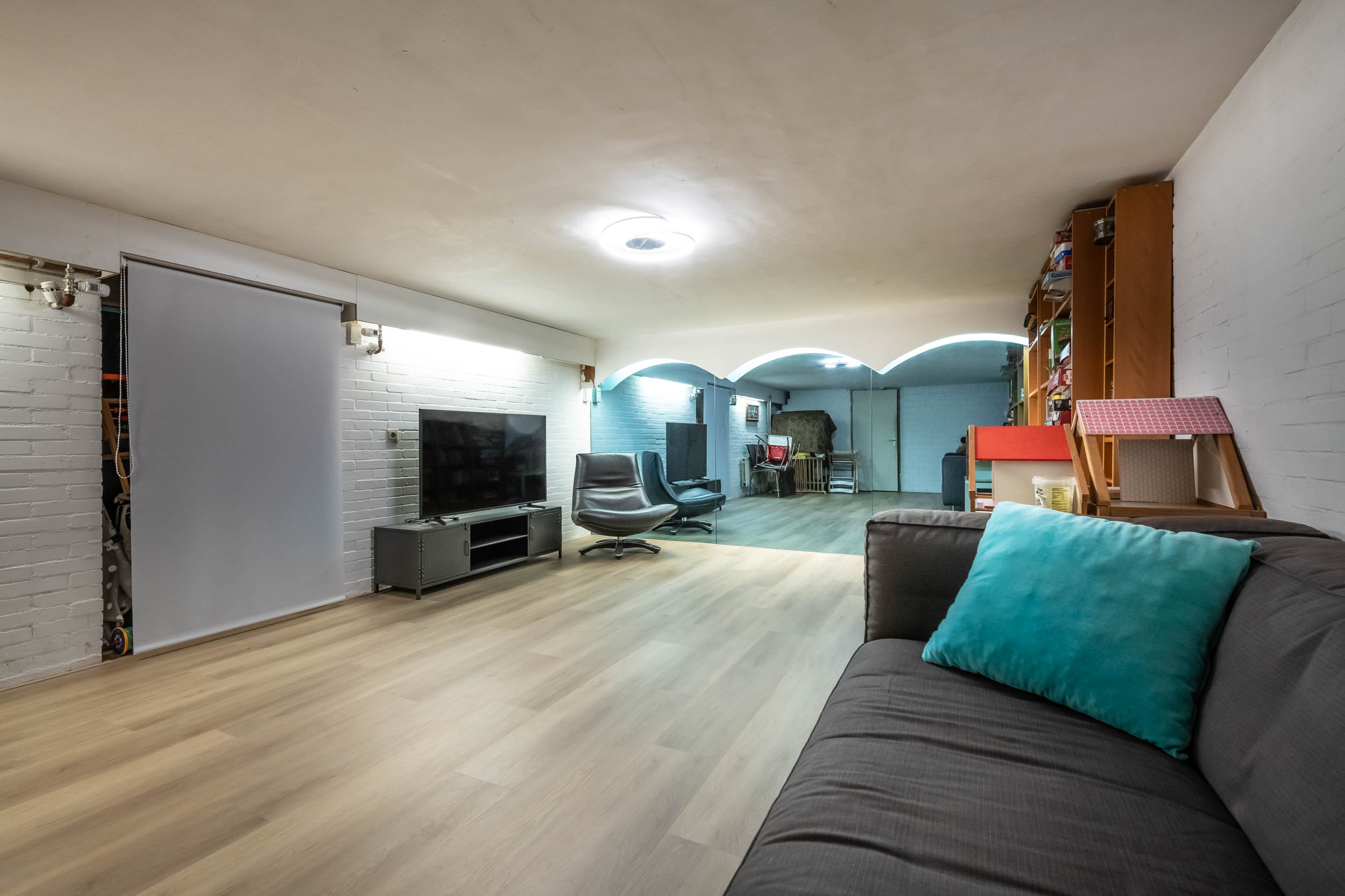Hallway, indoor garage with cupboard wall, storage room, (bed)room, bathroom with shower, toilet and washbasin, spacious (fitness) room, large (play) room and a separate, spacious laundry room.