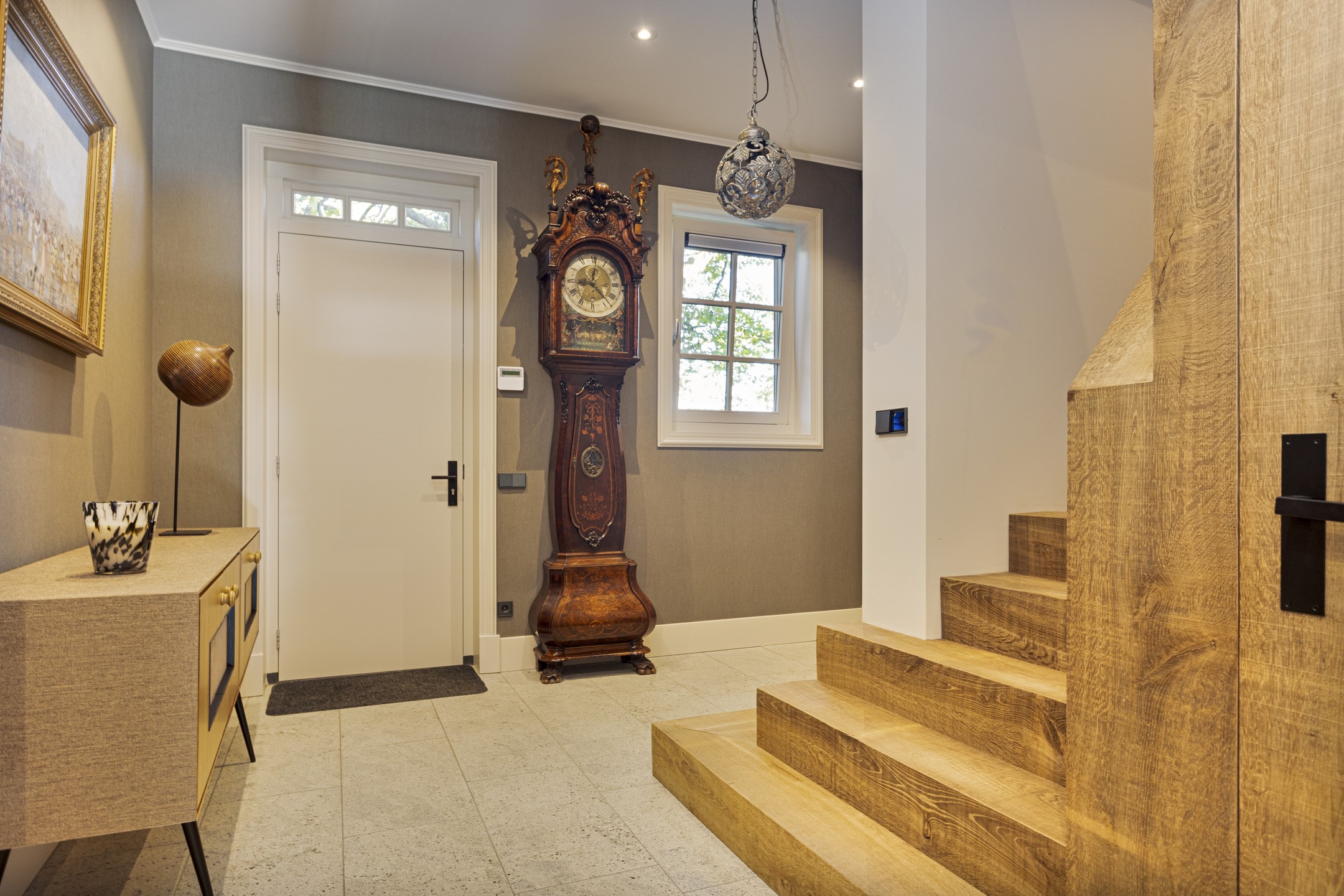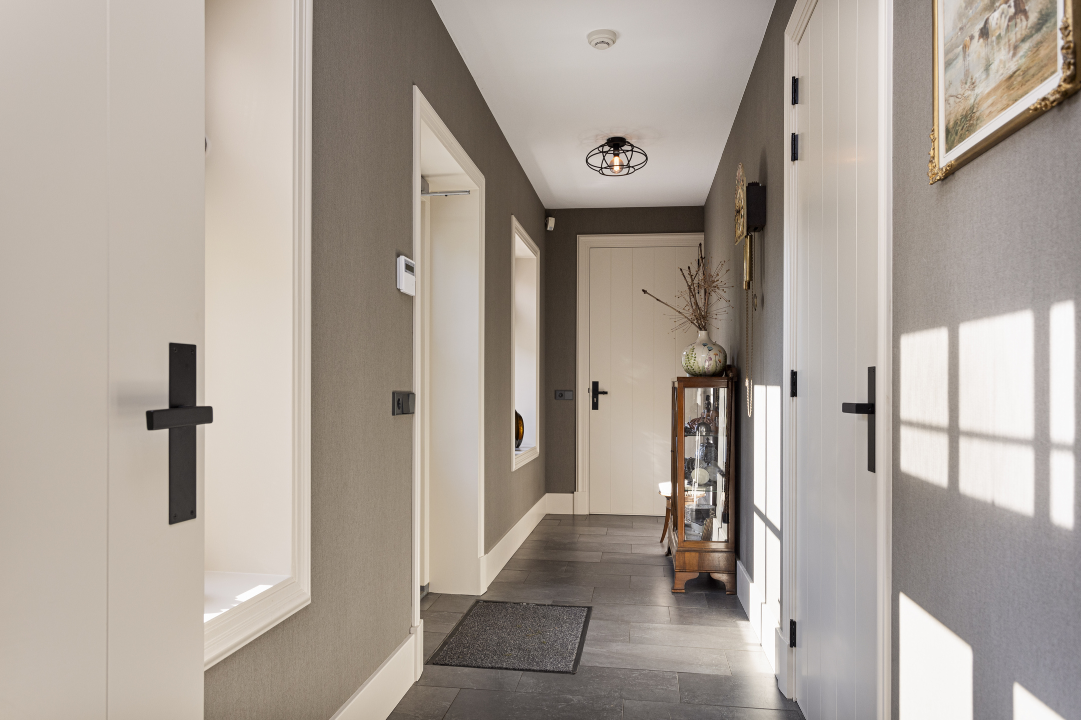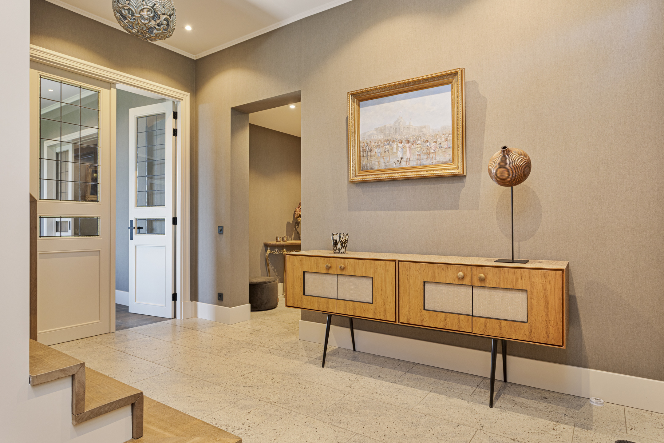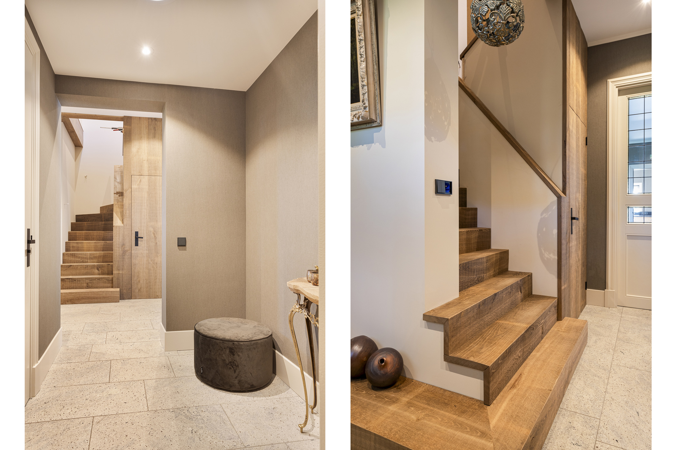 In the hall on the floor, the travertine Vieux de Bourgogne dales, which also make their reappearance in the kitchen and hallway. On the wall, a very tasteful linen structure wallpaper in a fine taupe color, which provides a beautiful background for any type of interior. Modern rustic was chosen here and all the elements work together in full harmony to create a wonderful composition. On the left the stairs to the floor, on the right the WC - out of the art with gorgeous glazed Portuguese tiles and matte black ceramic plumbing in the form of hanging closet and sink arrangement- and the access to the studio. To the left is the spacious basement.
