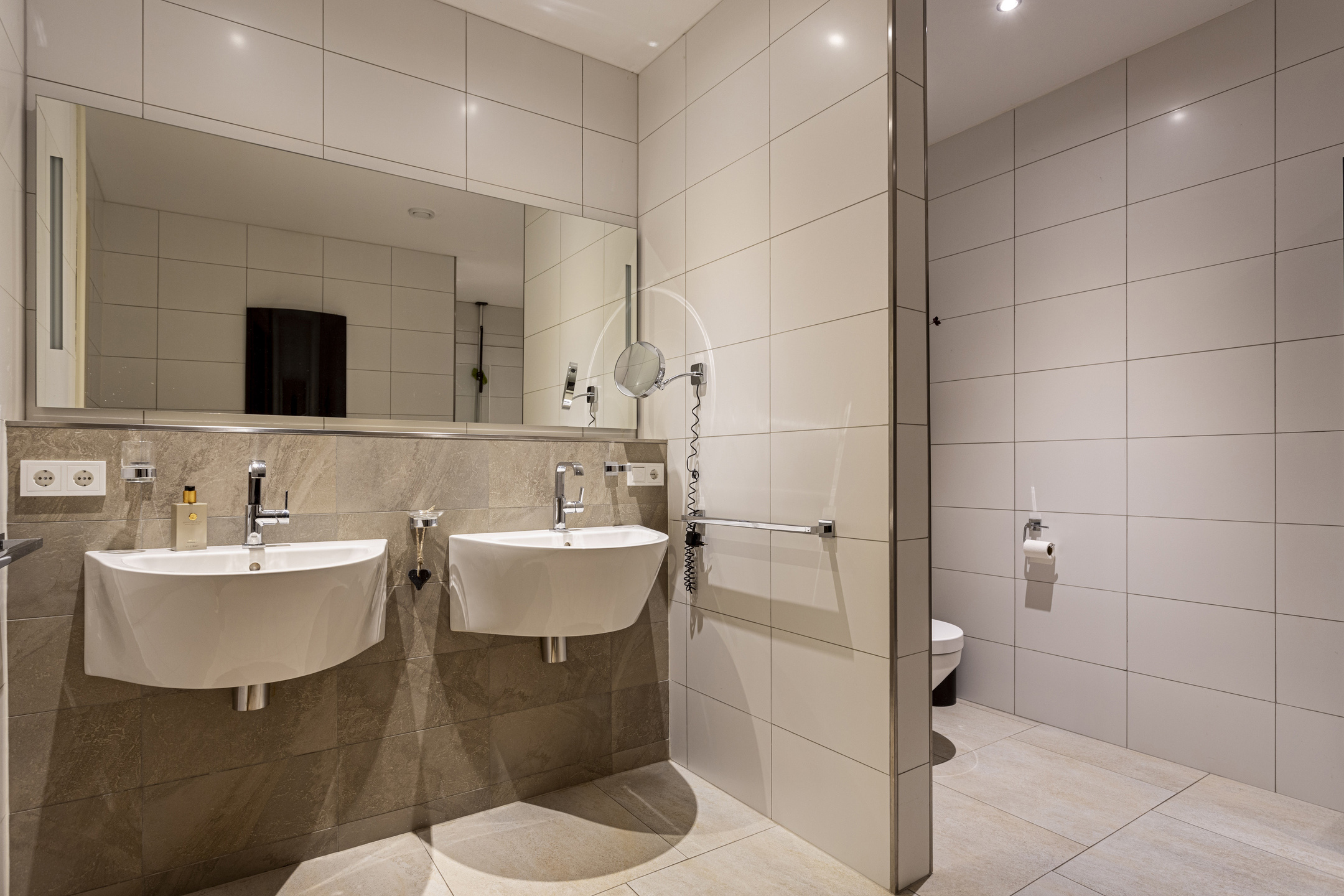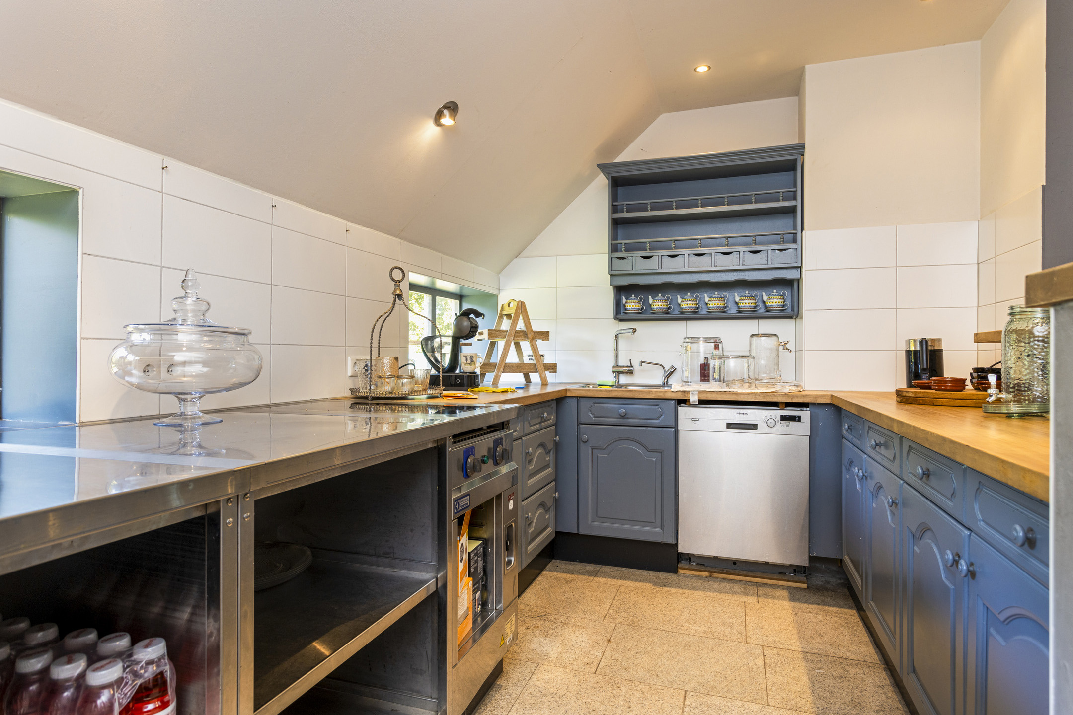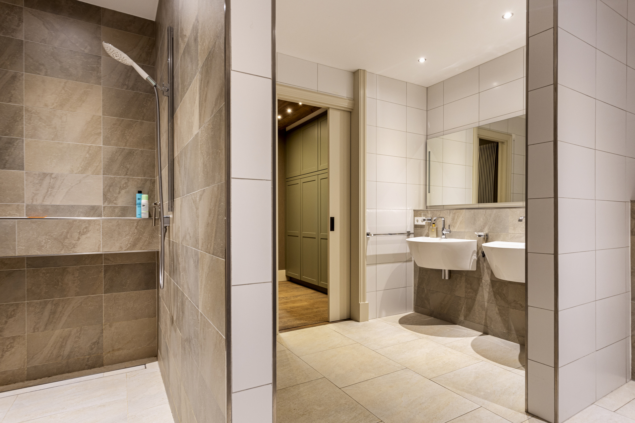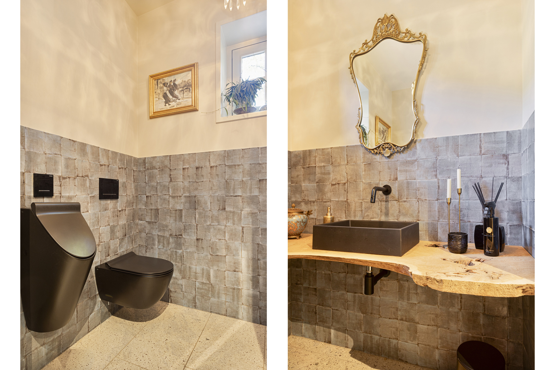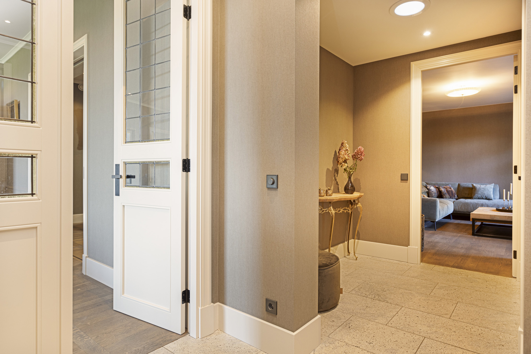 In the hall on the floor, the travertine Vieux de Bourgogne dales, which also make their reappearance in the kitchen and hallway. On the wall, a very tasteful linen structure wallpaper in a fine taupe color, which provides a beautiful background for any type of interior. Modern rustic was chosen here and all the elements work together in full harmony to create a wonderful composition. On the left the stairs to the floor, on the right the WC - out of the art with gorgeous glazed Portuguese tiles and matte black ceramic plumbing in the form of hanging closet and sink arrangement- and the access to the studio. To the left is the spacious basement.