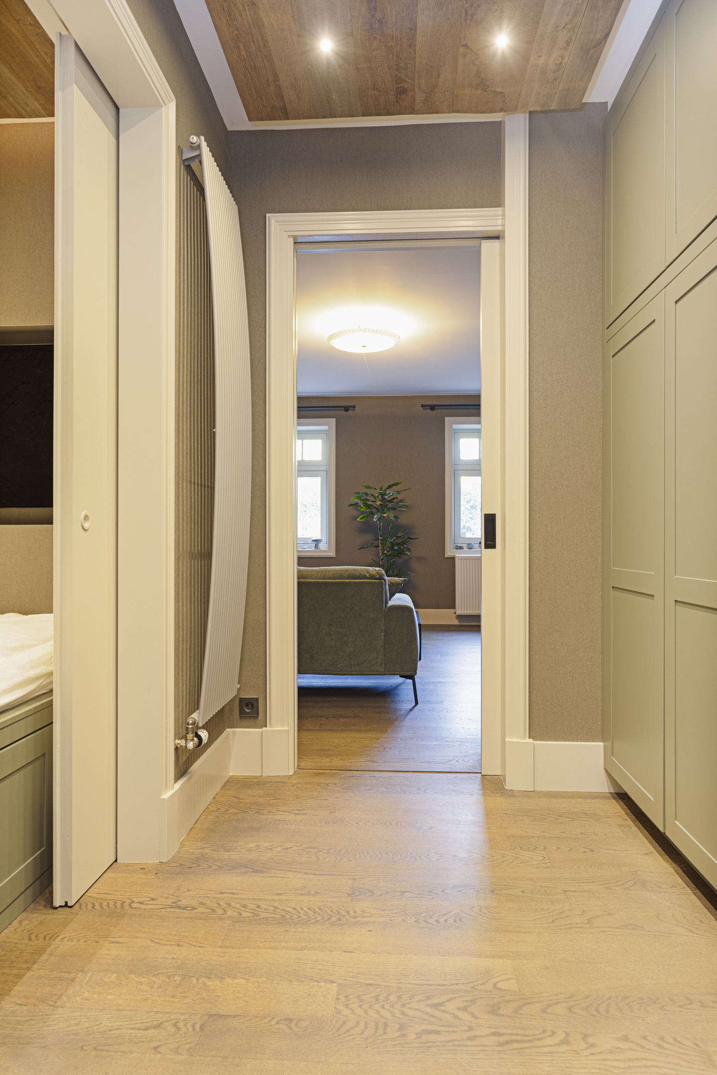The living room has a magnificent floor; it is an old castle floor from the French chateau of the previous owners. The current residents had it beautifully sanded and coated with a refined gray floor oil, blending seamlessly into the contemporary interior. The music room is a room en-suite, separated from the living room by sliding doors, and now has the role of an old-fashioned art cabinet, but one whose indoor climate can be adjusted entirely as desired. If you do not have a Steinway or art collection to display here, then this is a wonderful study, library, cinema or dining room. To the left, overlooking the garden and side terrace, is the upstairs room, which shares a gas fireplace with the living room. A lovely corner to crawl away with a good book.
