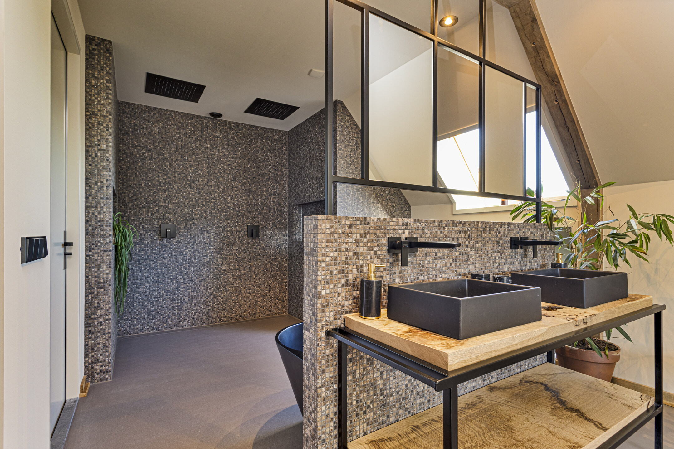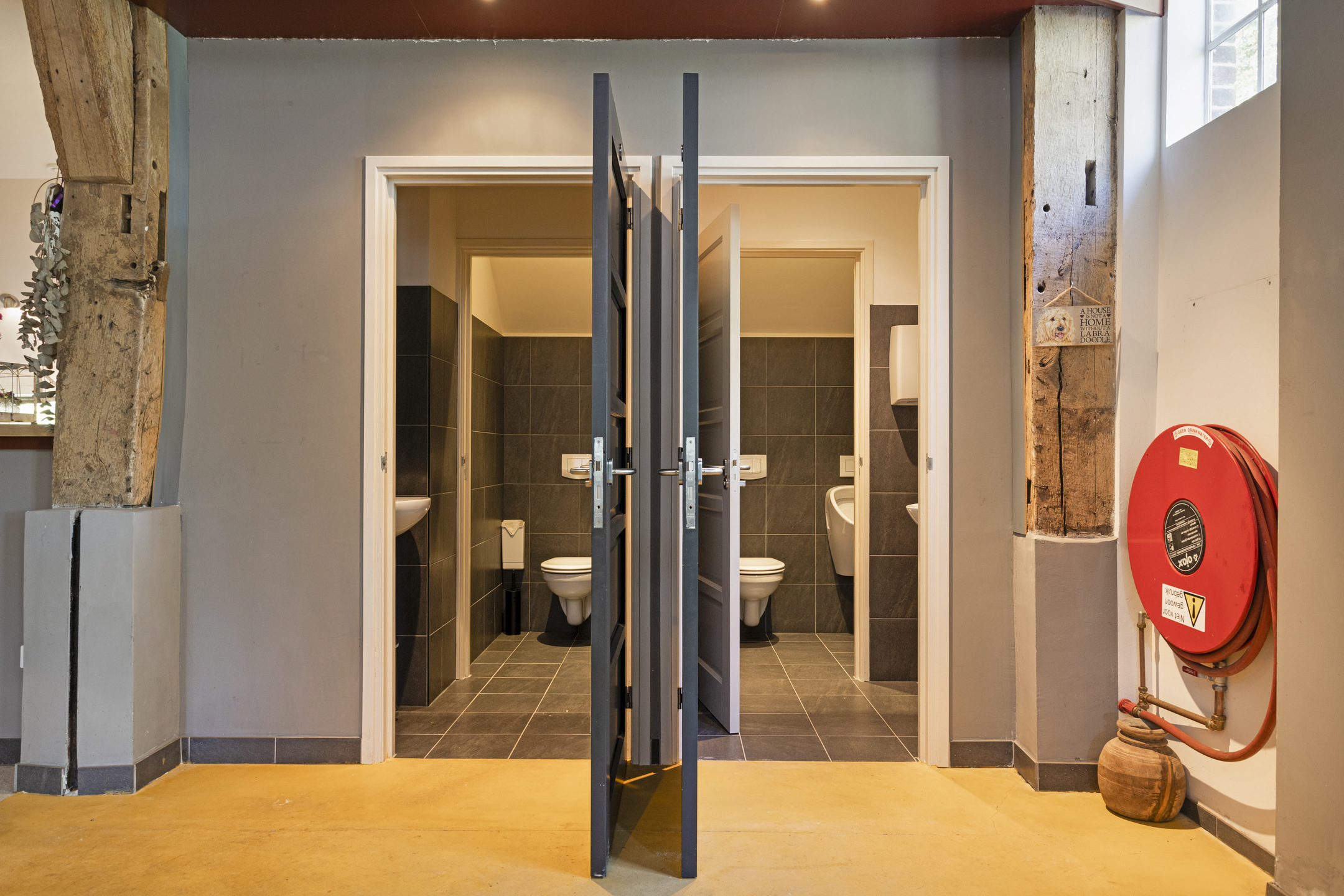 The part, where the cows used to ruminate, has been transformed into a super cool space; the rafters and the thick reed package (there is still insulation material in between) have been left in sight and the space is nice and light through the skylights. The concrete floor - ready for the installation of floor heating -, the beautiful loam stove and the staircase (forge Oldenhave from Vorden) give it a raw, industrial edge. Downstairs, two separate toilets have been installed. Upstairs, the billiard room will be realized.