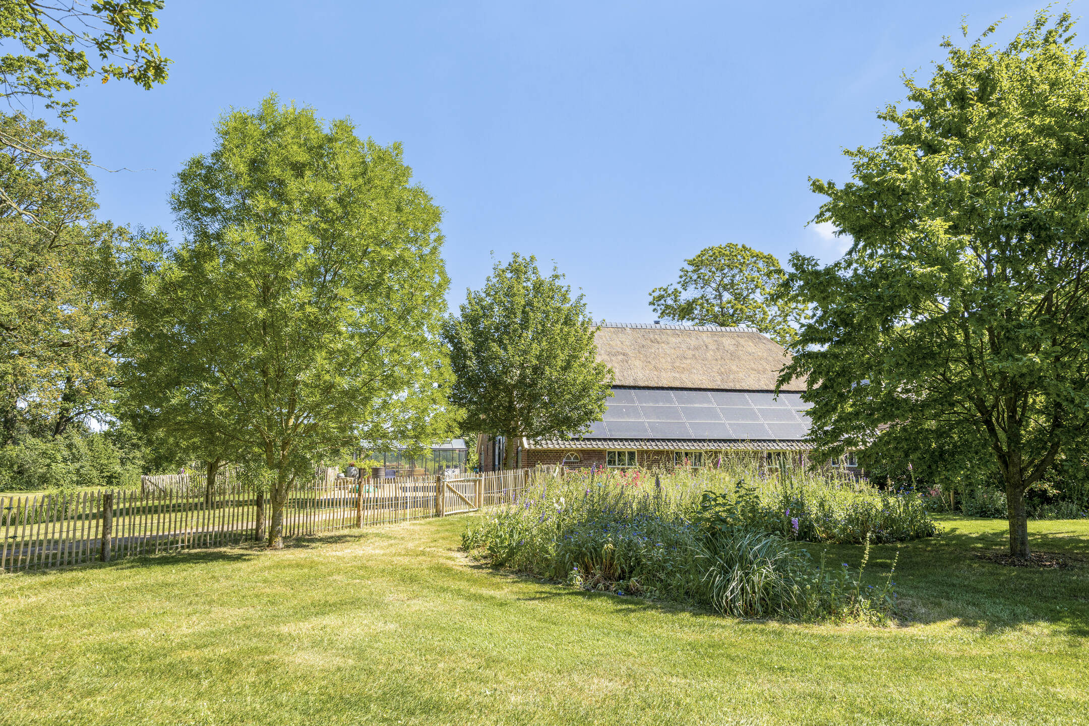 In front of the kitchen is the lovely sun terrace, with rose bed and yew hedge. Perfect for sunny lunches and dinners, or just lounging all day in the lounge set.