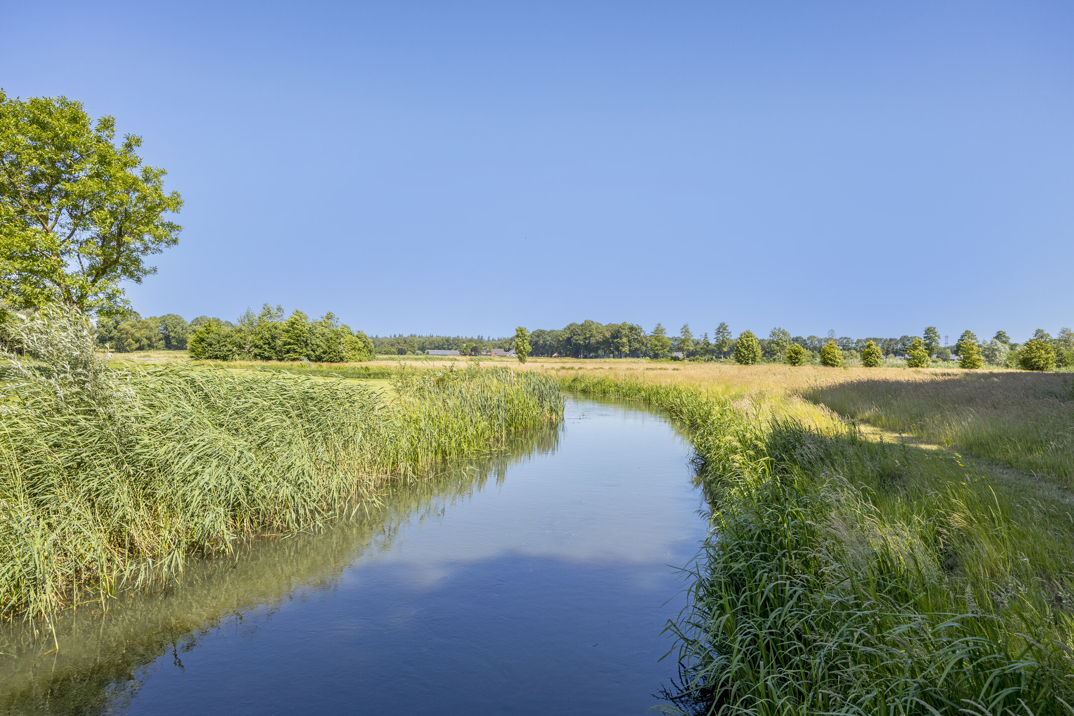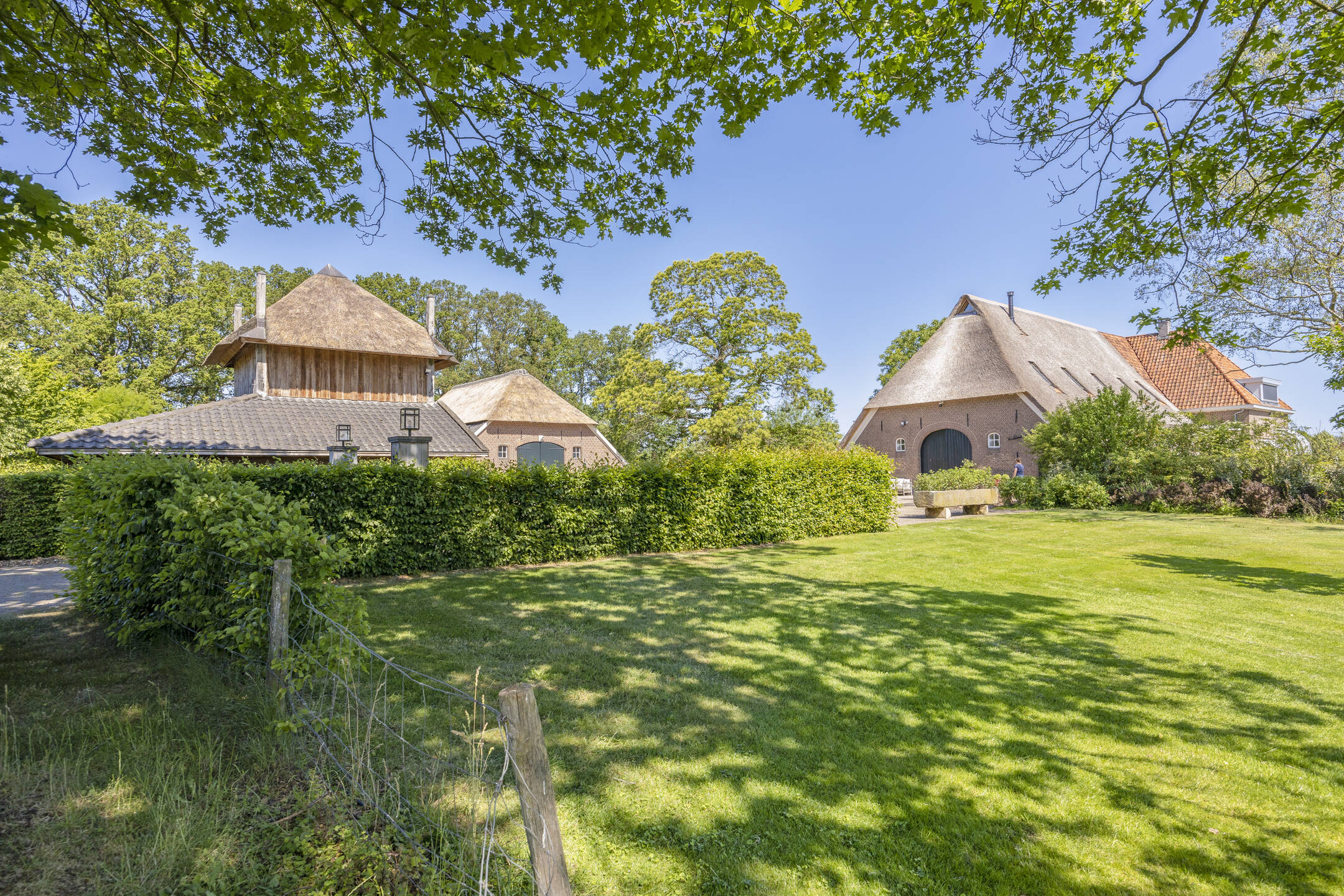 When an agency like Eelerwoude gets involved in landscaping, you just know it's going to be okay. And so it did. The gardens around the house are once again bordered by the moat, through which the crystal-clear water of the Berkel gaily splashes. From the house, living is focused on the Berkel and the village beyond. On the right side you have a view of the beech forest, where you can go via the little bridge to take a walk; between the trees is a path.
