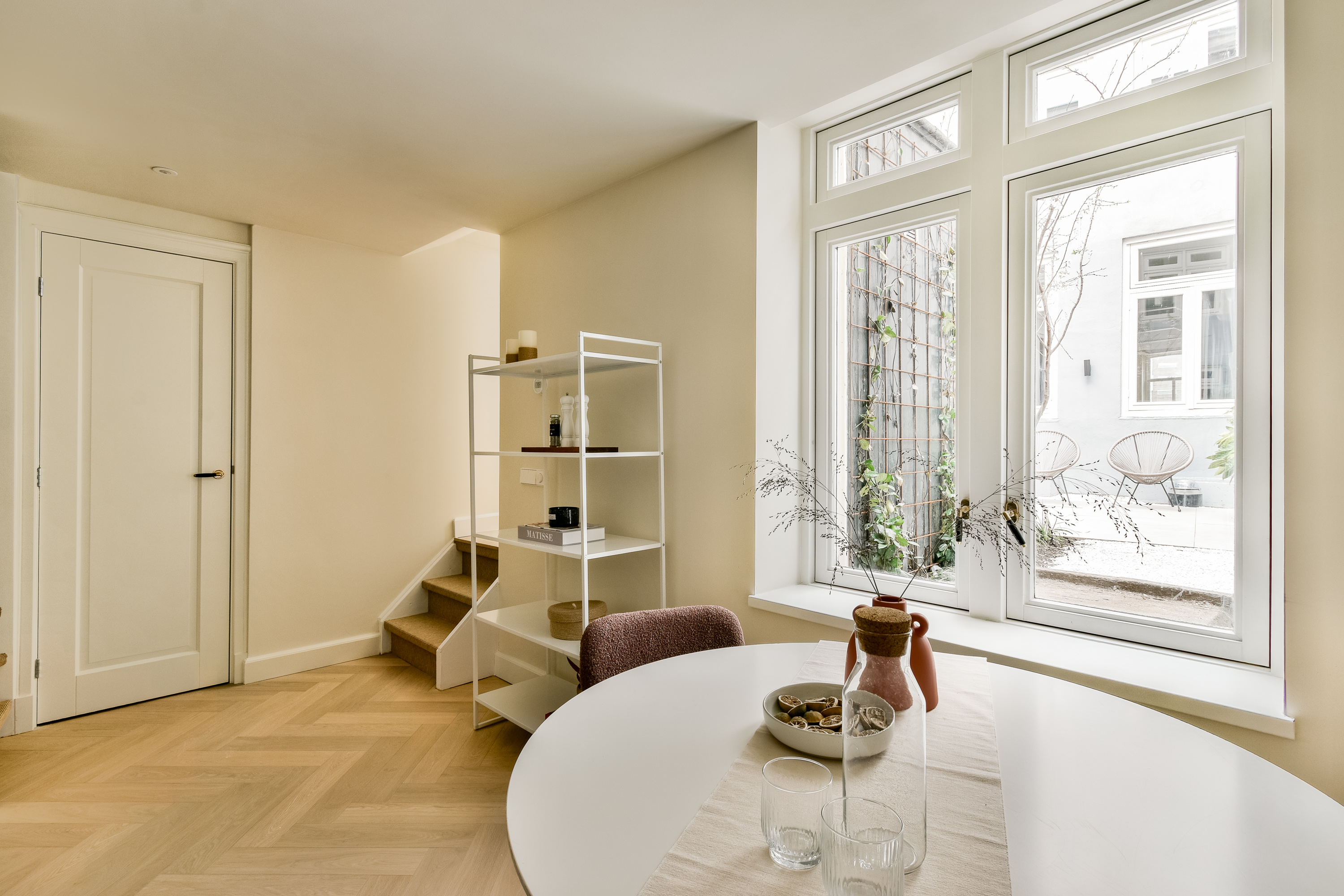 The entrance is located on the ground floor. Here you step into a bright and spacious living area, where a generous lounge and dining space seamlessly blend together. The modern open kitchen connects the two areas and is fitted with a cooking island and high-quality built-in appliances—a true eye-catcher for cooking enthusiasts. From the dining area, large French doors open onto the charming (inner) garden, a sheltered private retreat in the heart of the home, away from the city bustle. Here, you can enjoy a wonderful indoor-outdoor living experience. At the rear, there is an additional room, accessible both from the garden and via the hallway next to the dining room. This space features a second kitchen and therefore offers numerous possibilities, such as a home office, guest accommodation, or hobby room. Ample built-in cupboards on this floor ensure sufficient storage space.