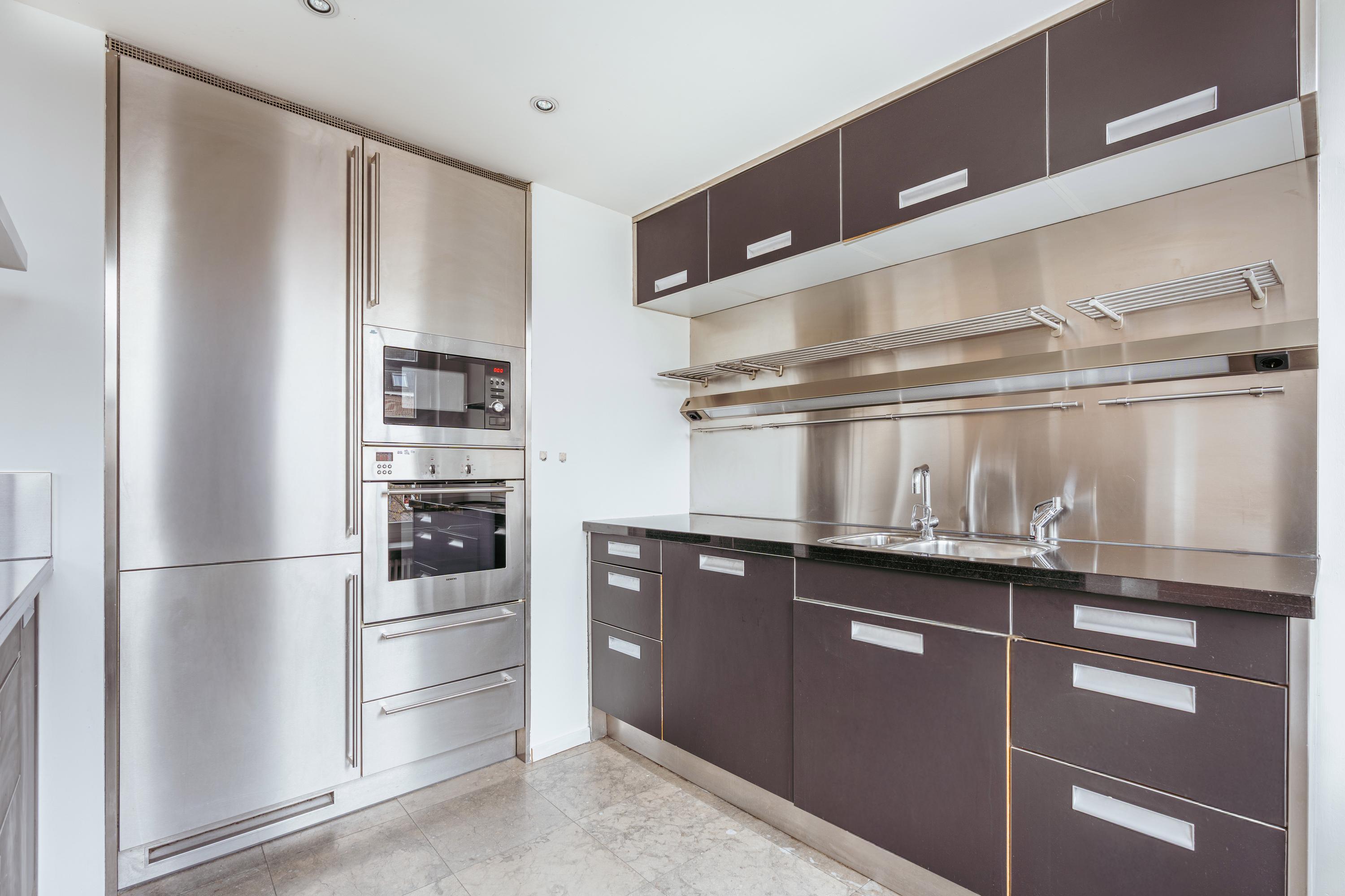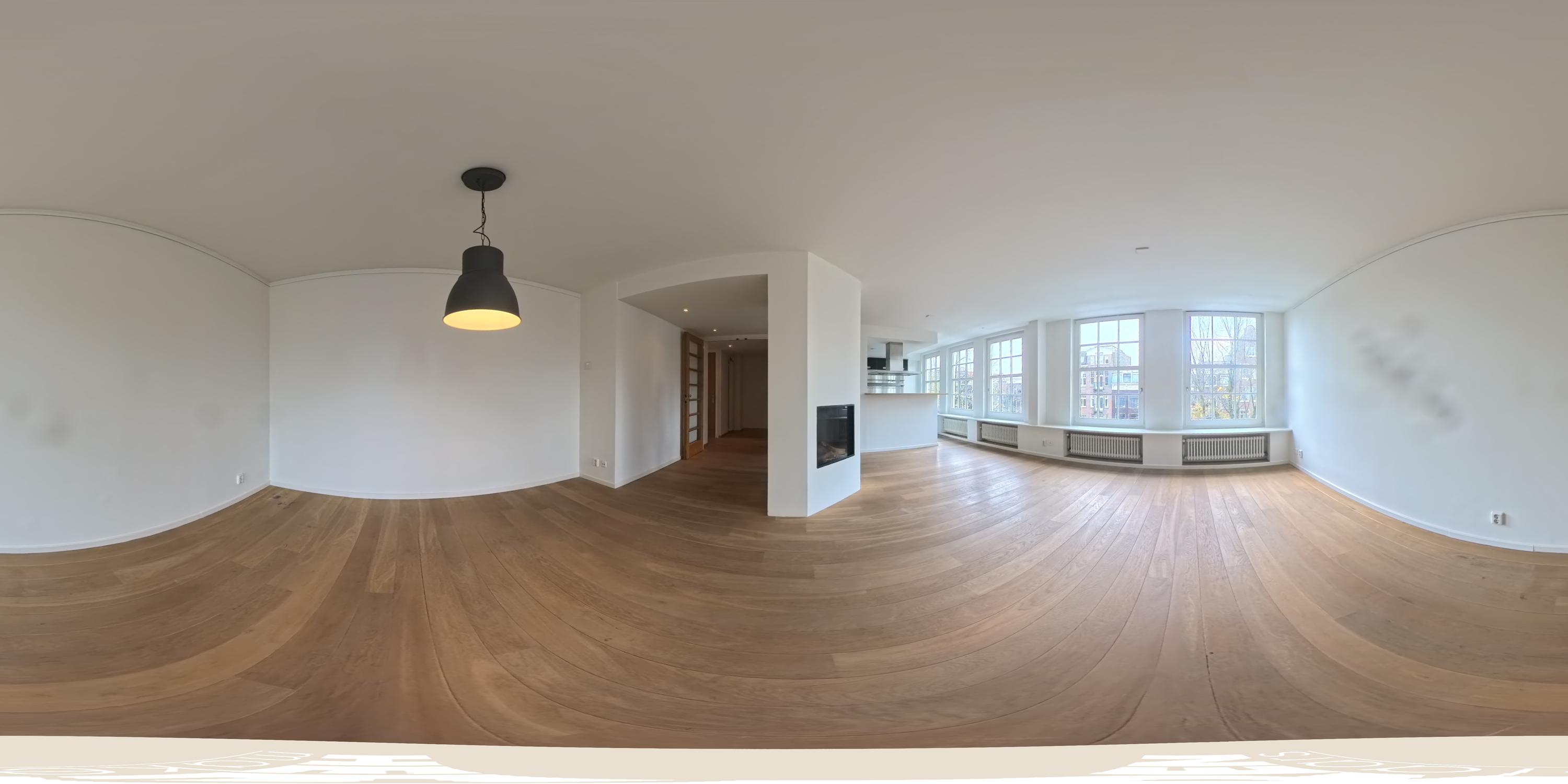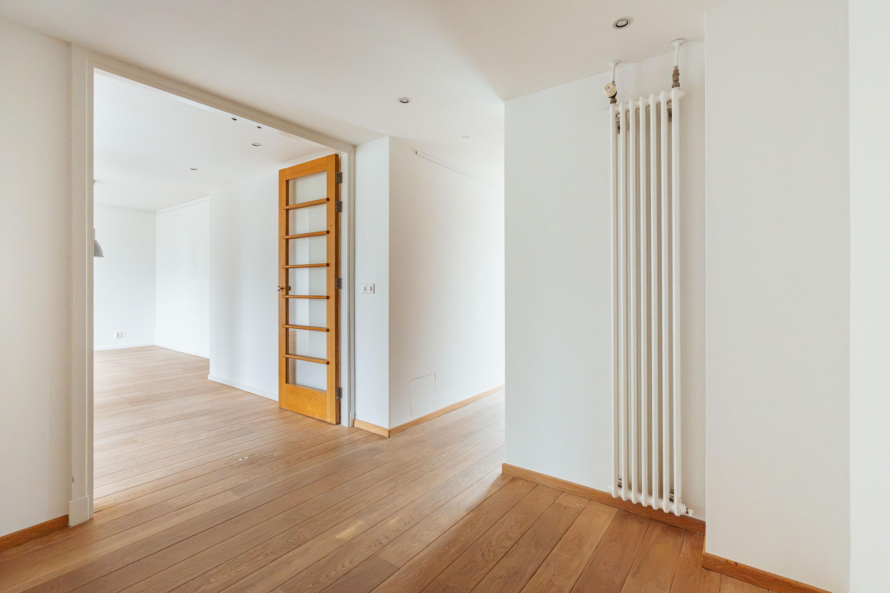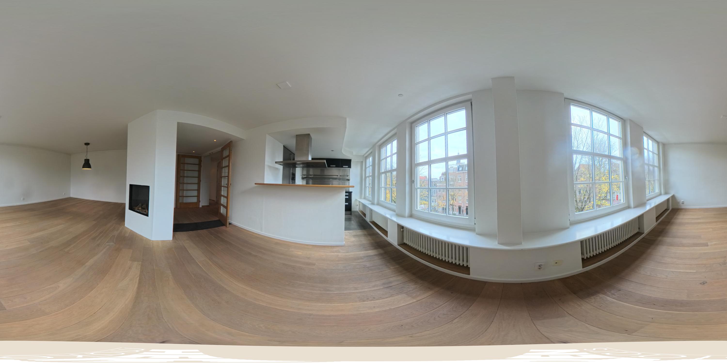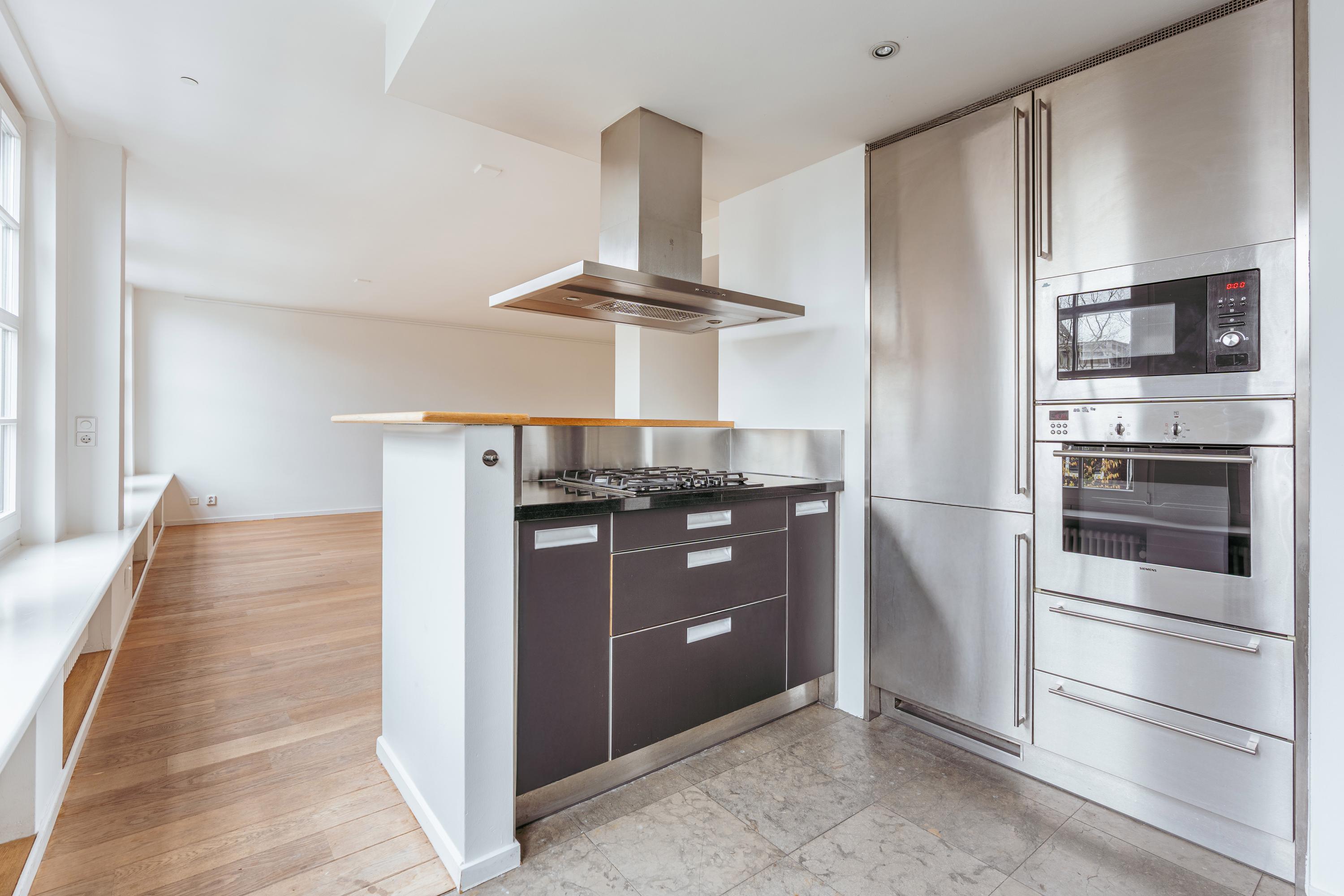 Via the communal staircase you reach the entrance of the apartment on the second floor. You are welcomed into a spacious hallway that provides access to nearly all rooms. At the front of the property lies the generous living room, which, together with the adjoining kitchen, is distinguished by no fewer than five large south-facing windows. This continuous expanse of glazing allows for exceptional natural light and offers a beautiful, wide view over the Egelantiersgracht a rare feature in this part of the Jordaan. The atmospheric gas fireplace serves as a warm focal point, enhancing the inviting character of the living area. The kitchen, also located at the front, features a convivial bar and is equipped with a dishwasher, Quooker tap, sink, oven, microwave, refrigerator, freezer, and ample storage space. It is a practical and welcoming environment for those who enjoy cooking and entertaining. At the quiet rear of the apartment are two well-sized bedrooms of similar dimensions. The larger bedroom includes three built-in wardrobes, and both rooms benefit from pleasant daylight and peaceful views. Centrally positioned in the apartment is the bathroom, fitted with a bathtub, separate shower, and double washbasin with cabinet. The separate toilet is accessed from the hallway. The apartment further offers a practical storage space that accommodates the washing machine and dryer connections.