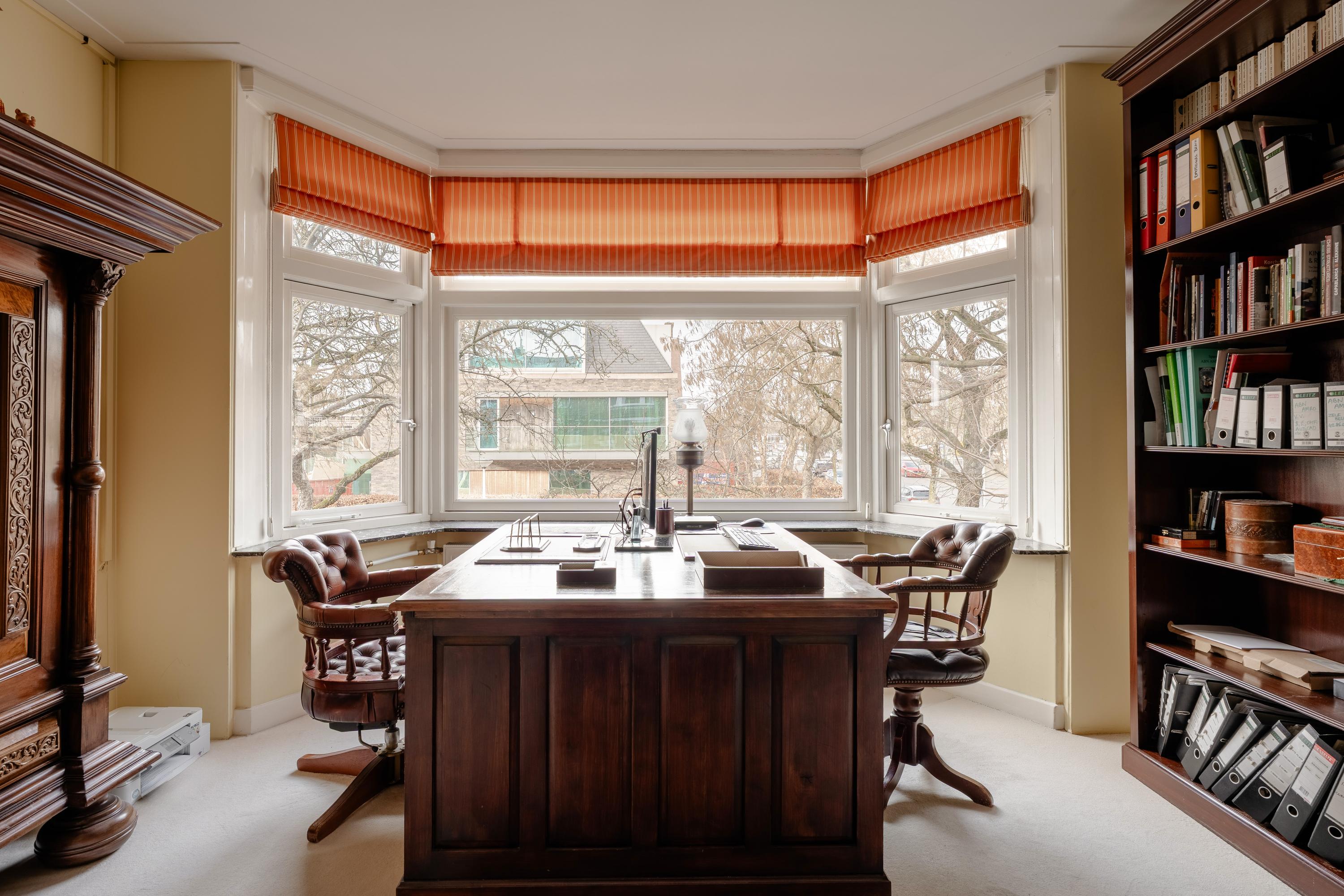This floor is characterised by beautiful original stained-glass windows and an elegant parquet floor with border. At the front of the house is the spacious and bright en-suite living room with fireplace, creating a warm and inviting living space.
