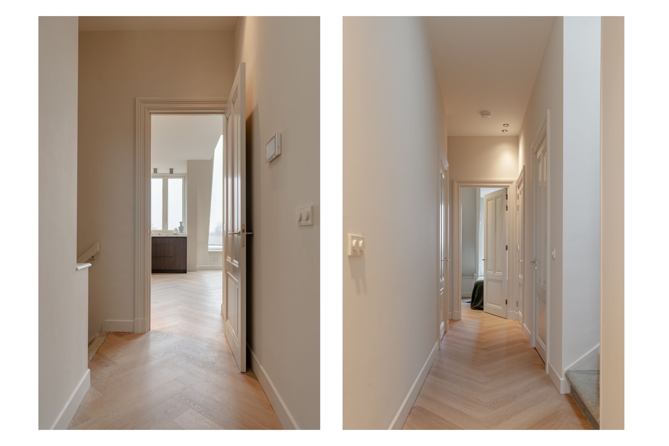 This luxurious apartment is located on the fourth floor and is characterised by a spacious and light-filled design, featuring high ceilings and striking, angled skylights at the rear. These large windows give the apartment a distinctive character and provide exceptional natural light throughout the day, along with open, green views across the city. The living room and kitchen are situated at the rear of the apartment and together form one generous living space. The unique roof structure, combined with the large skylights, creates an open and architecturally interesting atmosphere with abundant daylight and attractive sightlines. There is ample space for both a comfortable seating area and a large dining table. The luxurious kitchen is finished in a sleek and timeless design and integrates seamlessly with the living area. It is equipped with an induction hob, sink with Quooker, combi oven, climate cabinet, dishwasher, separate refrigerator and freezer, and offers generous workspace and storage capacity. At the front of the apartment are two well-proportioned and quietly located bedrooms. The master bedroom features an en-suite bathroom fitted with a walk-in shower and a double washbasin with vanity unit. Centrally located on the landing is the second bathroom, also equipped with a walk-in shower and a washbasin with vanity unit. In addition, there is a separate toilet and practical built-in storage. The roof terrace is accessible via an internal staircase. This spacious terrace offers a high level of privacy and has been structurally prepared for the installation of a jacuzzi, including a double electrical group. Provisions have also been made for an outdoor shower (water connection) and for the installation of an outdoor kitchen (water and electricity connections), making this outdoor space a valuable extension of the living comfort.