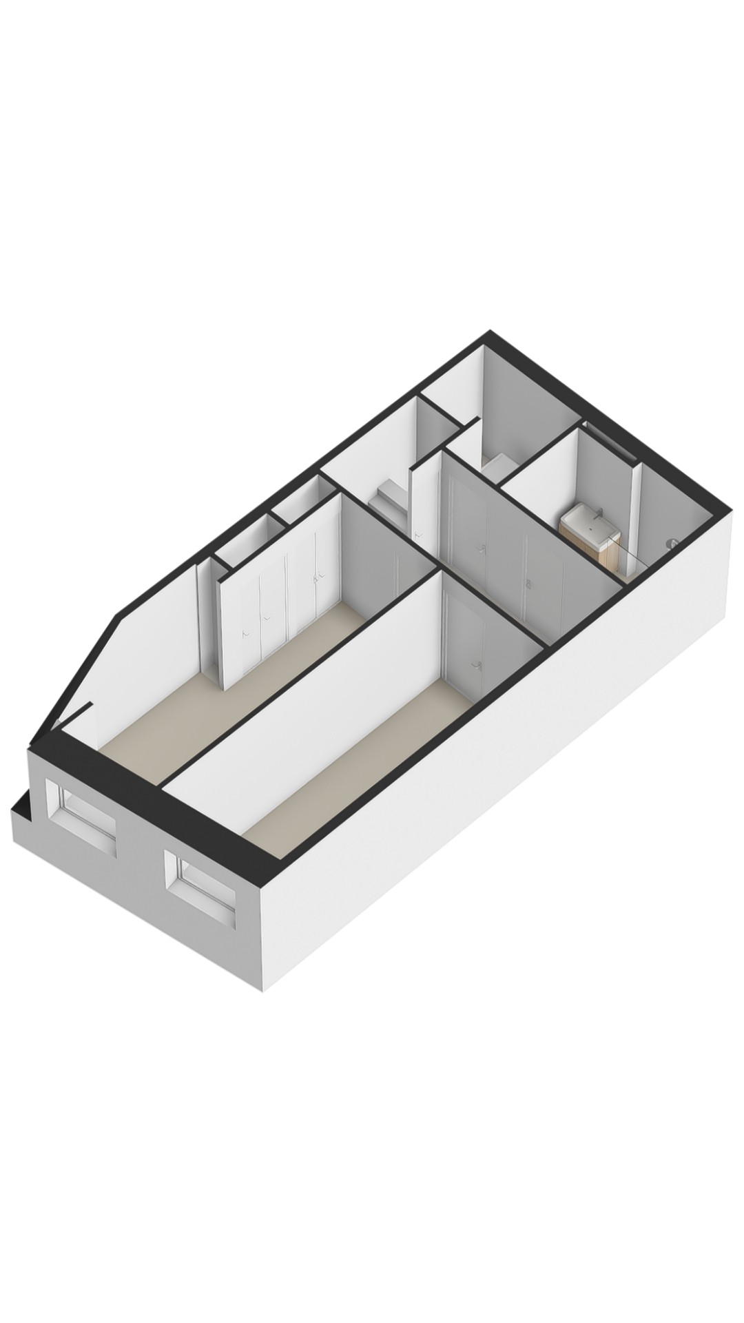 Spacious central hallway, utility room with washer/dryer setup in custom-built cabinetry (both AEG machines available for takeover), master bedroom with a high-end custom wardrobe by De Maatfabriek, second bedroom/guest room, modern bathroom with walk-in shower, second toilet, and washbasin. This level is ideal for sleeping or working, with ample natural light and windows that open in both bedrooms.