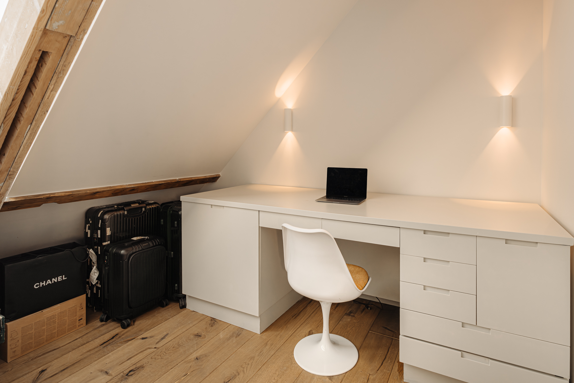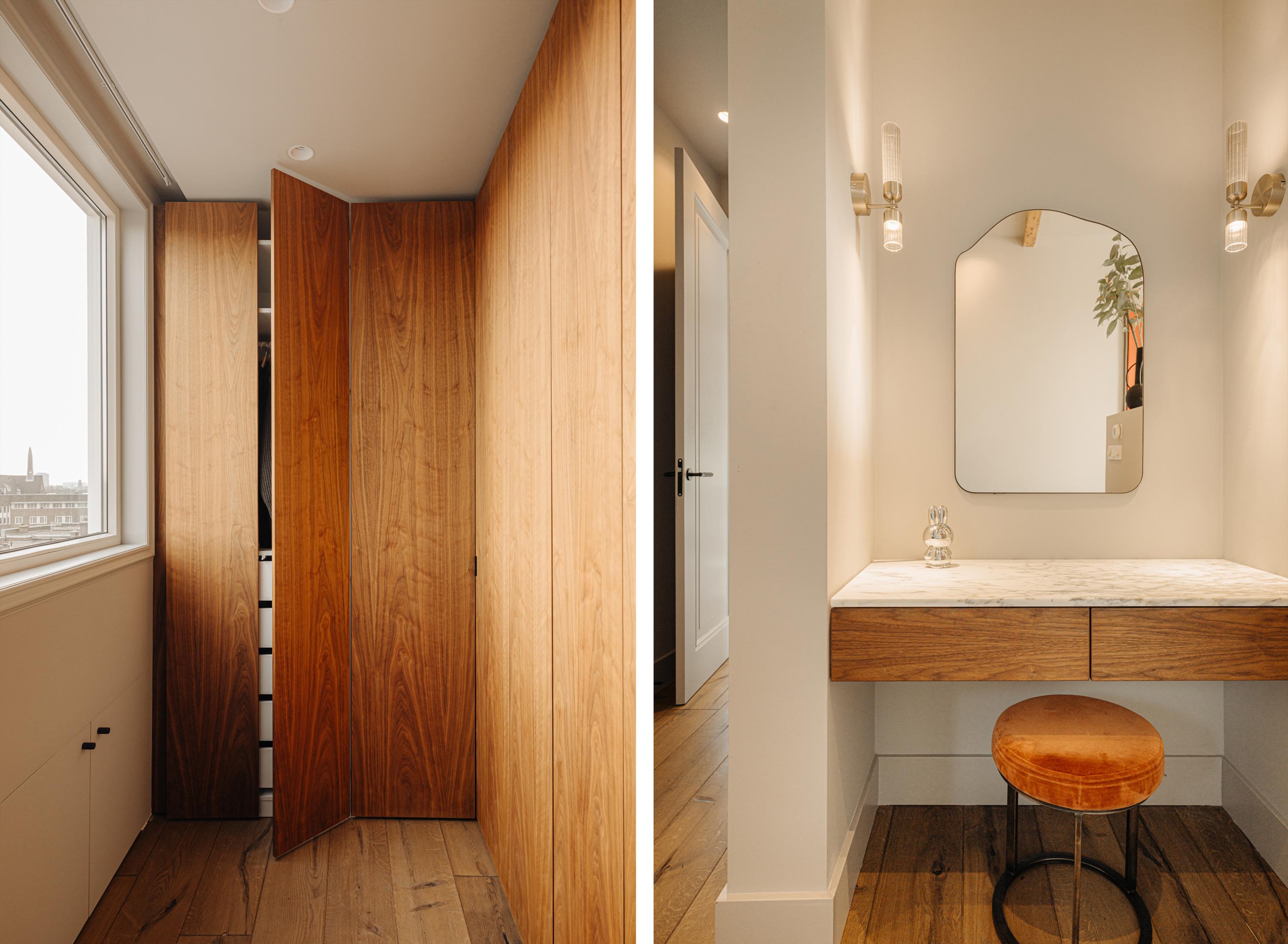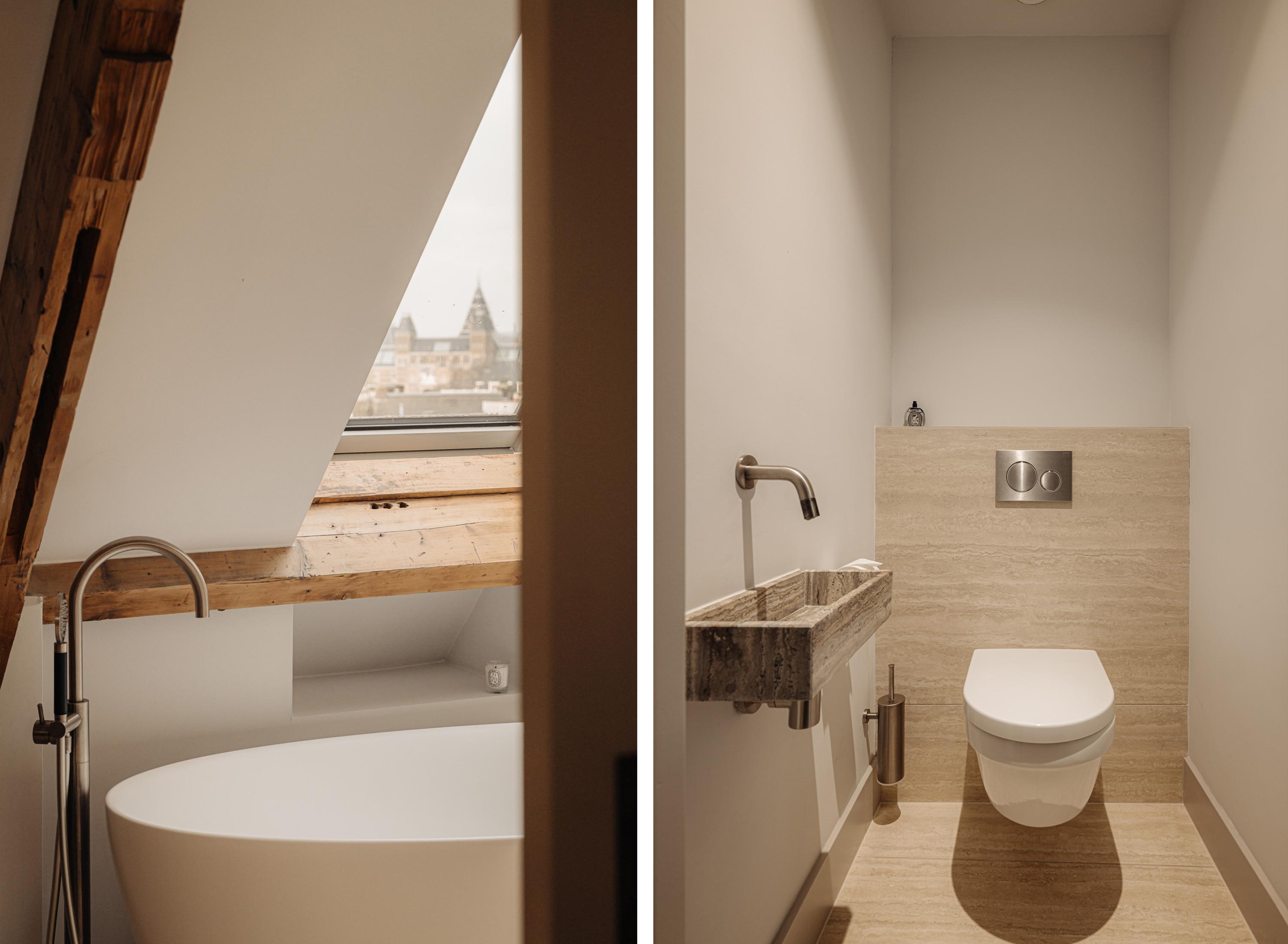 Upon entering, you immediately notice the spacious and light-filled design of the apartment. The living room features a charming south-facing balcony and large windows on both sides, allowing plenty of natural light and offering a panoramic view of the city. The visible wooden beams add character, while the elevated seating area creates a cosy space to relax. An air conditioning unit is installed above the kitchen, which boasts a large cooking island with a natural stone worktop and high-end built-in appliances, including a four-burner induction hob with extractor, a dishwasher, a fridge-freezer combination, a Quooker, and a built-in wine climate cabinet. A stylish raised bar area is integrated into the kitchen island. The dining area comfortably accommodates a large table, benefiting from ample natural daylight through the expansive windows.