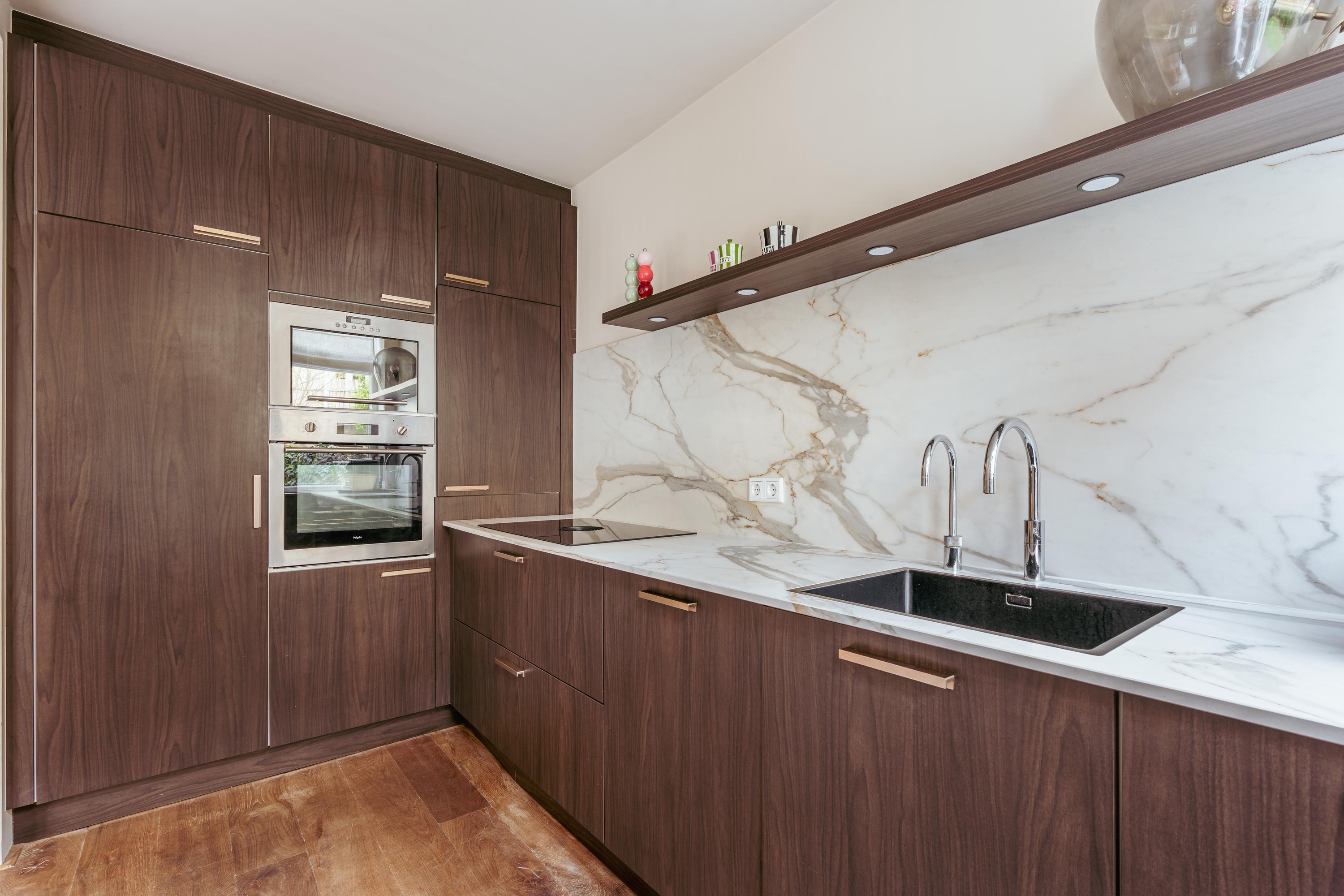 The open kitchen adjoins the dining room and is slightly elevated, creating a playful and spacious effect. The kitchen is finished in dark oak and equipped with floor-to-ceiling built-in cabinets and appliances, including a double oven, refrigerator, freezer, dishwasher, induction hob with integrated extraction, and a Quooker tap.