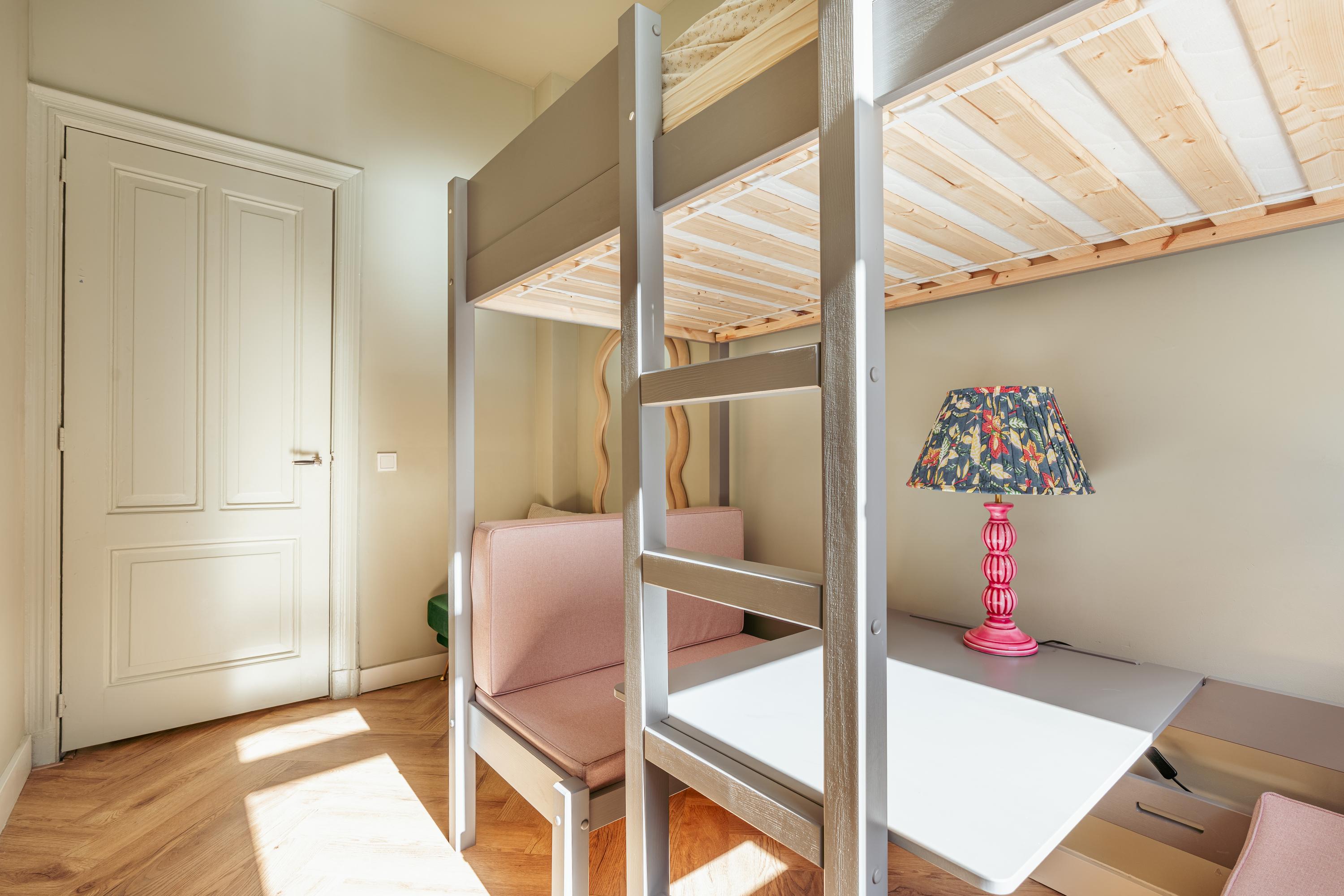 At the front are two bedrooms. The first is spacious and features a French balcony. The second room is ideal as a child’s room, office, or study. At the rear are two additional bedrooms, including a generous third bedroom with French doors leading to a balcony. This room has beautiful natural light, an authentic fireplace, and practical built-in cabinets. The fourth room is also perfect as a child’s room, office, or guest room.