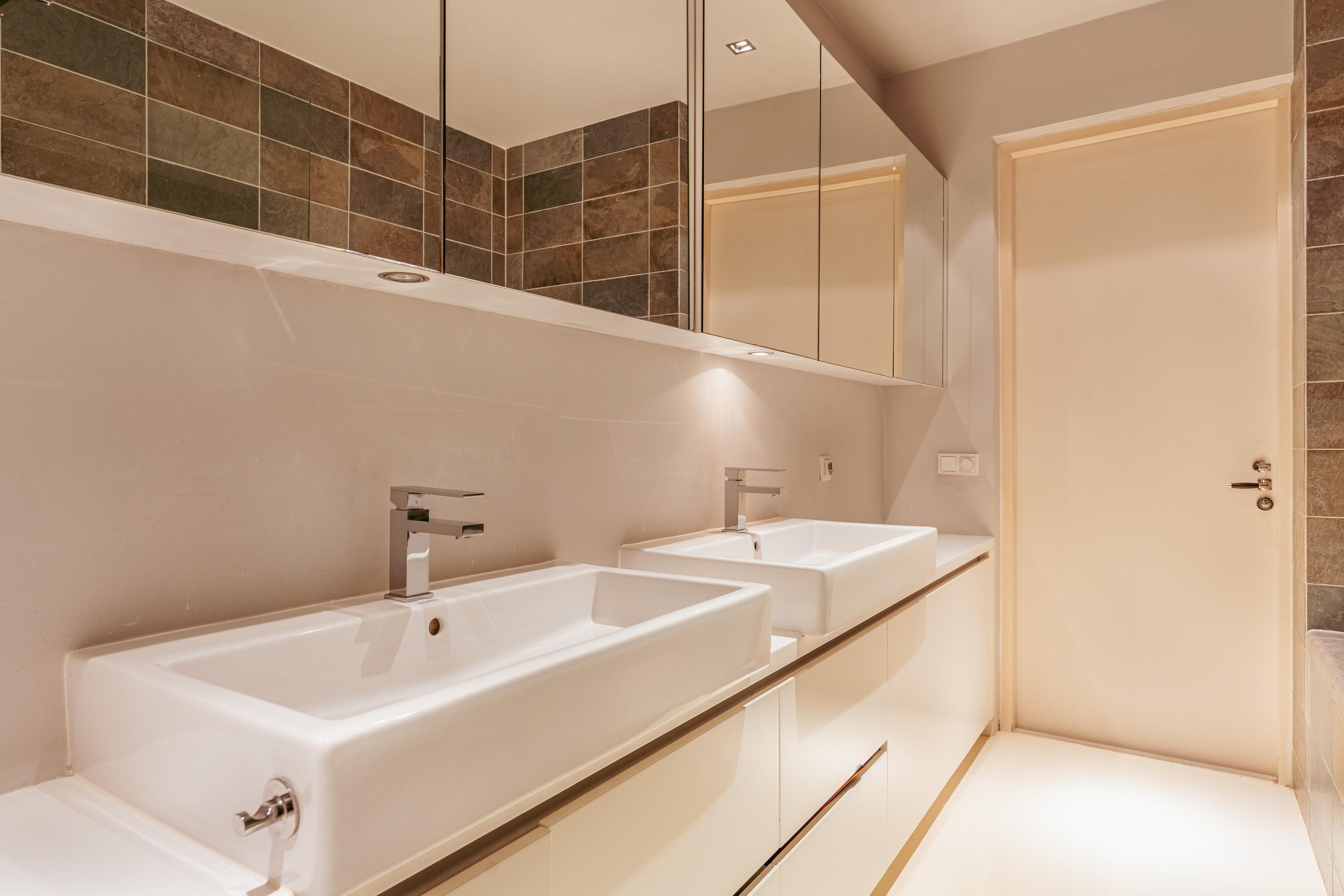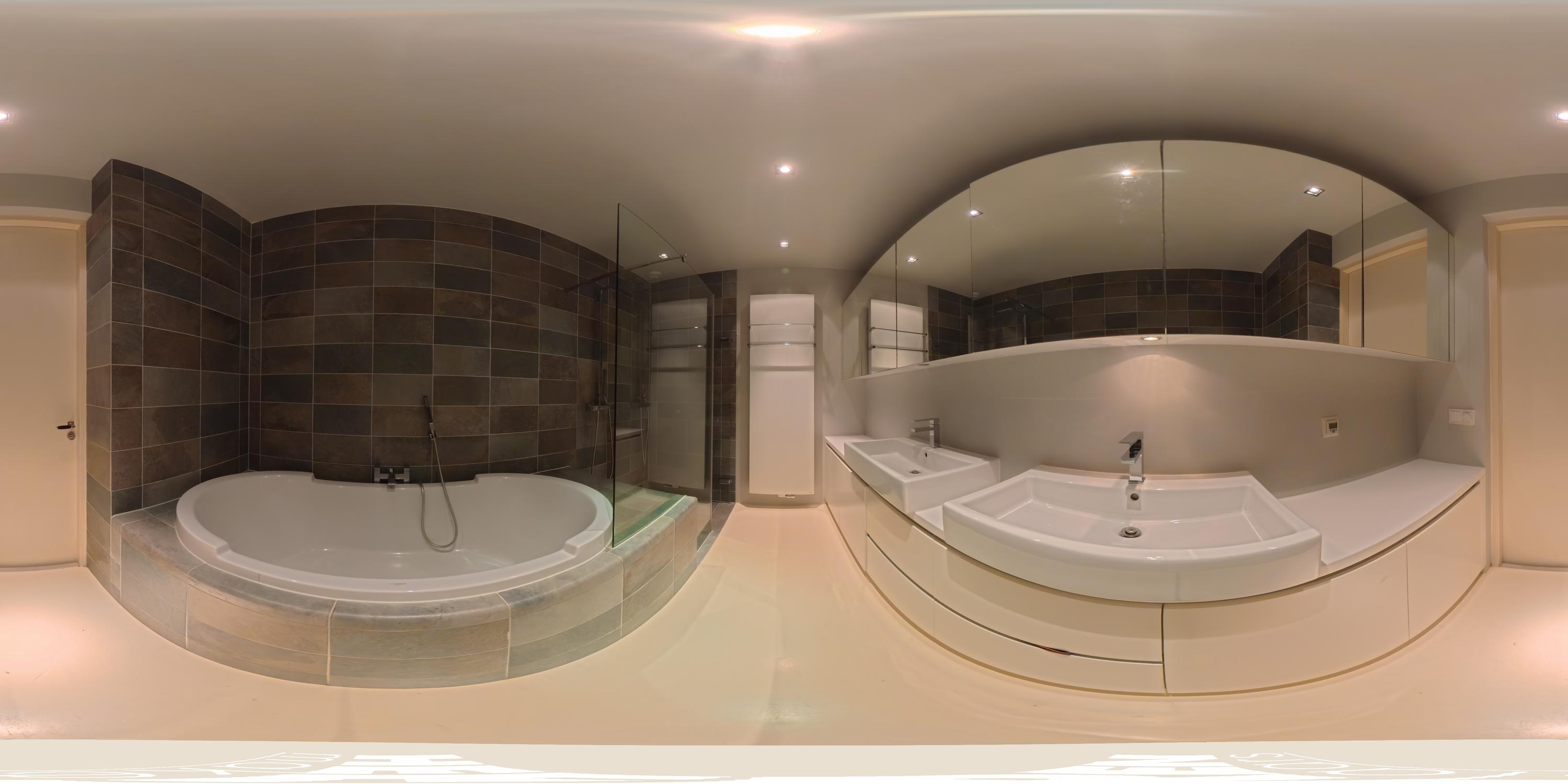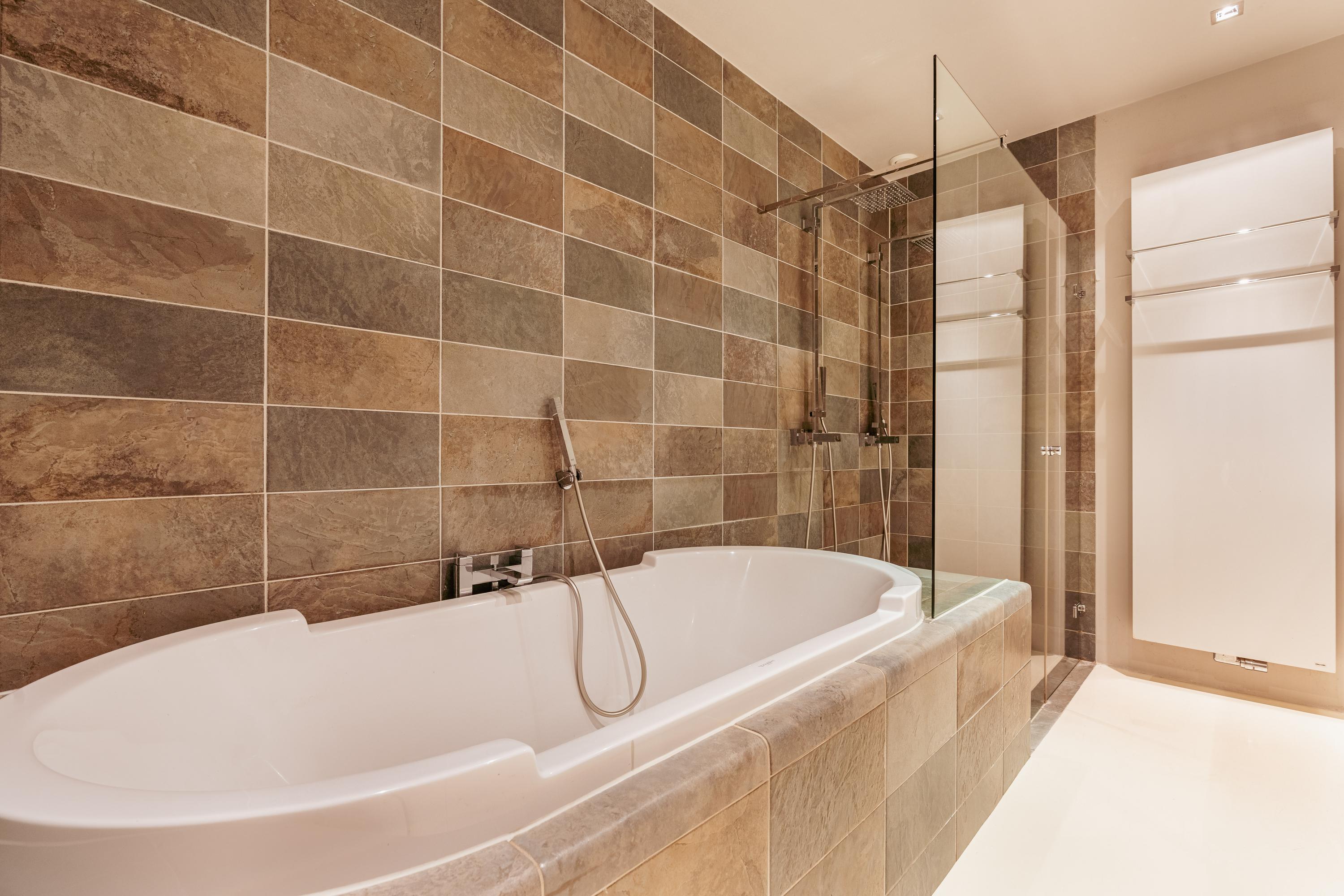 The bathroom is spacious and luxuriously finished, featuring a bathtub, a double walk-in shower, and a double washbasin with vanity unit.