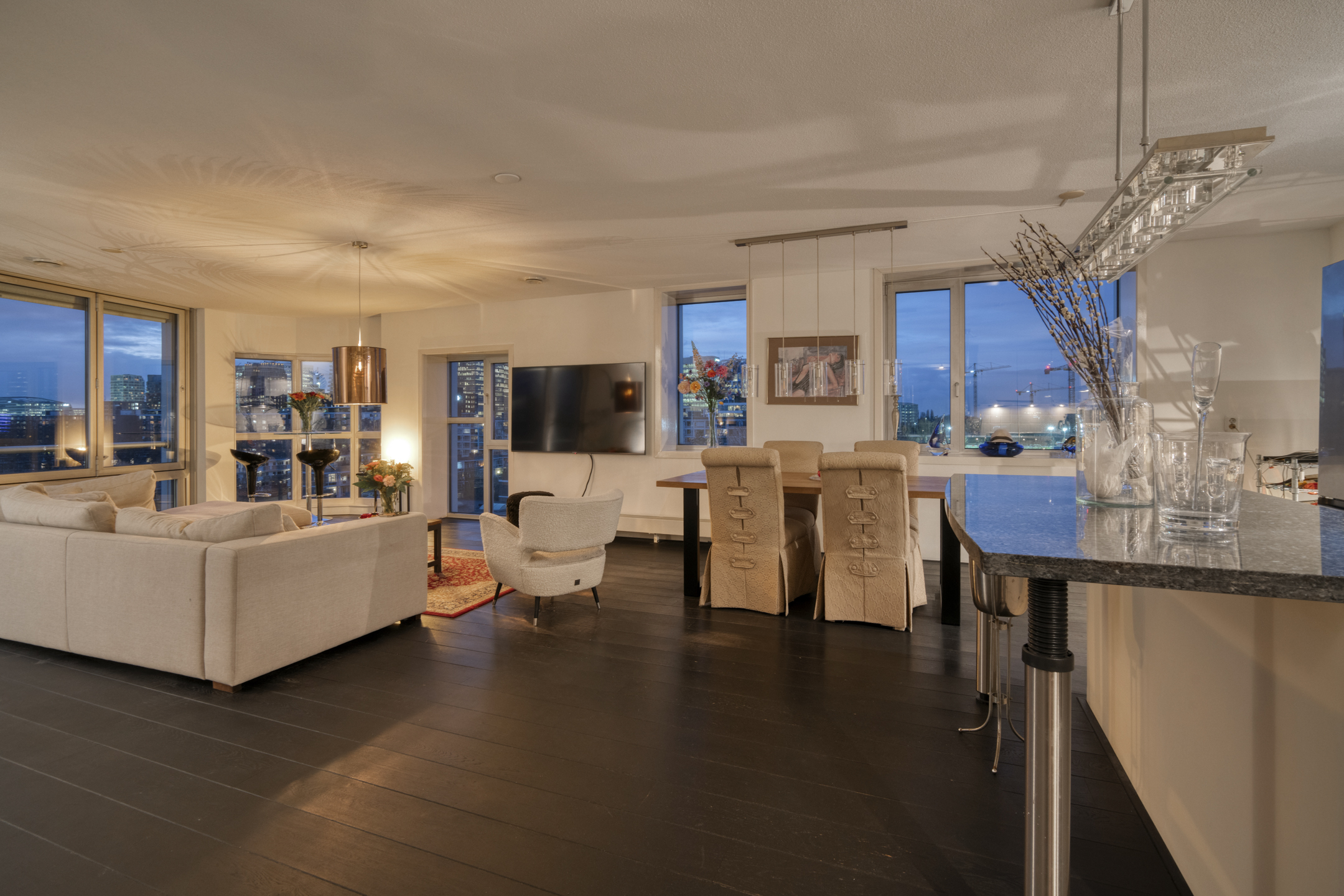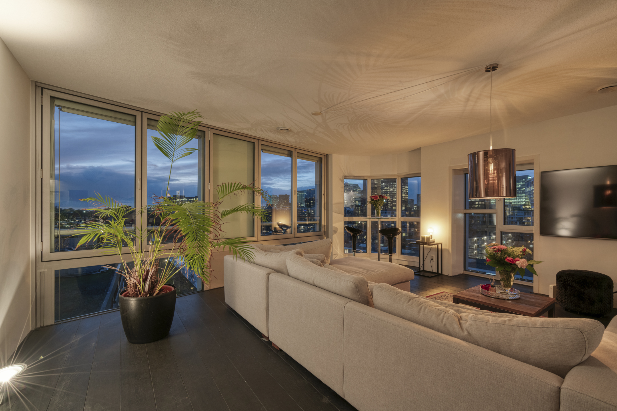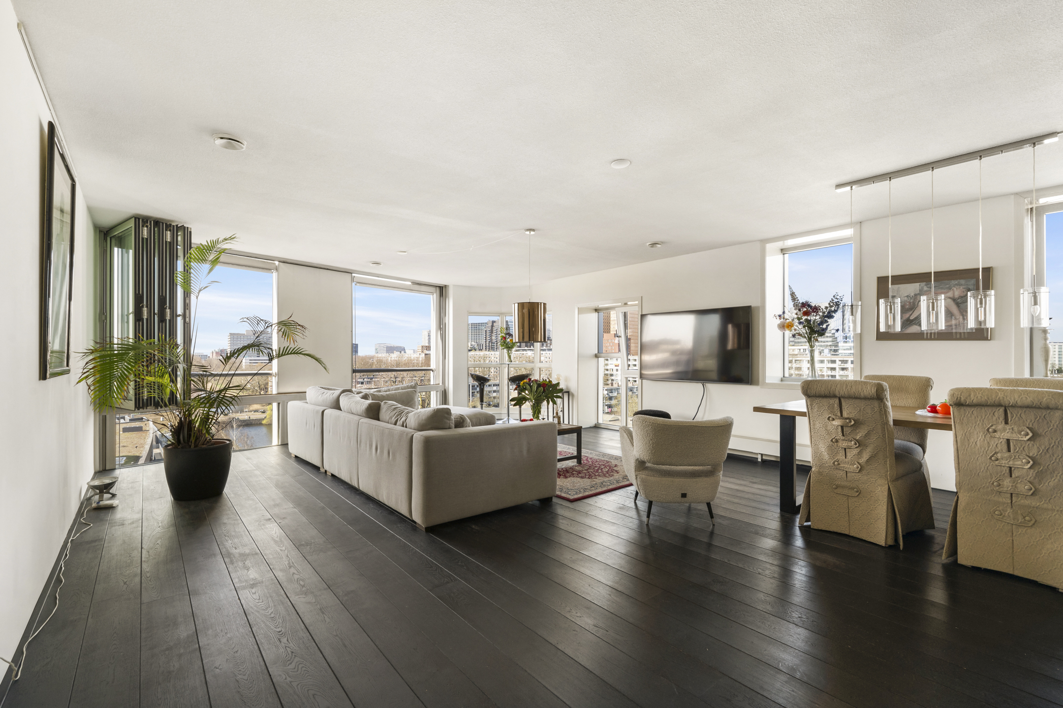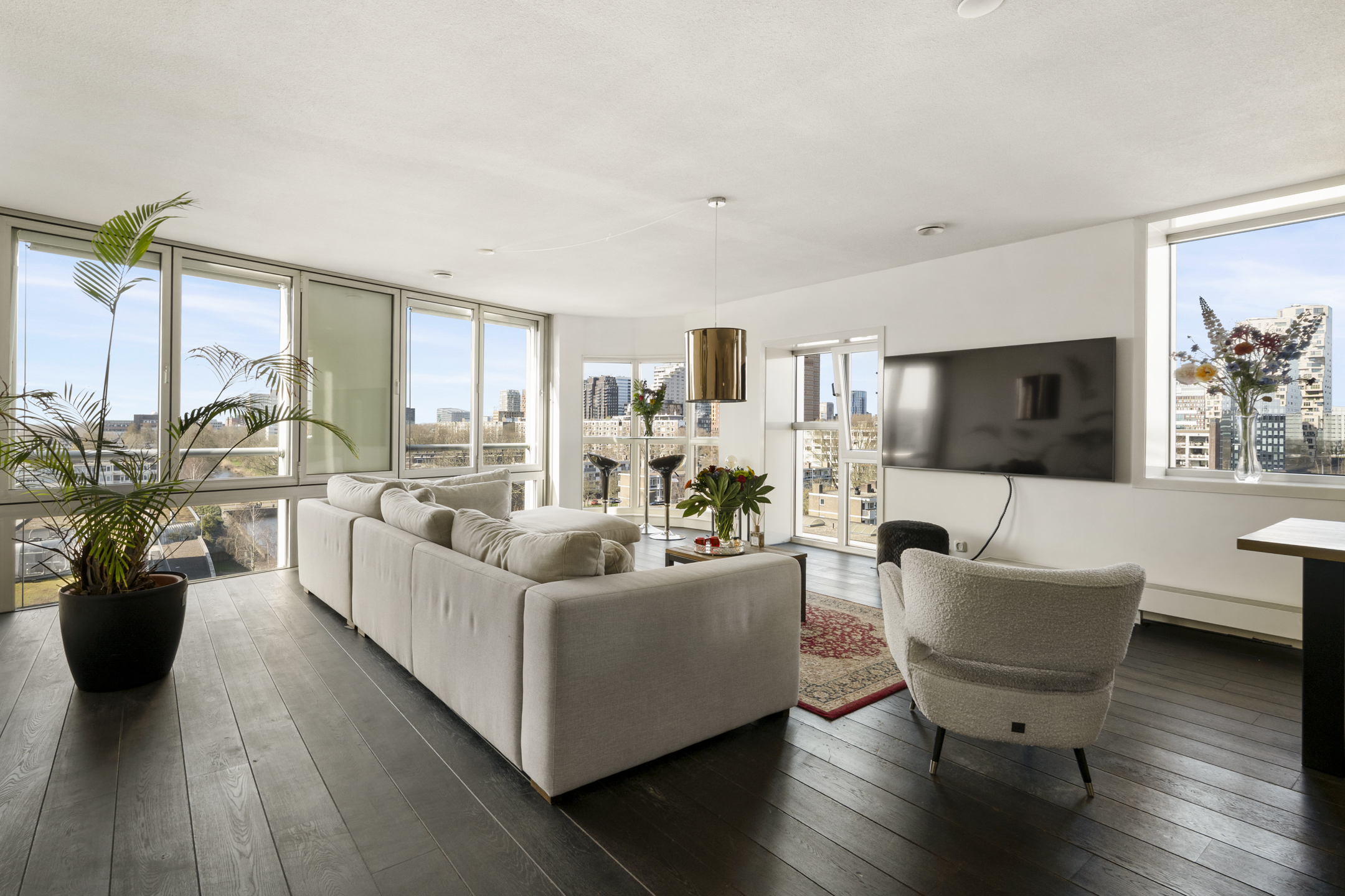 The living room is exceptionally bright due to the corner position and curved windows. Nearly the entire wall is made of glass, offering stunning views of the city and water.