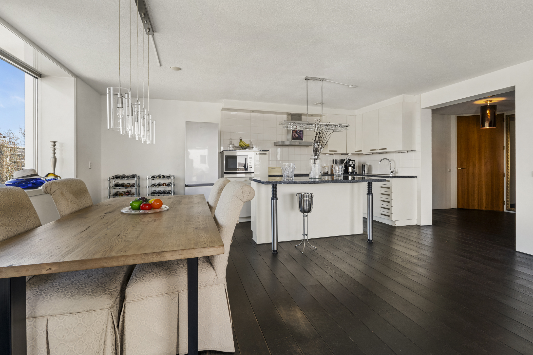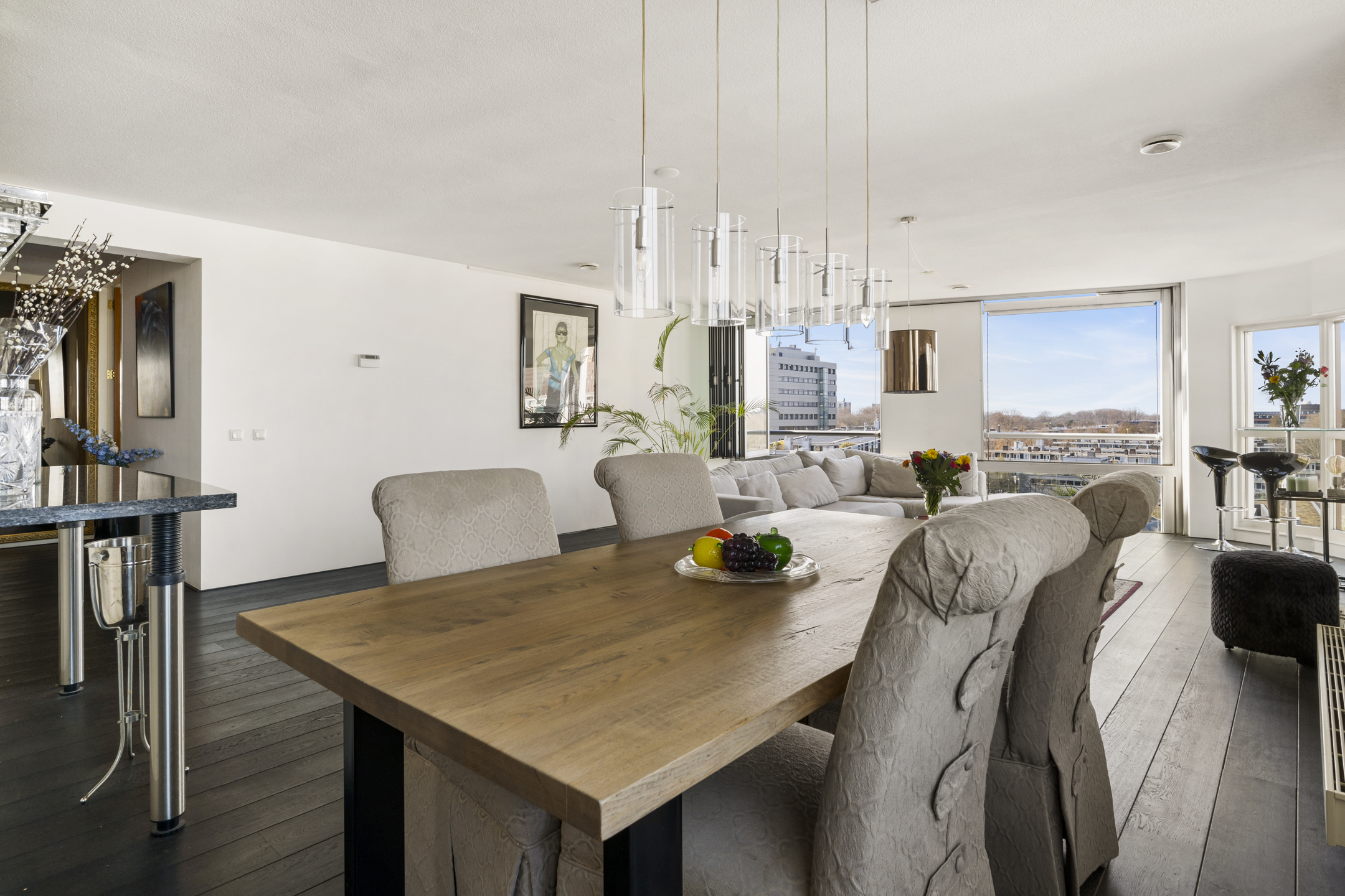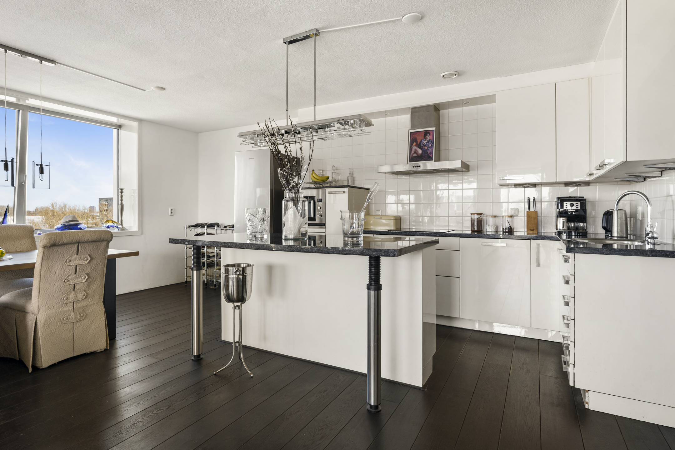 Thanks to its corner location, abundant windows on both the southwest and north sides, and the seventh-floor position, the apartment offers spectacular views of the water and the Zuidas skyline in Amsterdam.