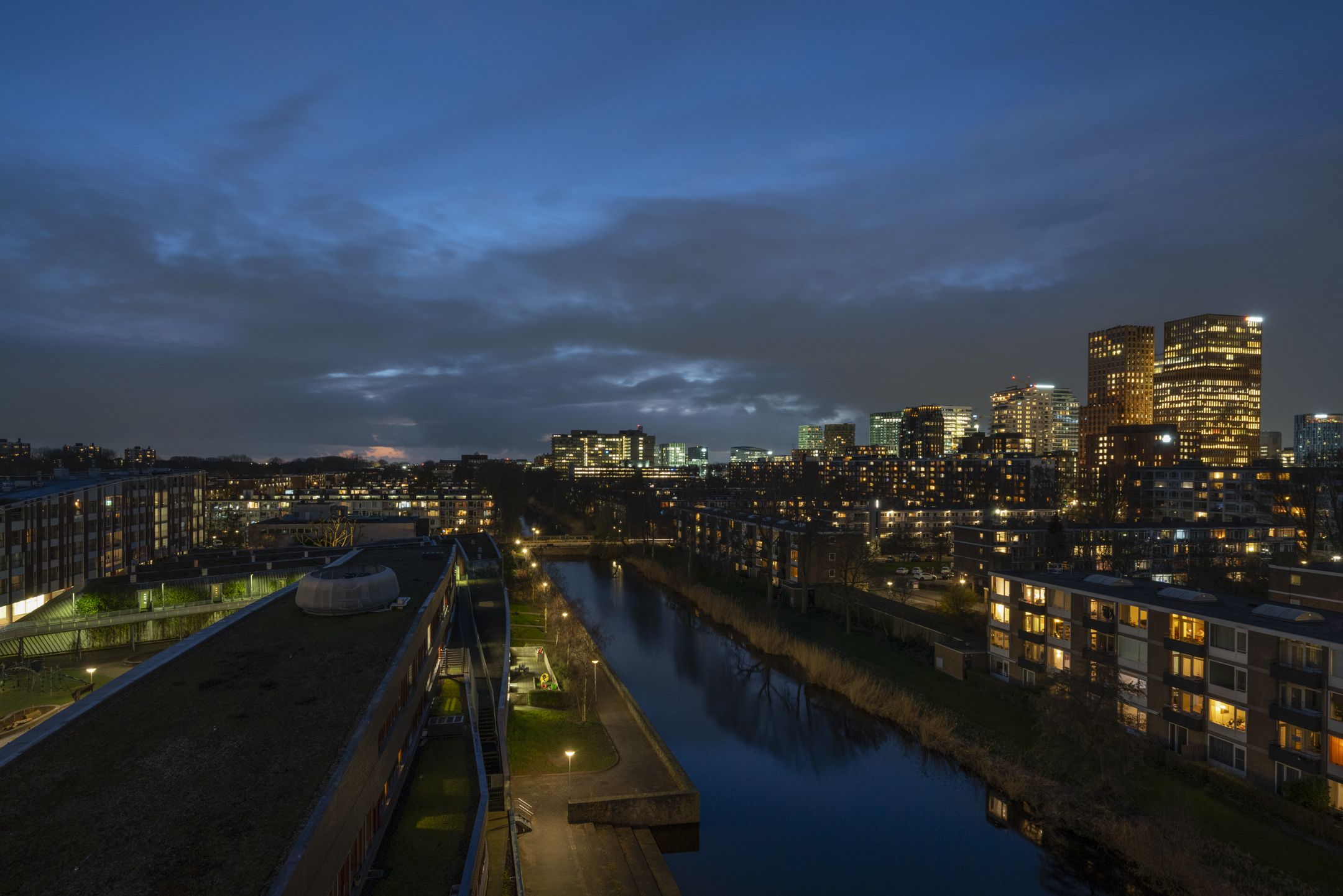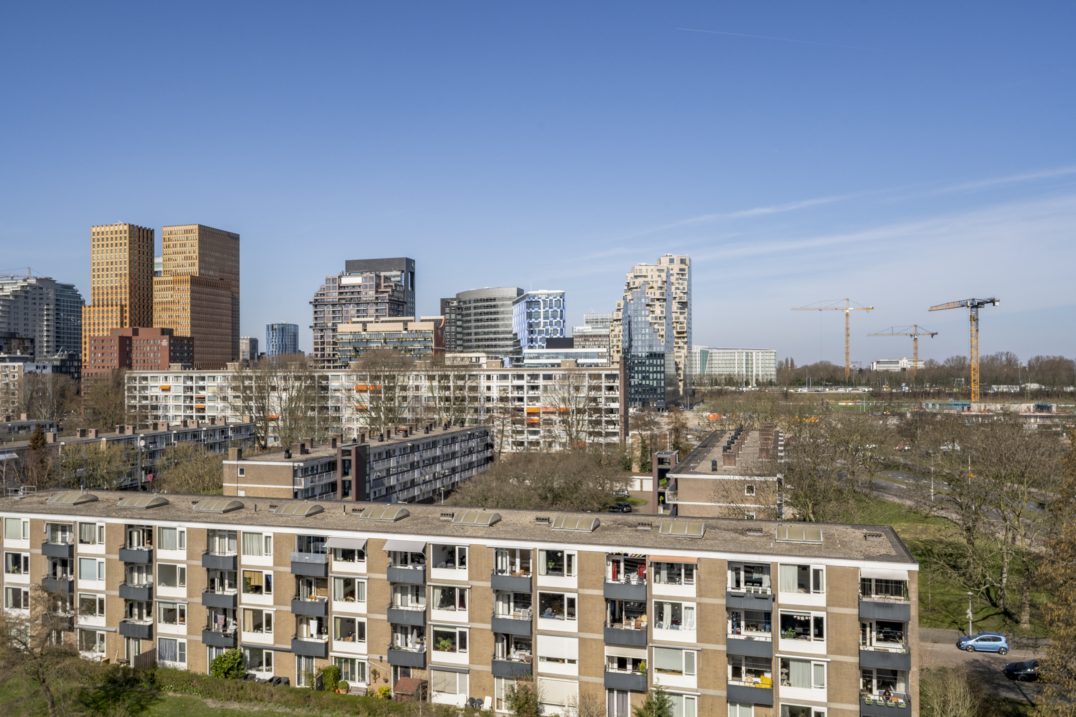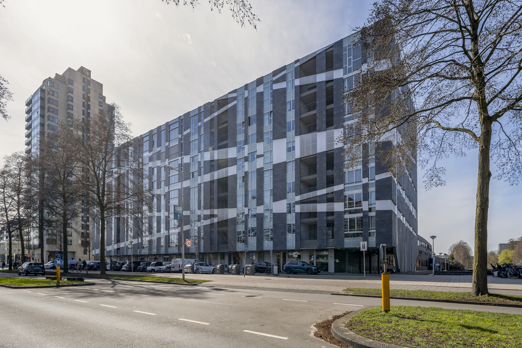 Luxurious three-room corner apartment of 117 m² with unobstructed views of the water and the Zuidas skyline, featuring two bedrooms, a high-end kitchen with cooking island, and an optional private parking space. The apartment is located on the seventh floor of the striking Gelderhof apartment complex, completed in 2004.