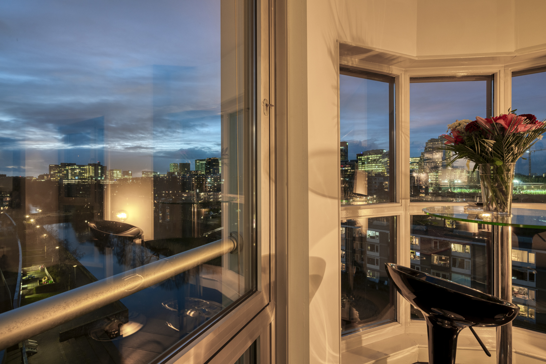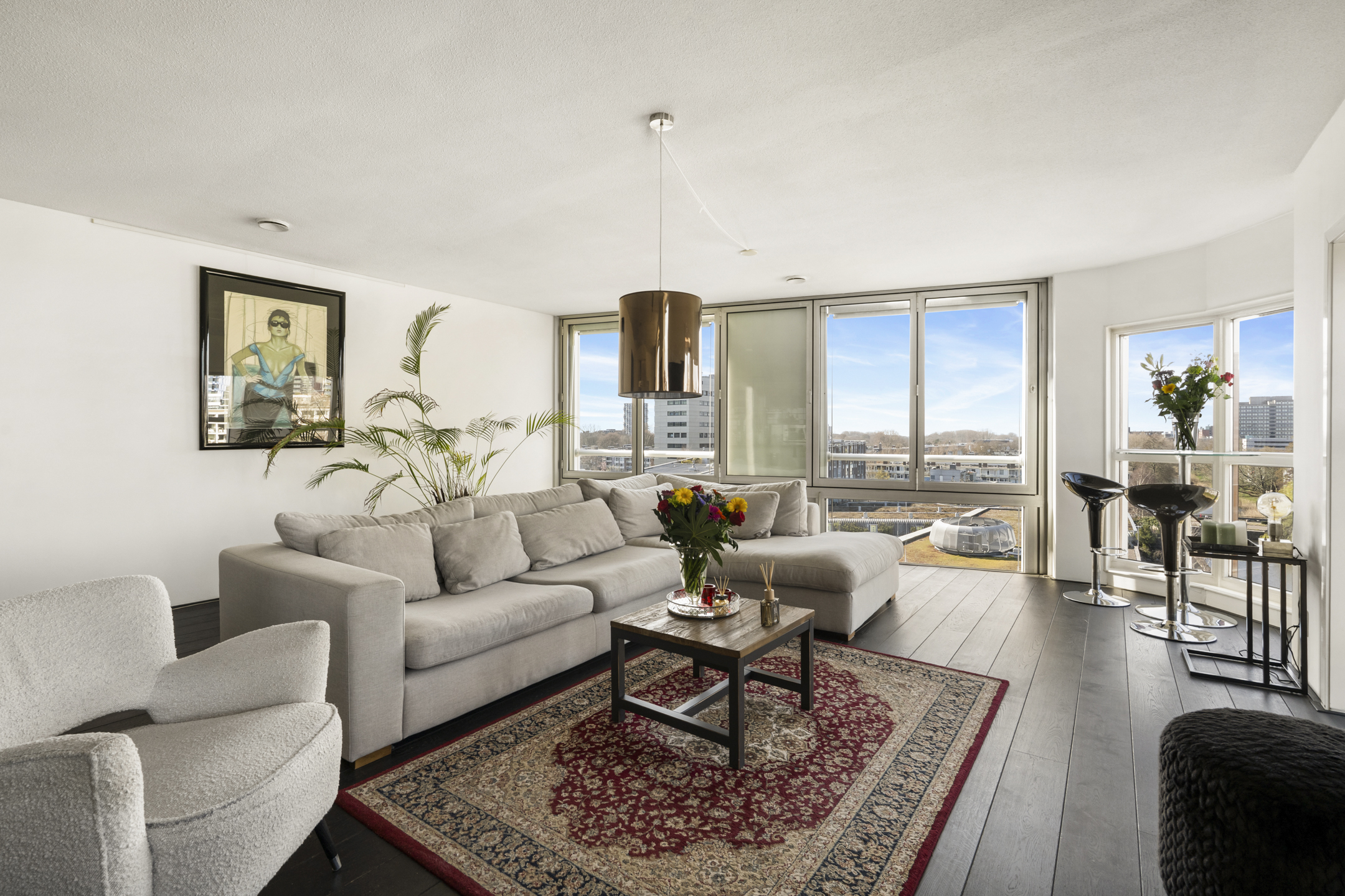 A sunny corner apartment on the seventh floor with panoramic views, privacy, and optional parking, in a prime location in Amsterdam.