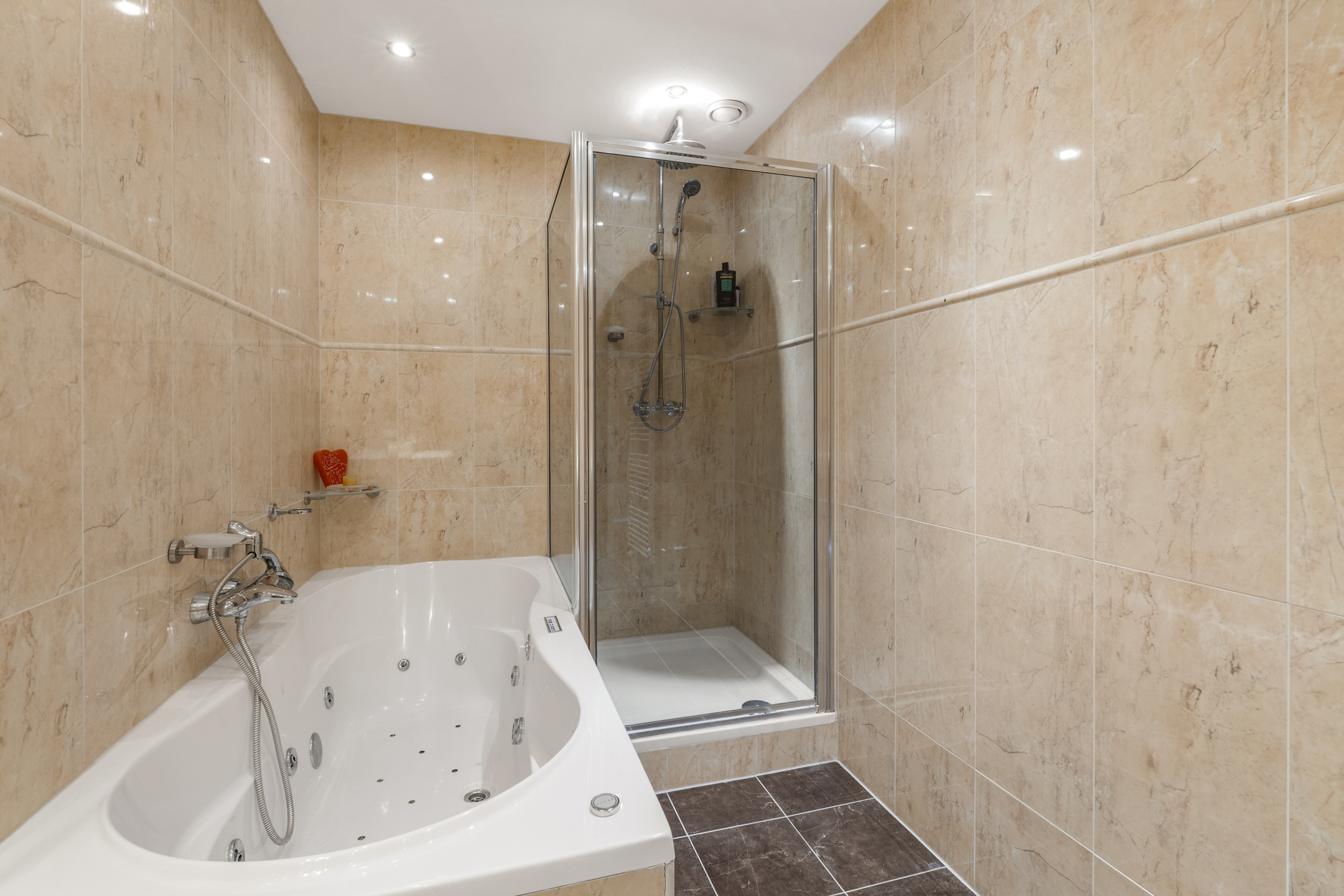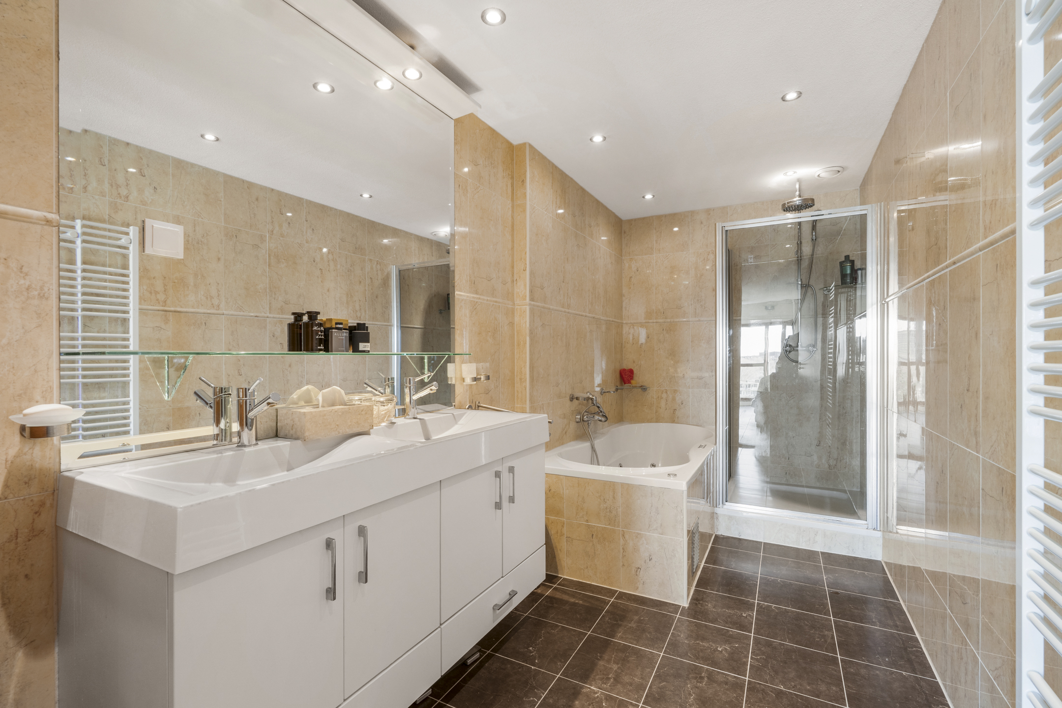 The bathroom is finished in light tones with beautiful tiling and features a double vanity unit, a rain shower, and a whirlpool bathtub.