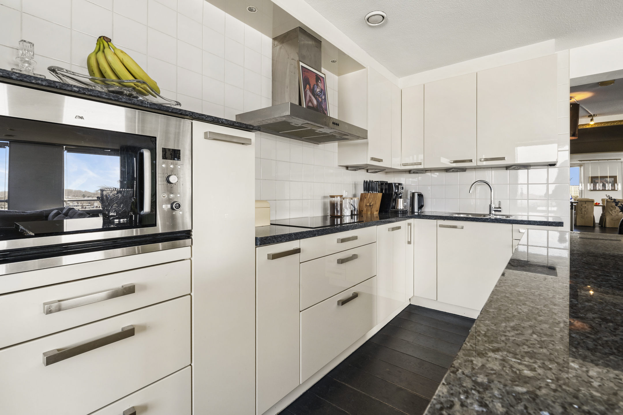 The luxury kitchen features a light color palette with a dark stone countertop and includes built-in appliances: gas cooktop with extractor, refrigerator, dishwasher, freezer, oven, and microwave. The entire apartment has solid oak parquet flooring.