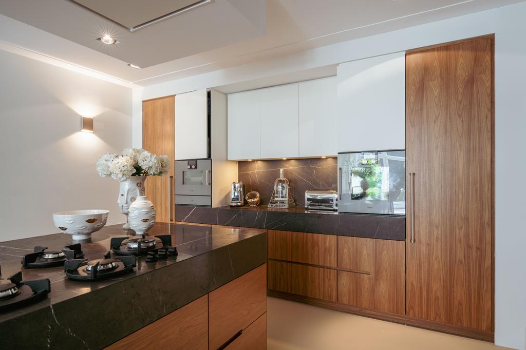 To the front is a bedroom with an en-suite bathroom featuring a washbasin and walk-in shower—currently used as a home gym, but easily repurposed. At the rear is the stunning open-plan kitchen, the centerpiece of this level. Outfitted with Gaggenau appliances, including a fridge, freezer, Quooker, five-burner gas stove integrated into the counter, oven, steam oven, dishwasher, and wine fridge, the kitchen combines luxury and functionality. A solid natural stone countertop with a wooden breakfast bar provides a warm, refined look.