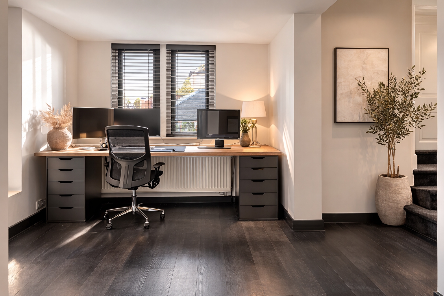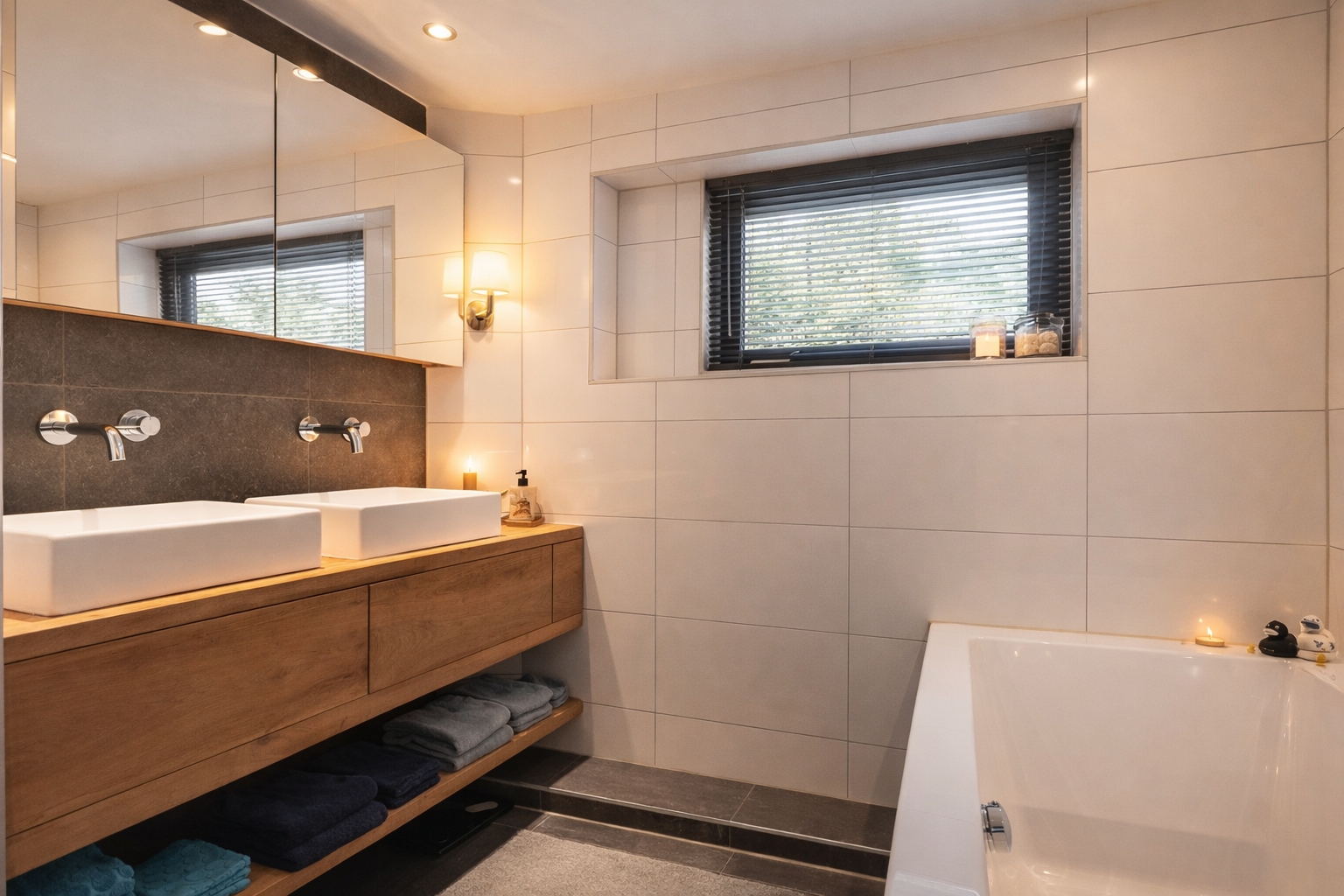 Three steps lead down to the lower section of the extension, where a modern bathroom is located. This bathroom is fitted with a walk-in shower with glass screen and rain shower, a double-ended bath, a wall-mounted WC, a designer radiator and electric underfloor heating. The oak vanity unit with twin basins and mirrored cabinet forms a stylish ensemble. A large window with opening section provides pleasant natural light and ventilation.