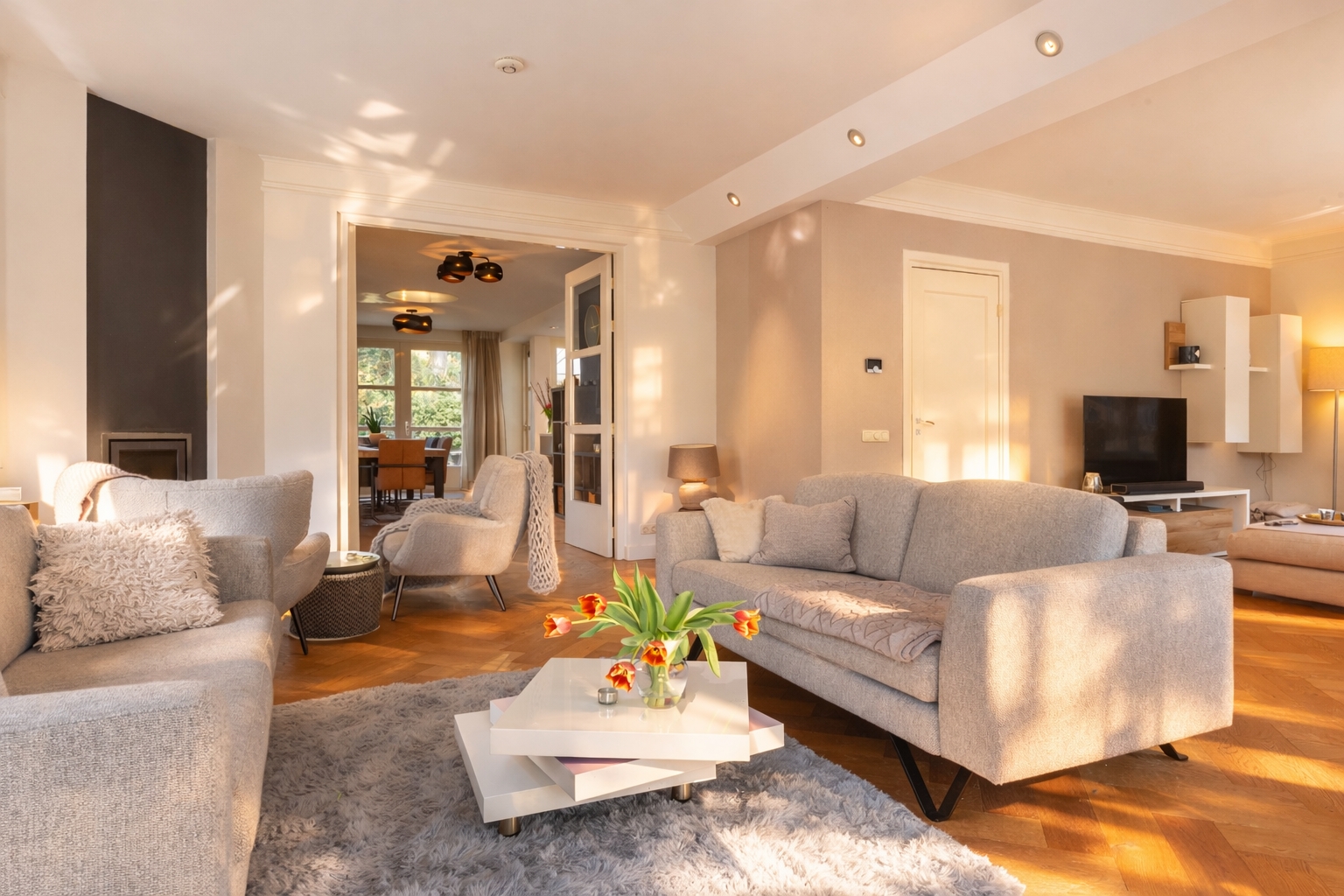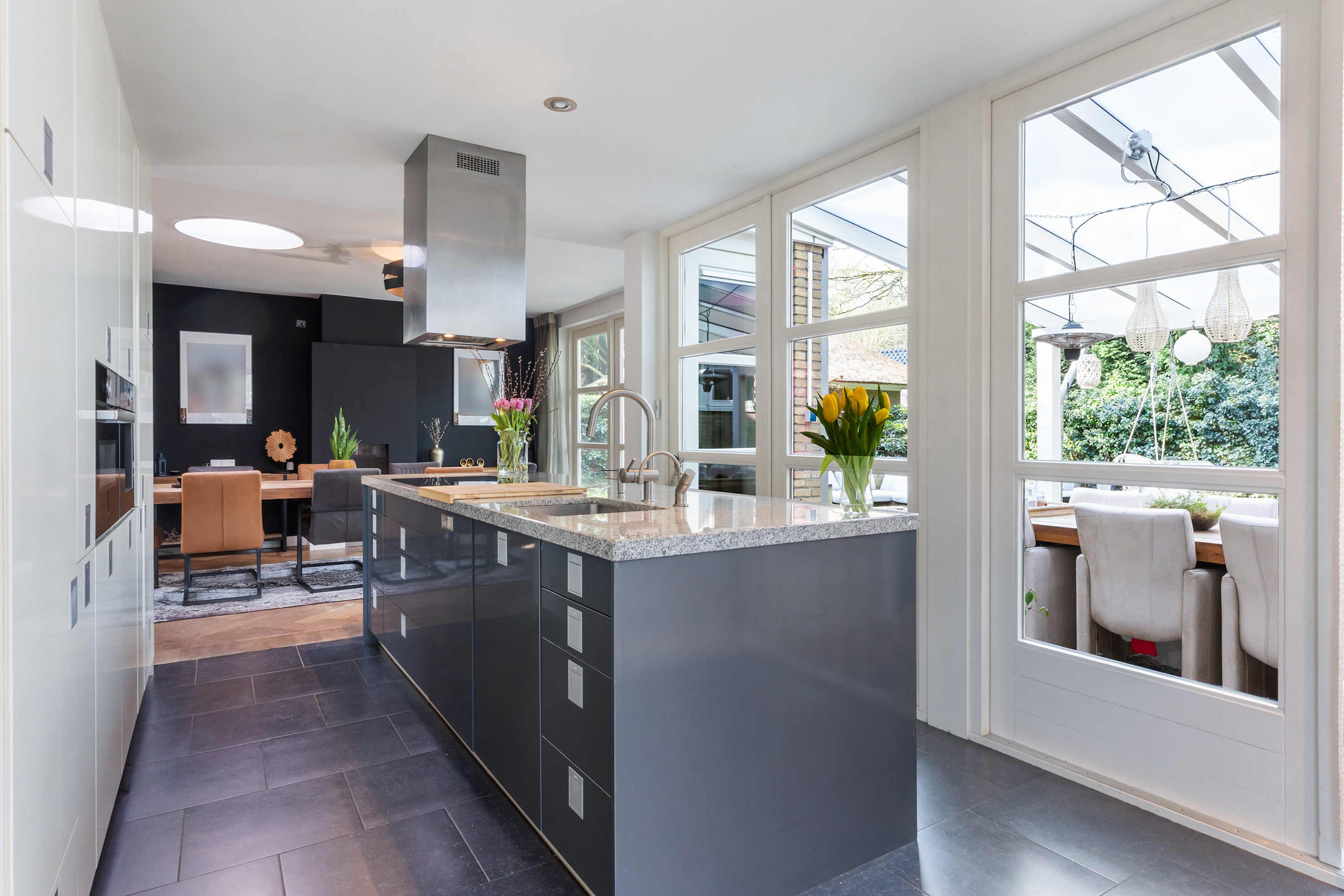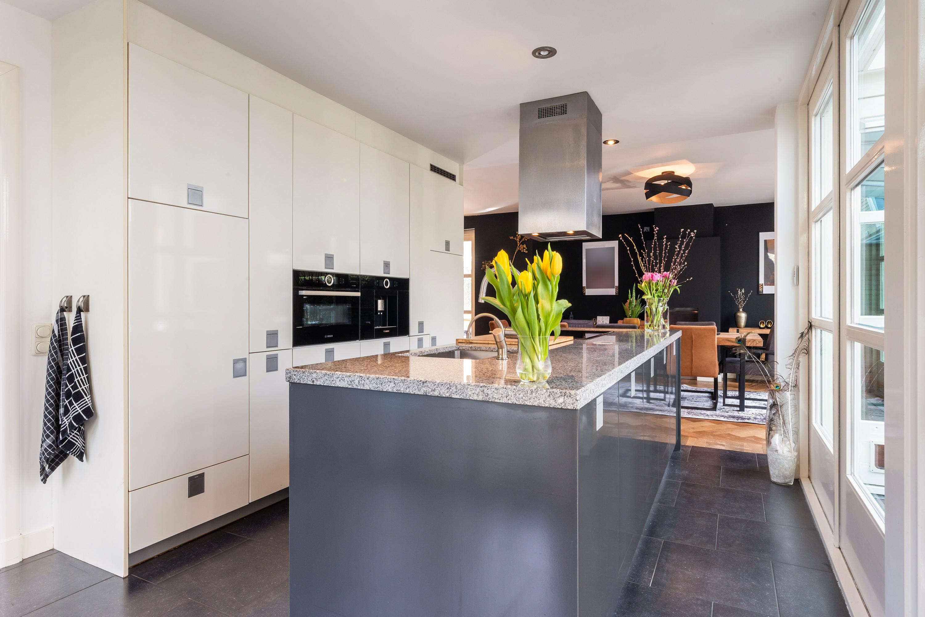 The kitchen forms the heart of the home and offers ample space for a large dining table. A gas fireplace and a roof lantern provide additional atmosphere and natural light. Double doors open onto the garden, while a single door provides access to the veranda. The high-end Leicht kitchen is finished in gloss white and grey, with a granite worktop and fitted with premium appliances including a coffee machine, combination oven, dishwasher, refrigerator, induction hob with stainless steel extractor hood and a Quooker tap.