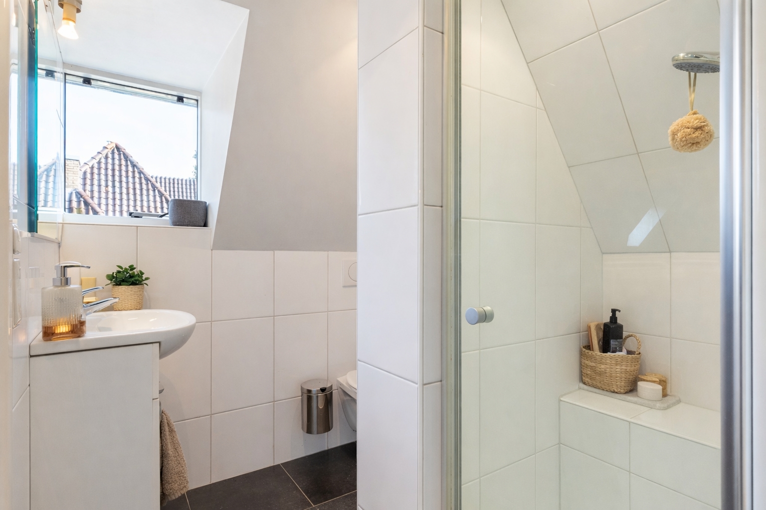 The second floor offers a fully functional and flexible living level, comprising a spacious landing, two large bedrooms and a third room with a skylight. Both main bedrooms have access to a second bathroom, fitted with a walk-in shower, vanity unit and toilet. Thanks to its layout and facilities, this floor is ideally suited for use as a self-contained guest accommodation or apartment.