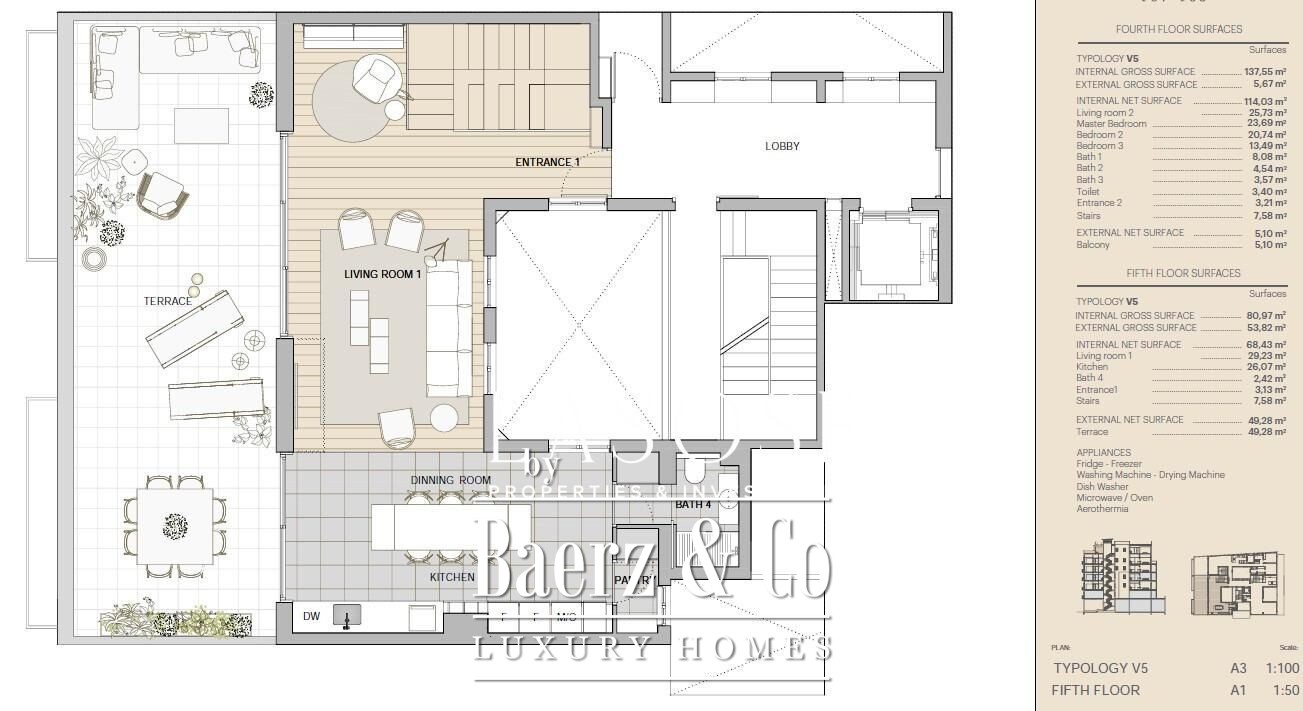 With three bedrooms and five bathrooms, the layout supports both private living and refined entertaining. Impeccable finishes complement modern appliances, air-conditioning, heating, video intercom, and thoughtful conveniences such as wardrobes cupboards and a dedicated washing room.