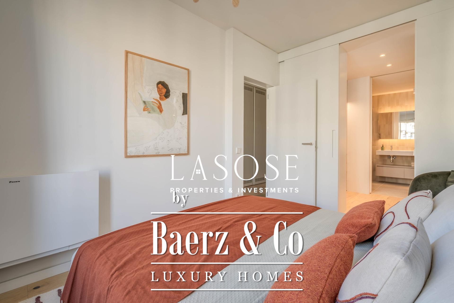 This particular residence offers 137 m² of living space, thoughtfully arranged with two bedrooms and three bathrooms. Balconies and a generous terrace connect interiors to the pulse of the city, while the building’s façade and communal areas reflect the elegance of classic Barcelona. Interior finishes, designed by Estudio Vilablanch, balance modernity with enduring style, featuring premium appliances, expansive wardrobes, heating, and a refined light-filled atmosphere.