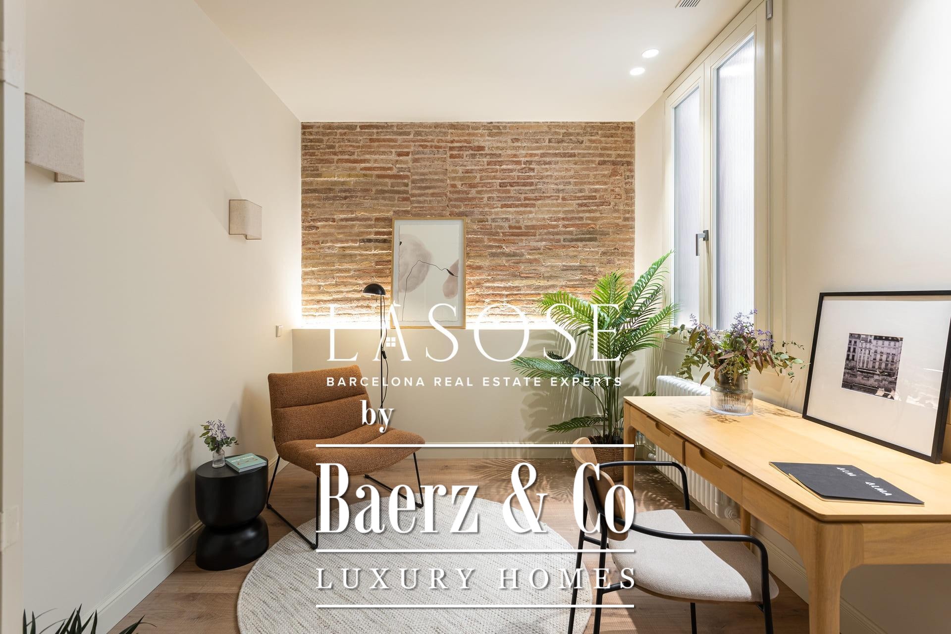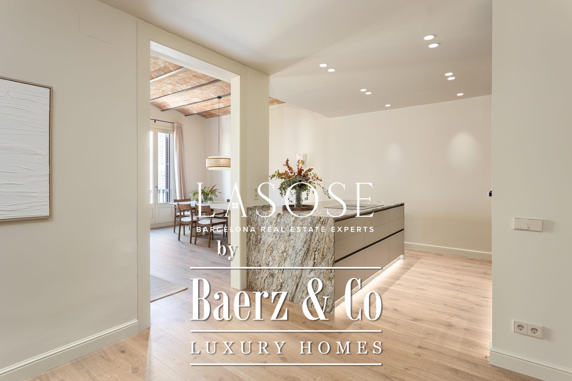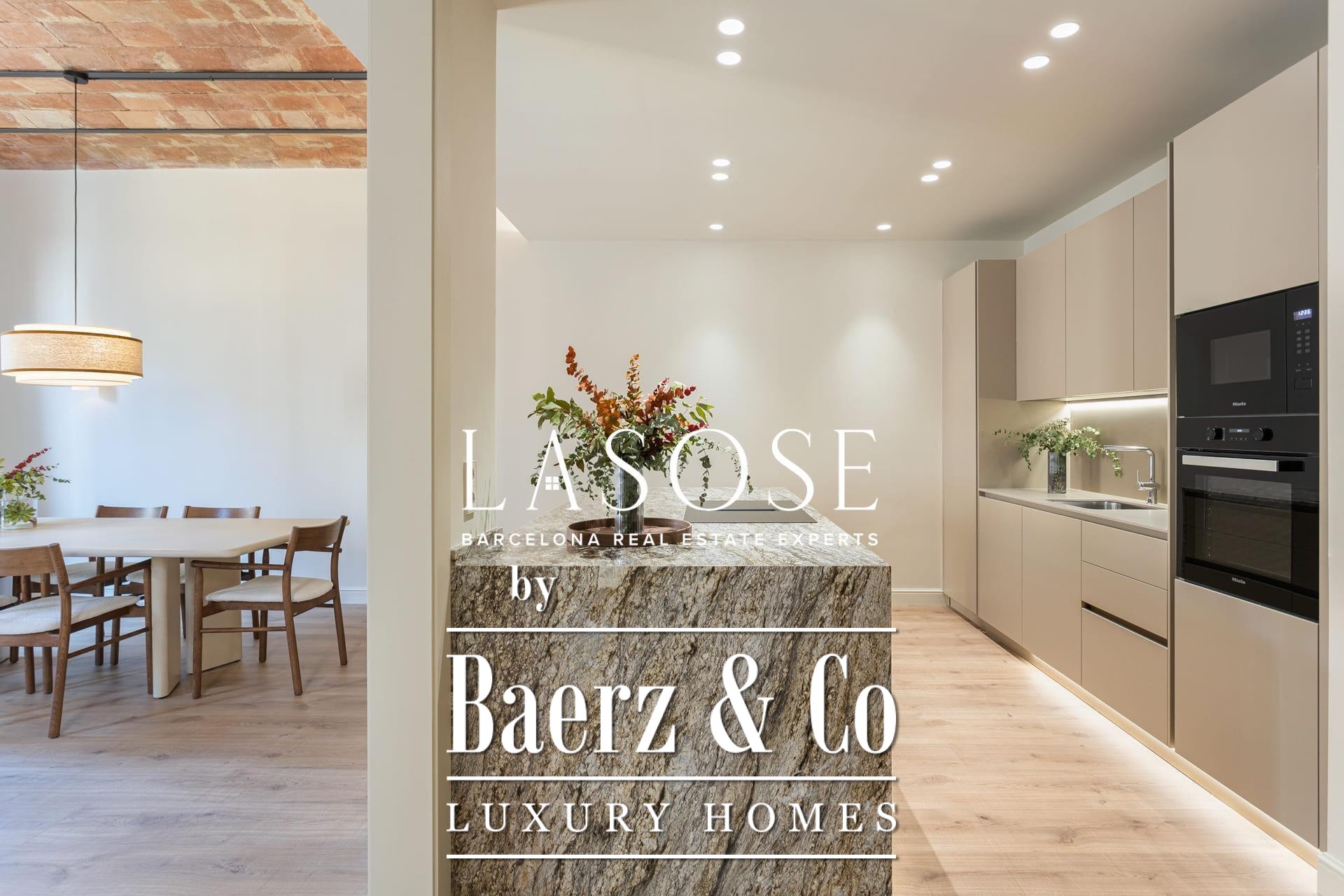 A curated renovation retains the dramatic Catalan vault ceilings and exposed brickwork, lending warmth, history, and authenticity rarely found on the market. The living and dining room blend effortlessly with the designer kitchen, centered around a substantial island, perfect for social gatherings and daily rituals. Two classic balconies bathe the space with east-facing morning light and overlook the stately Roger de Llúria street.