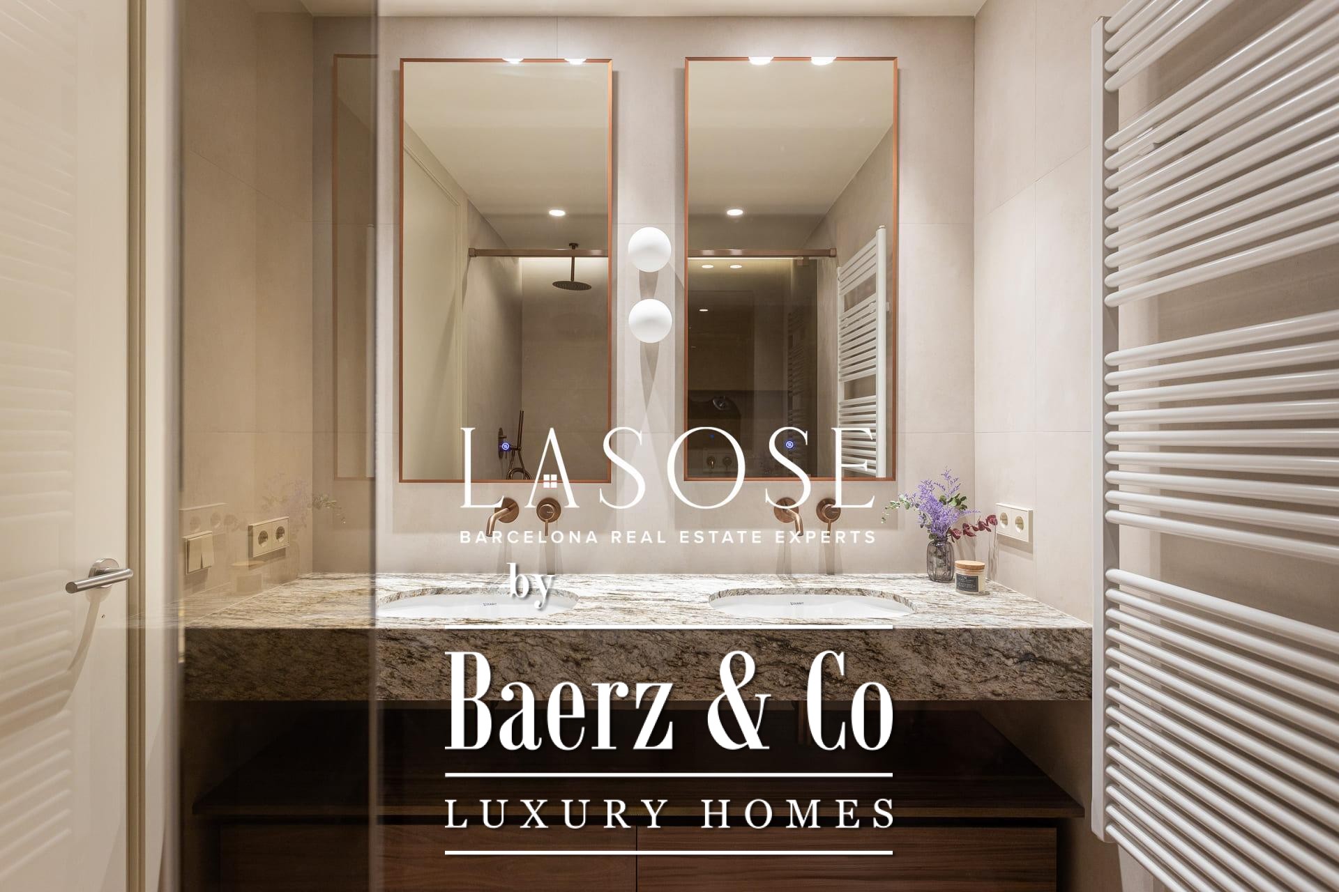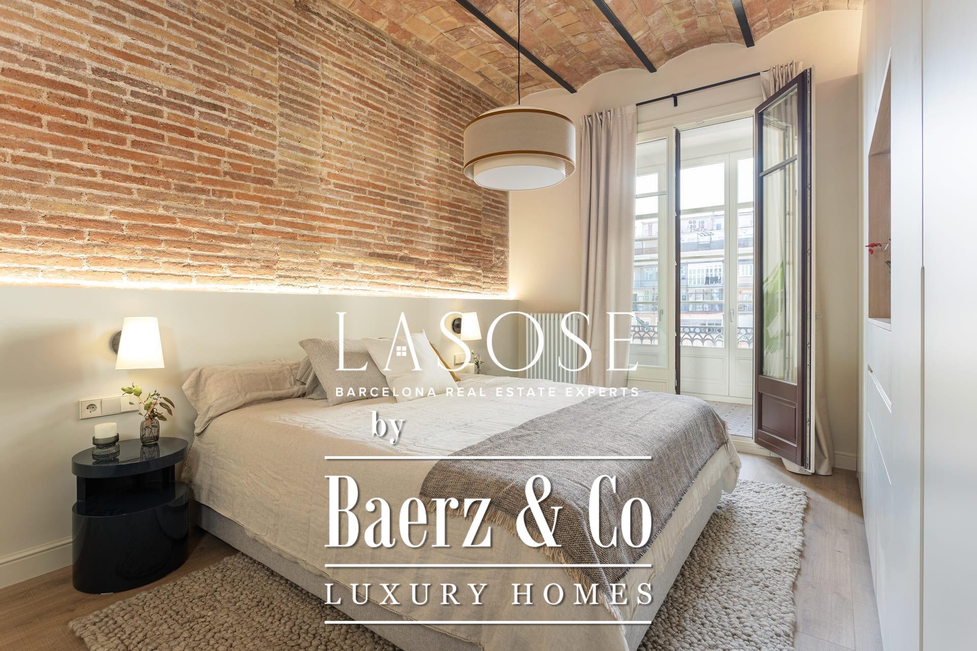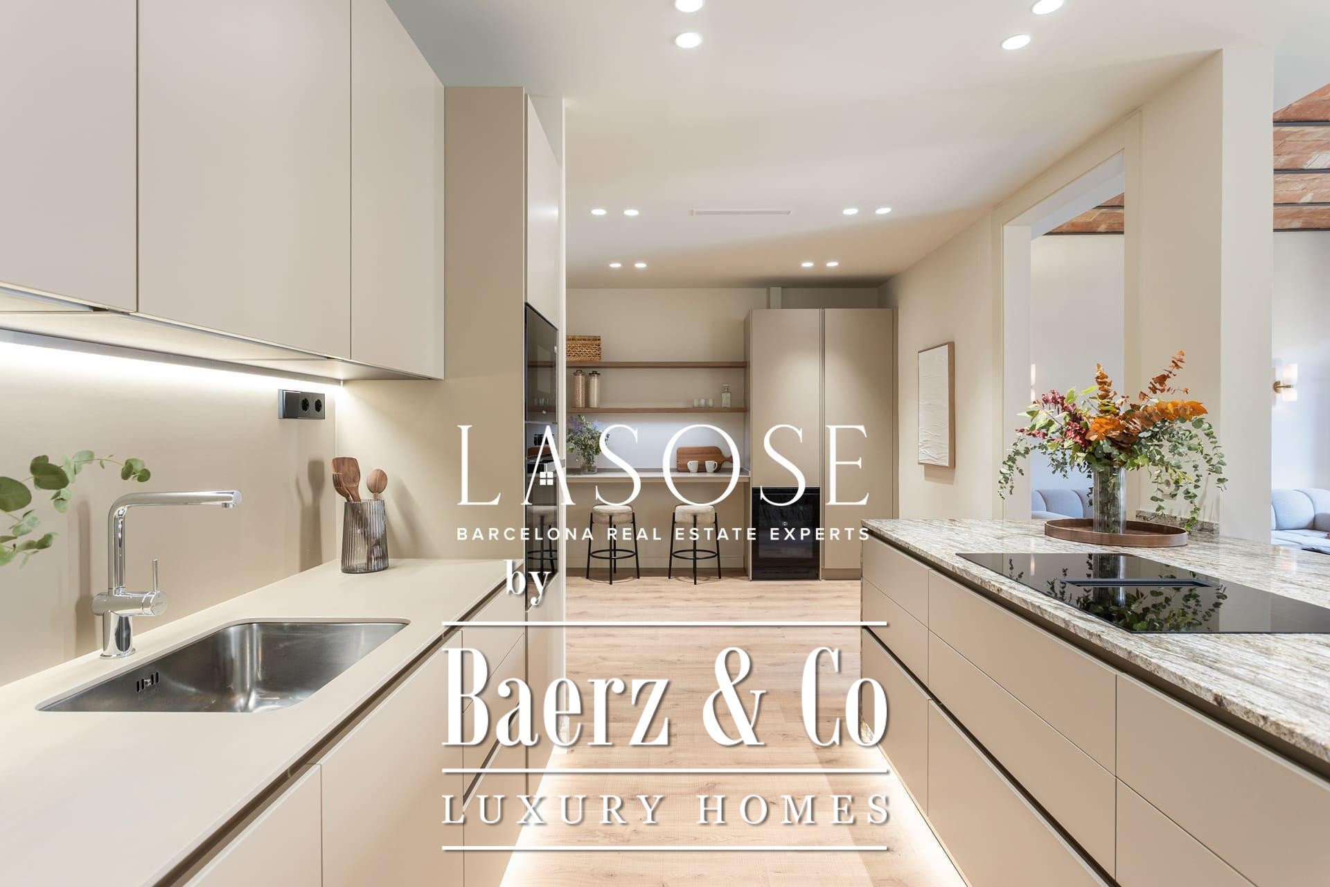 A curated renovation retains the dramatic Catalan vault ceilings and exposed brickwork, lending warmth, history, and authenticity rarely found on the market. The living and dining room blend effortlessly with the designer kitchen, centered around a substantial island, perfect for social gatherings and daily rituals. Two classic balconies bathe the space with east-facing morning light and overlook the stately Roger de Llúria street.