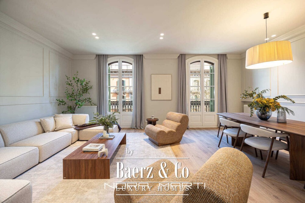 Apartment Barcelona with terrace defines refined city living in the highly sought-after Eixample district. This 203 m² residence presents a harmonious blend of classic architecture and contemporary finishes, all carefully renewed to honor its stately heritage while embracing understated modernity.