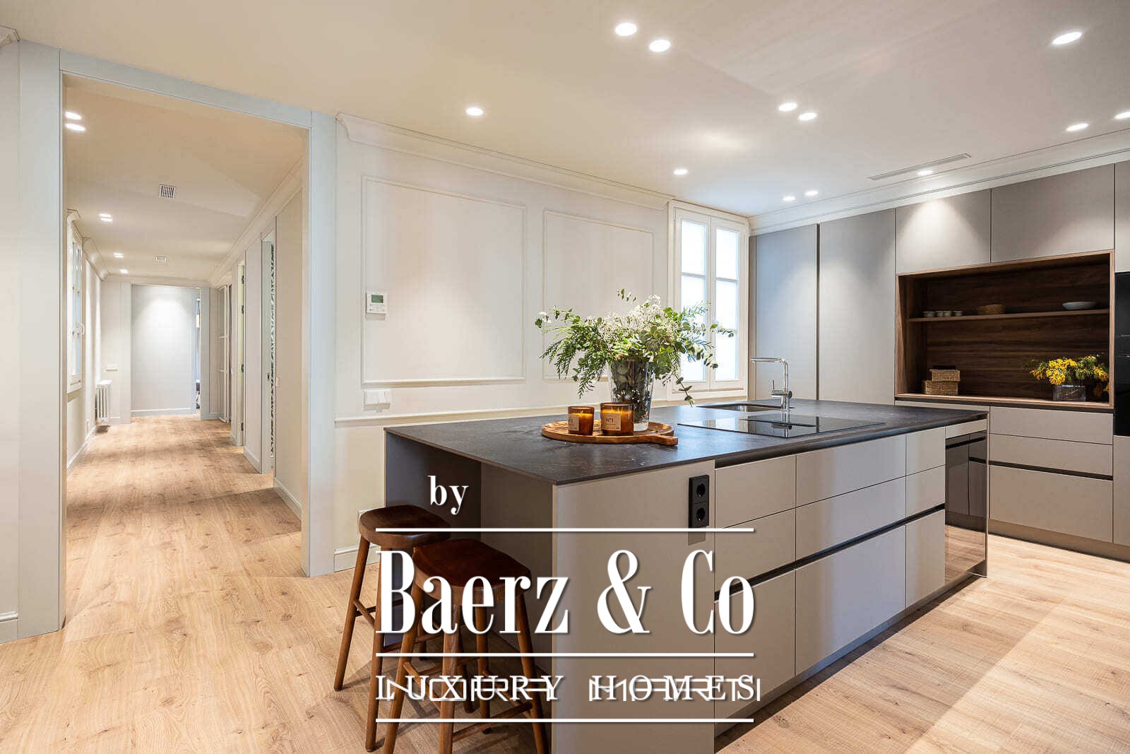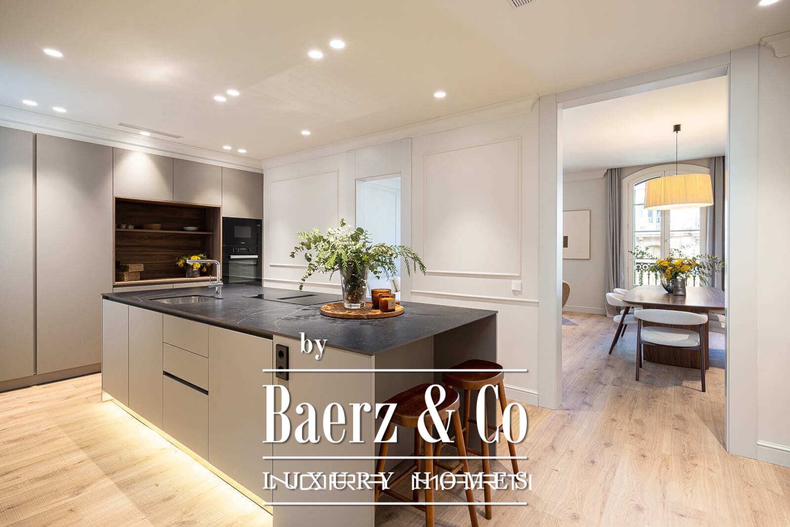 A sense of spaciousness permeates the home, where high ceilings and restored original details invite light throughout every room. The focal living-dining space opens to two balconies overlooking Pau Claris Street, bathing interiors in natural daylight and heightening the apartment’s serene character. A large independent kitchen with a central island delivers practicality infused with contemporary design, ensuring daily routines unfold effortlessly.