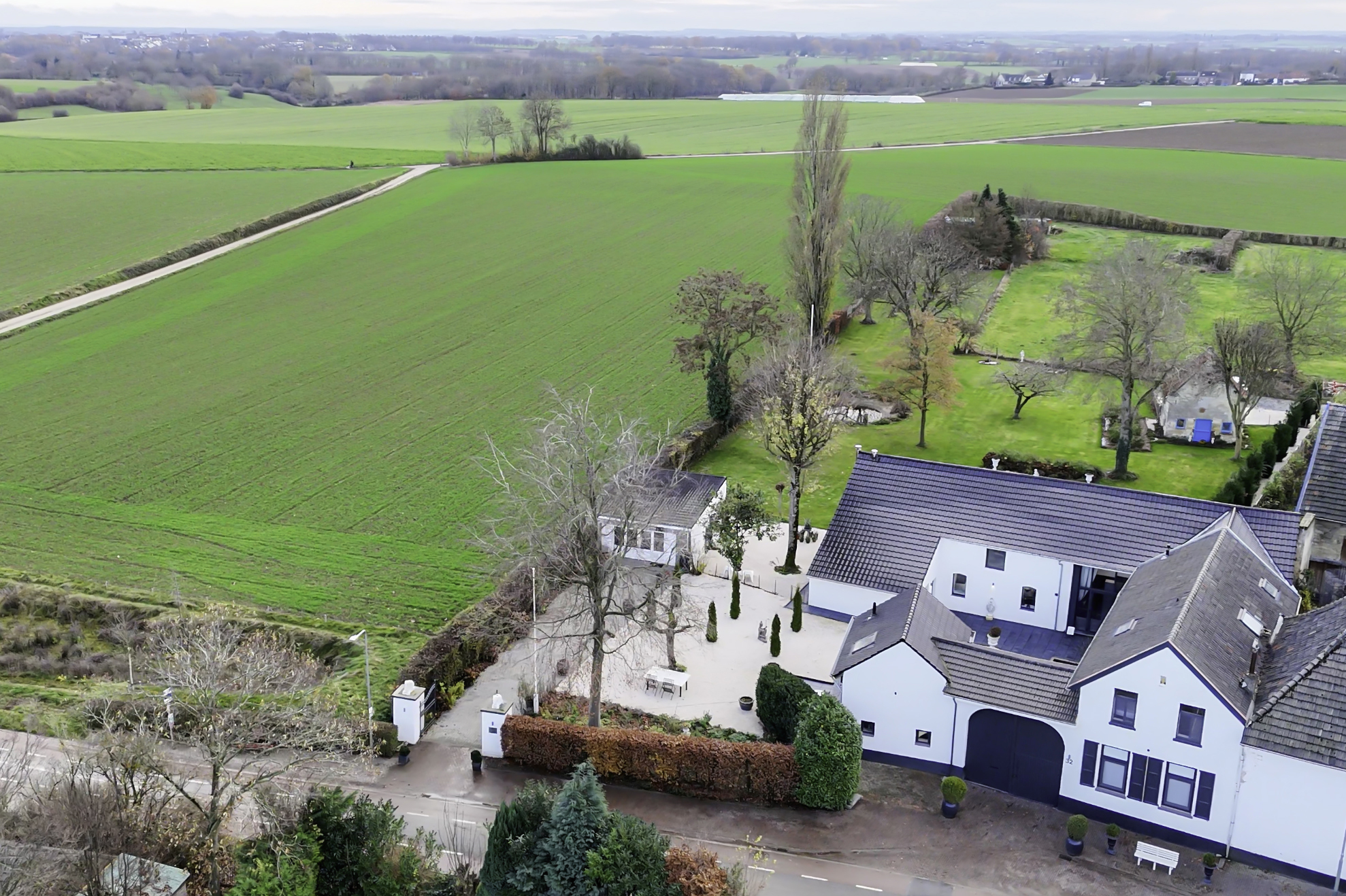 Designed for complete seclusion, the property offers the privacy normally associated with major European estates. Along one boundary, a tall, elegant row of slender evergreen conifer trees provides privacy, while the remaining sides open freely into the surrounding landscape. A low, softly undulating hedge, following the natural contours of the terrain, frames the far-reaching views and enhances the estate’s sense of openness. This subtle combination of privacy and expansive horizons is uncommon in the Netherlands.