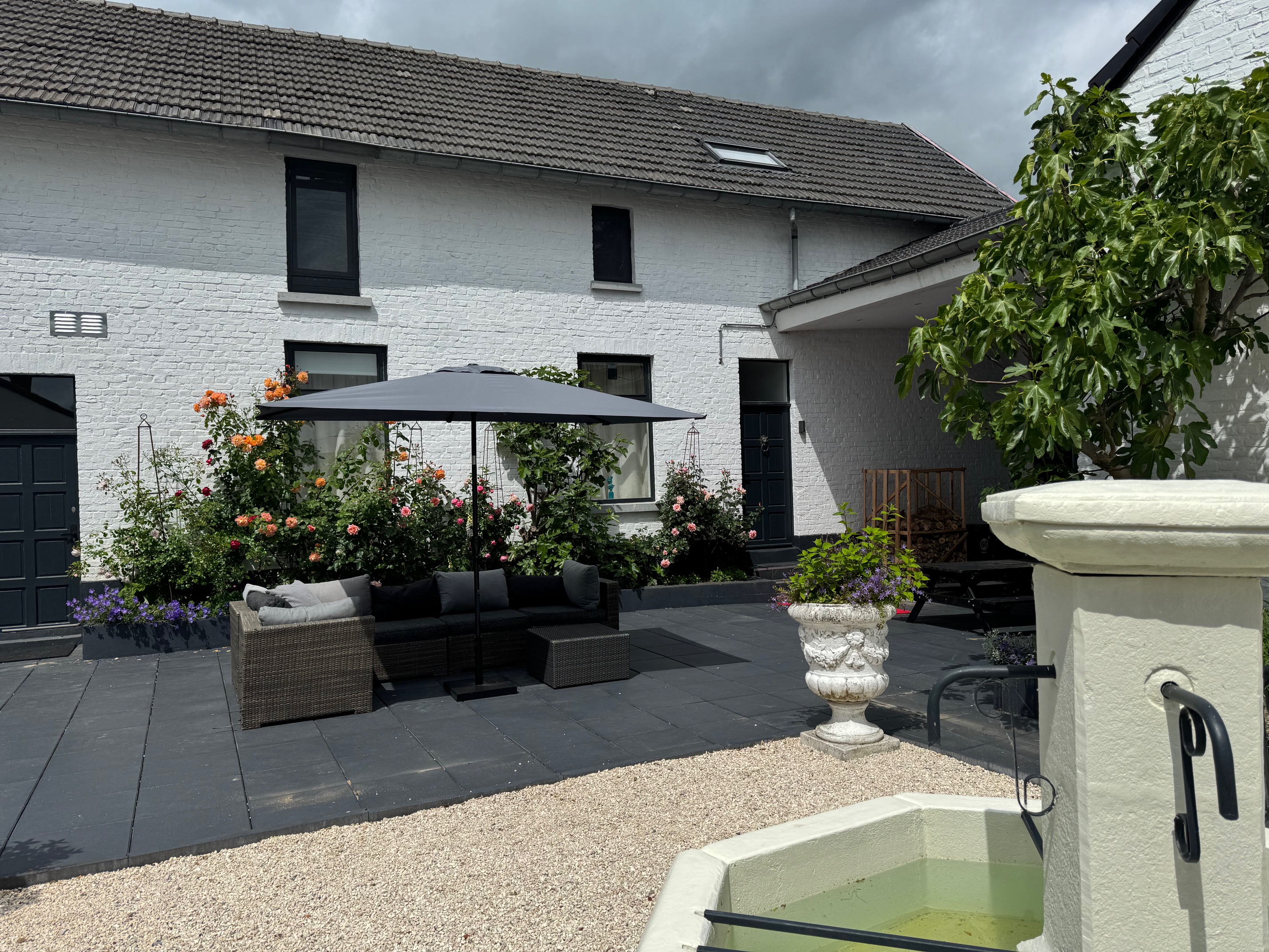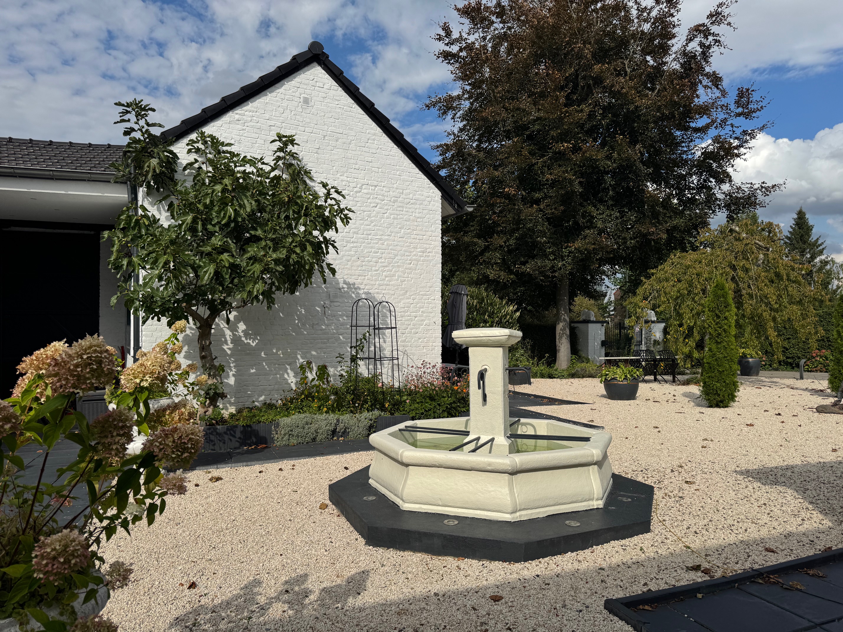 Tall historic entrance gates lead into a striking, fully paved courtyard composed in a single refined material palette. Château gravel, a large French fountain and sight lines toward the rare marlstone windmill lend the space a quiet, timeless grandeur. The courtyard serves as the serene centre of the estate – a place where light, order, peace and quite converge.