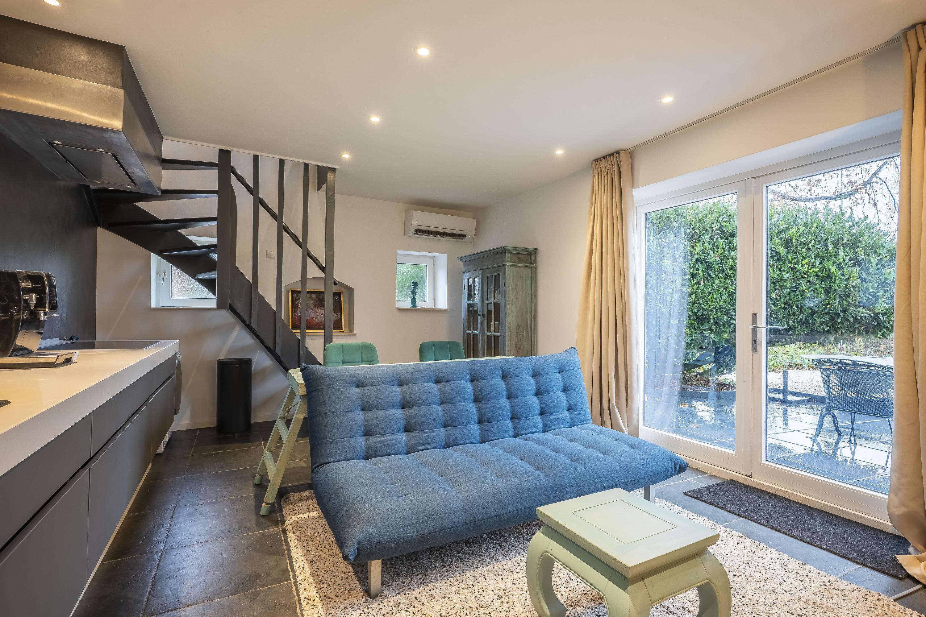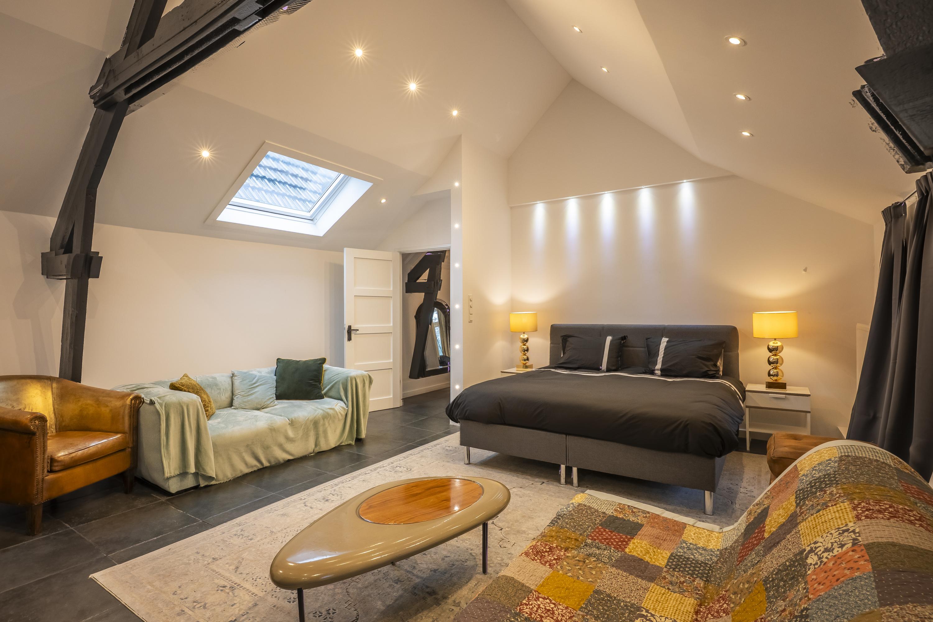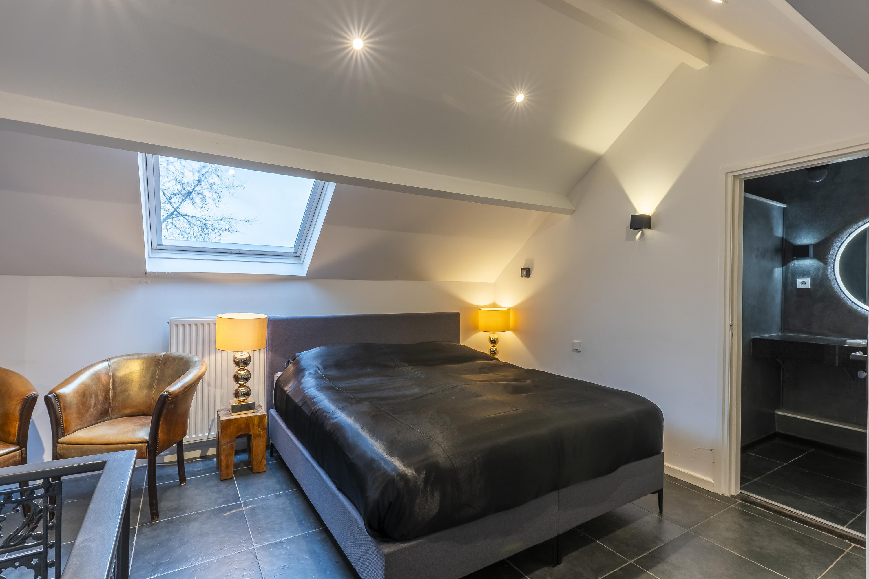 The main residence is conceived around light, proportion and a strict architectural consistency. The spacious living kitchen, fitted with Gaggenau appliances, forms the heart of the home. The adjoining living area exudes understated luxury with generous windows, a modern wood stove, and direct access to both the courtyard and the garden terraces. Large anthracite tiles extend seamlessly outdoors, creating a unified interior–exterior composition. A study (or additional bedroom) on the ground floor and the elegant Golden Bathroom complete the ground level.