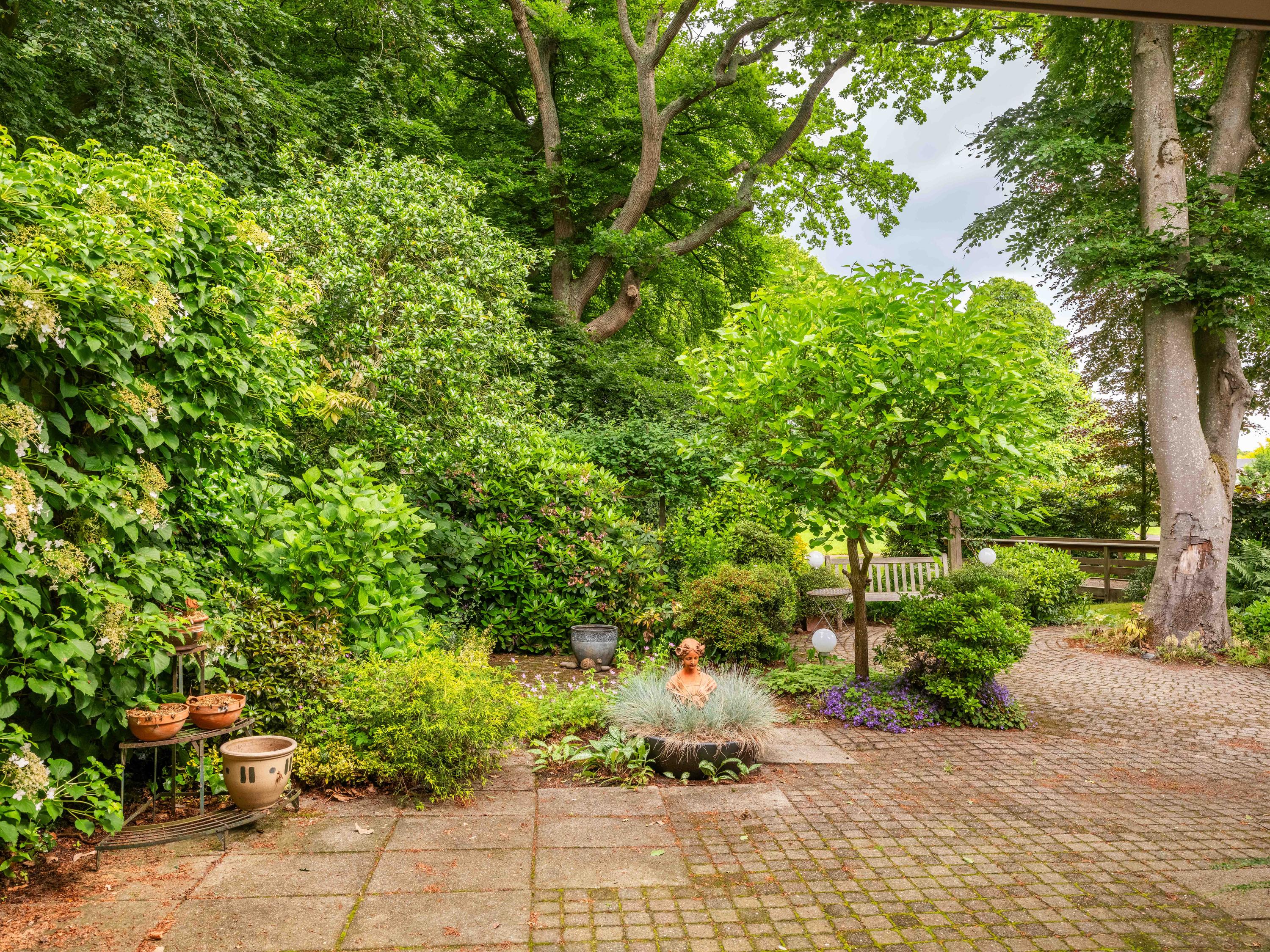 The garden is equipped with a sprinkler system and garden lighting.