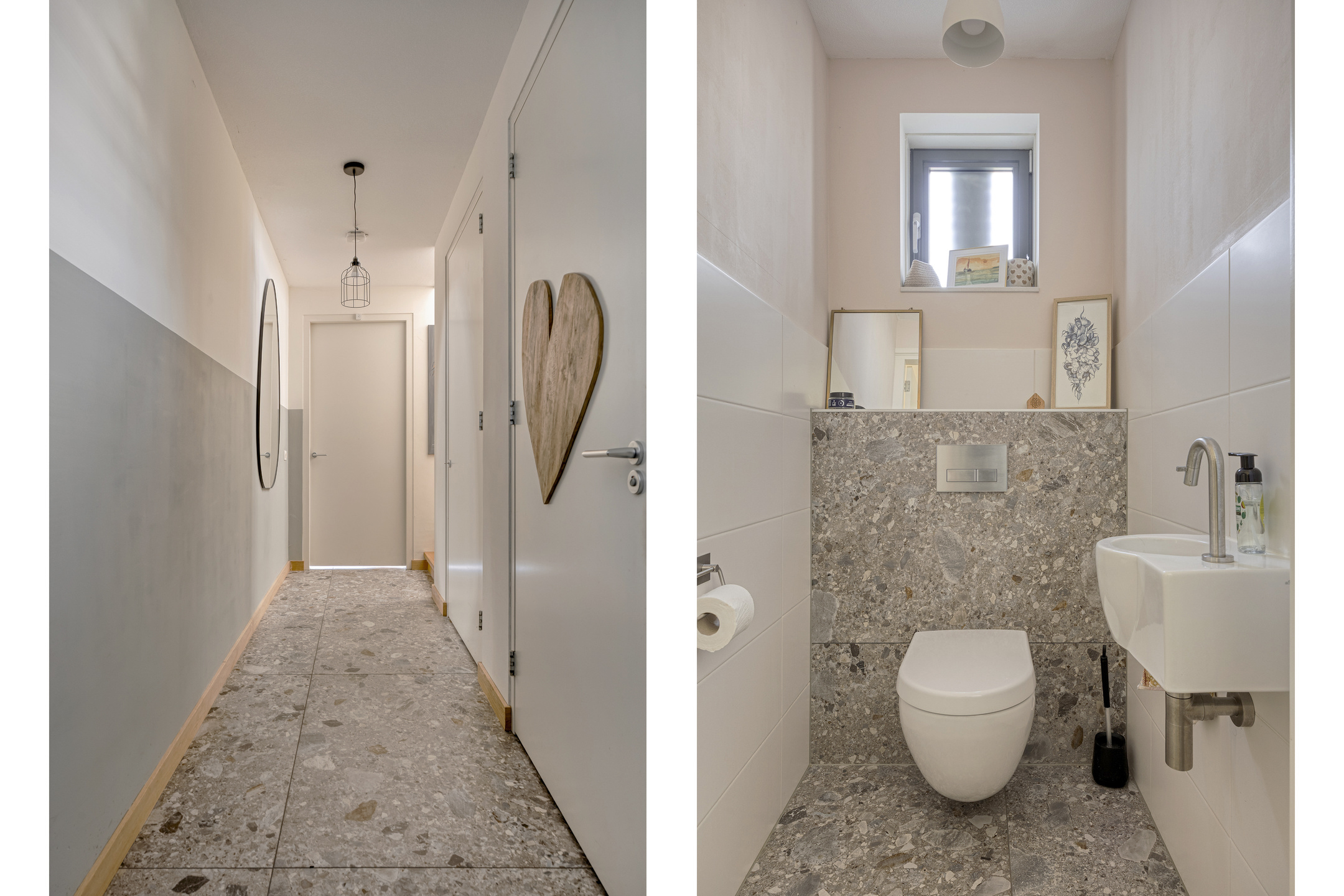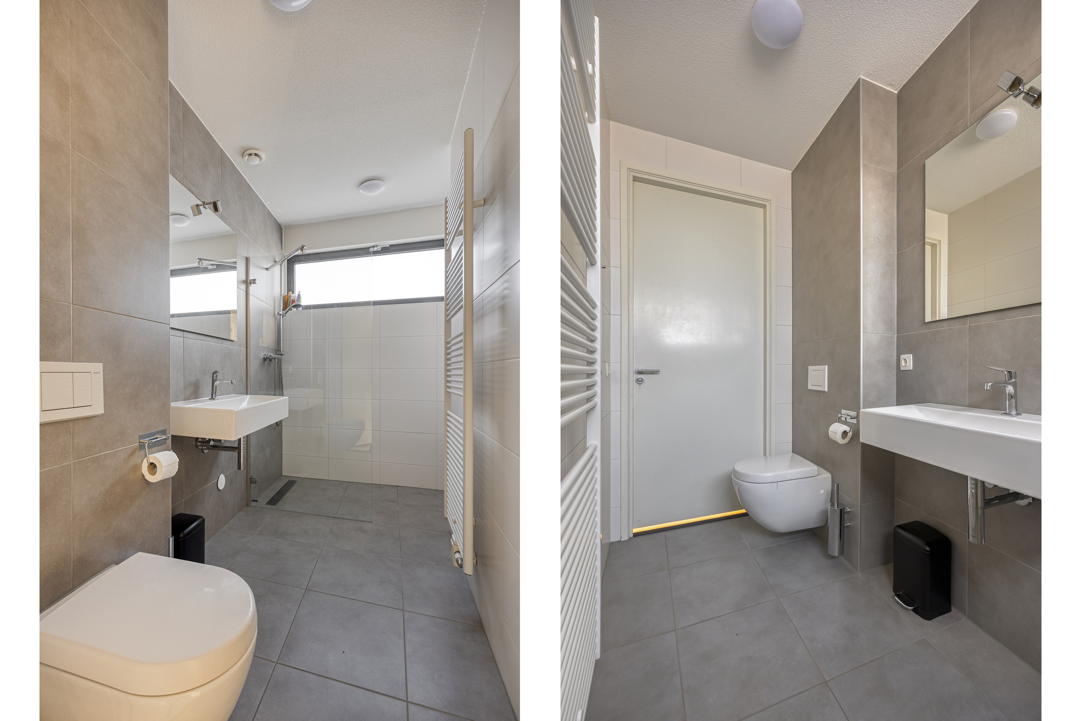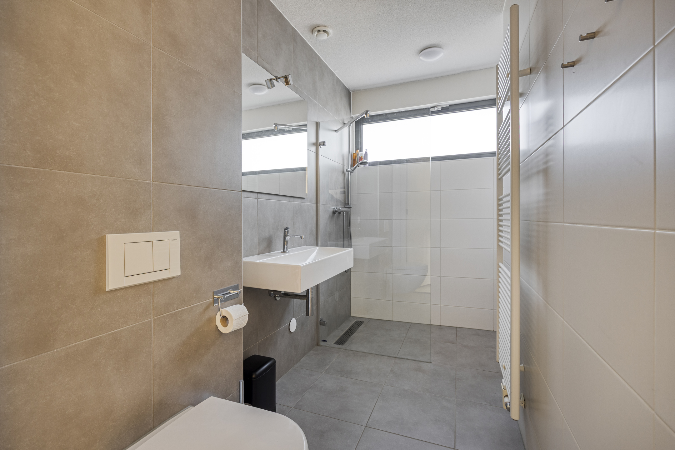 Second bathroom: tiled, equipped with walk-in shower, toilet, double washbasin vanity, designer radiator, and mechanical ventilation.
