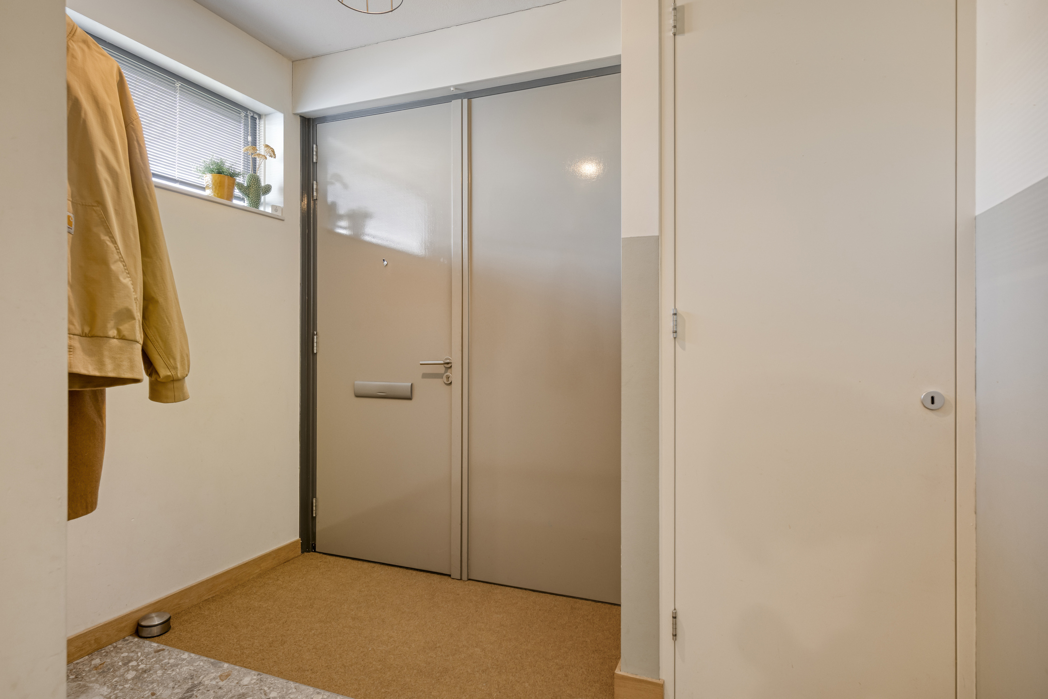 Hallway/entrance: plastered walls, poured floor, ceilings finished with spray plaster.