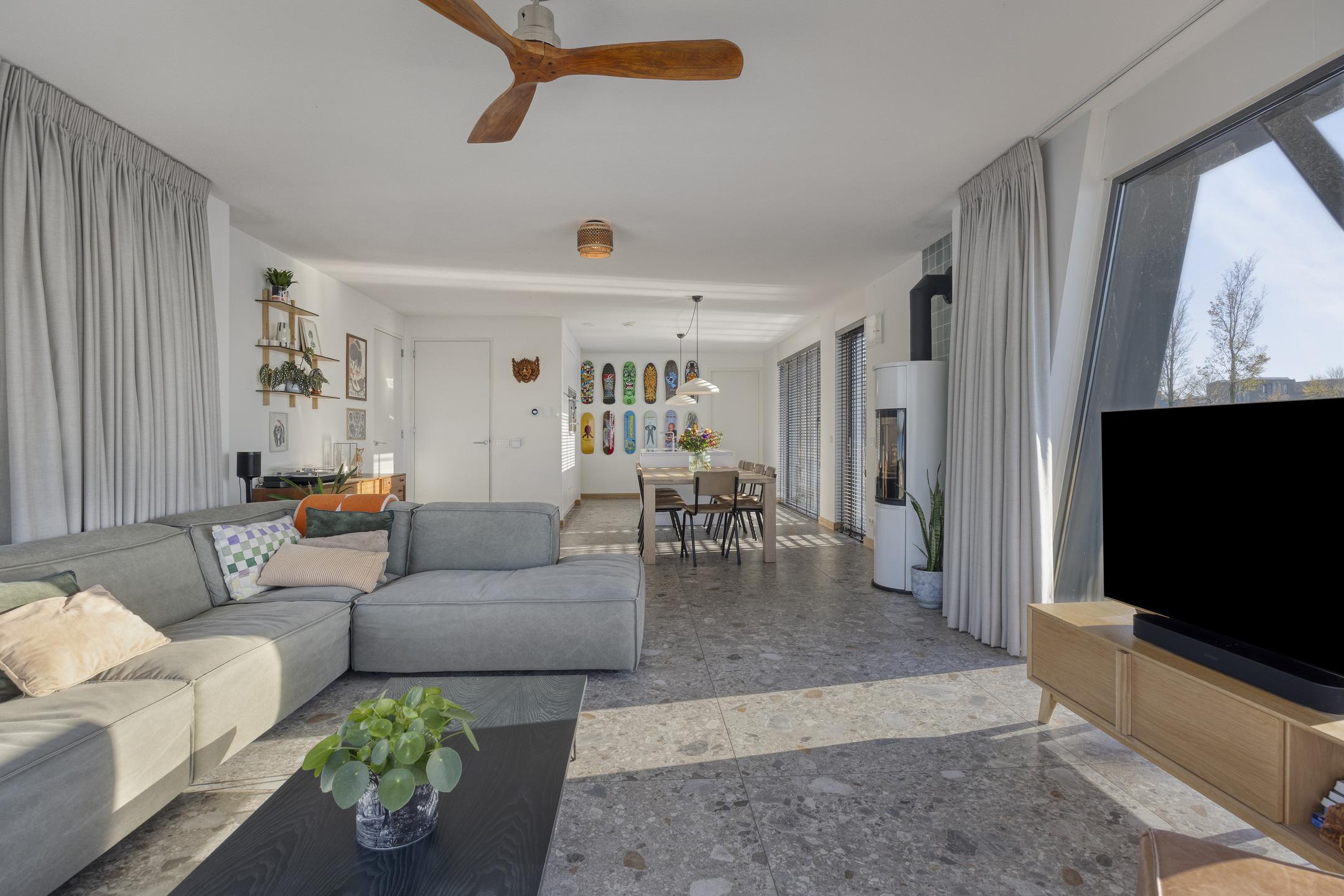 Living room (approx. 55.5 m² incl. kitchen): sliding doors to the waterside terrace and a side door to the lateral terrace. Features a Contura wood-burning stove (2024), plastered walls, tiled floor (recently replaced with a modern design from the current VT Wonen collection), ceilings with spray plaster.