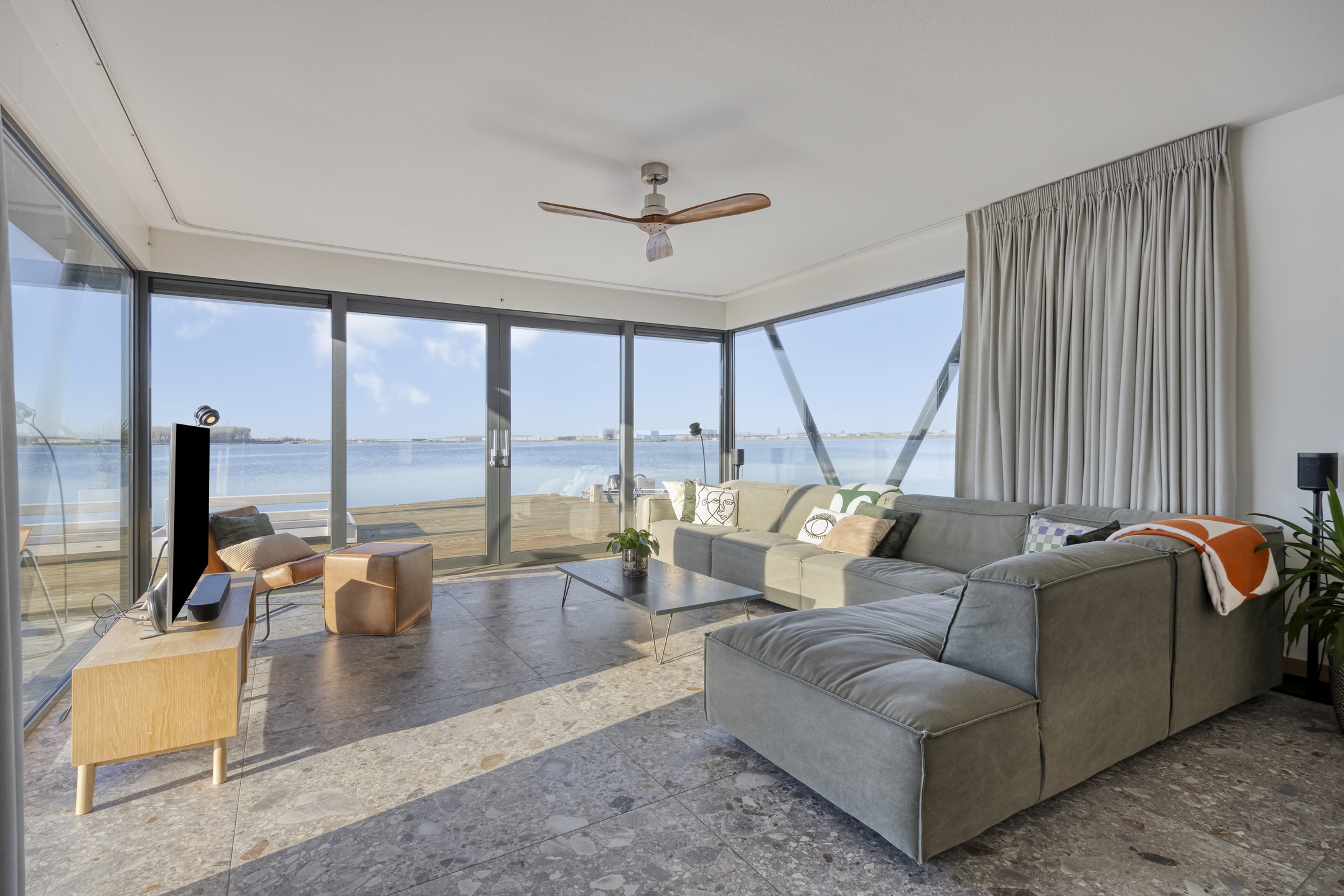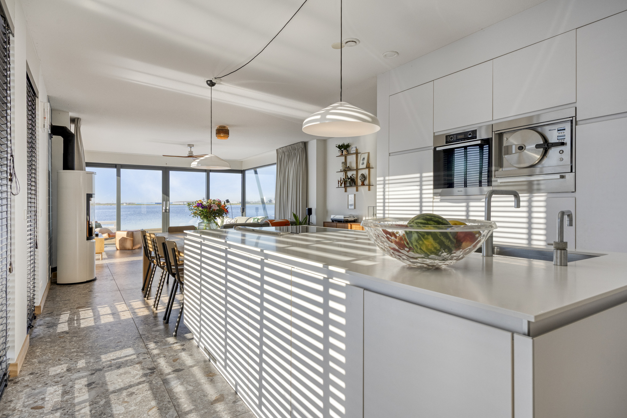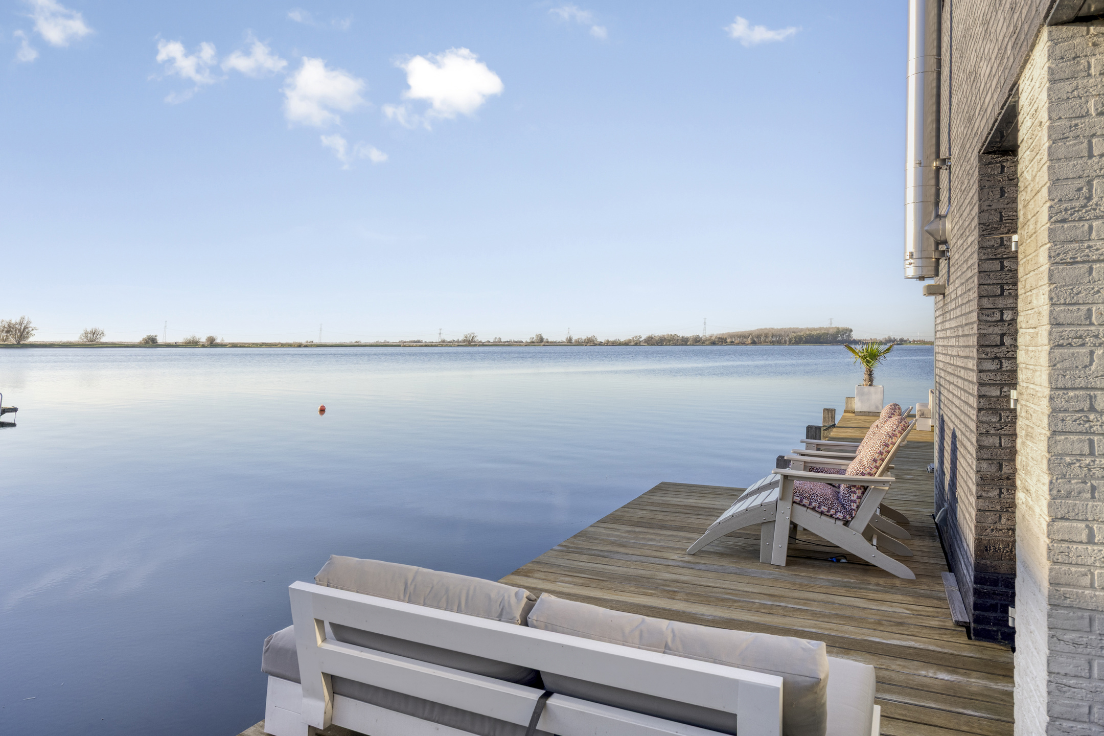 The view is truly unique, and every season has its own charm. Spring and summer bring lively scenes with boats, surfers, and birds. In the evening, the sun sets directly in front of the house—creating breathtaking colours every time. Autumn and winter, with their rain, wind, and cold, offer a completely different but equally stunning landscape. Kitesurfers often put on quite a show. And when temperatures drop low enough, you can even skate straight from your terrace!