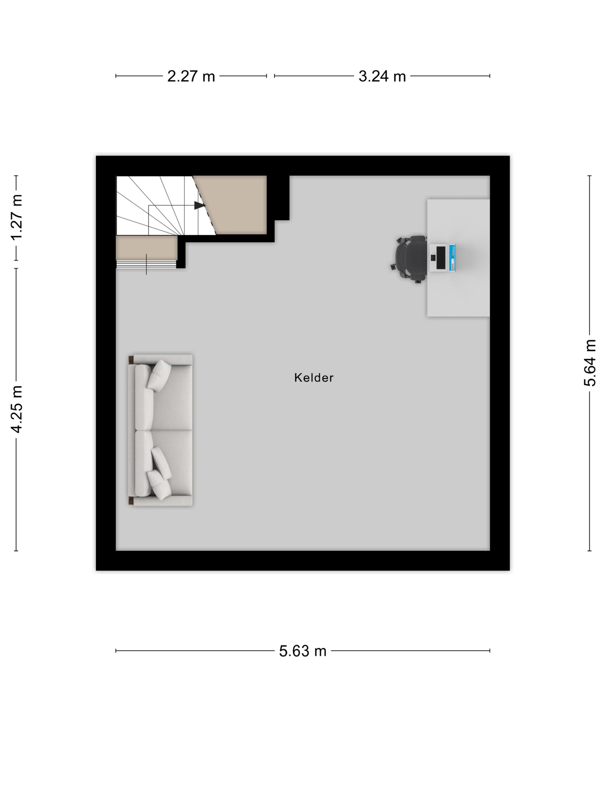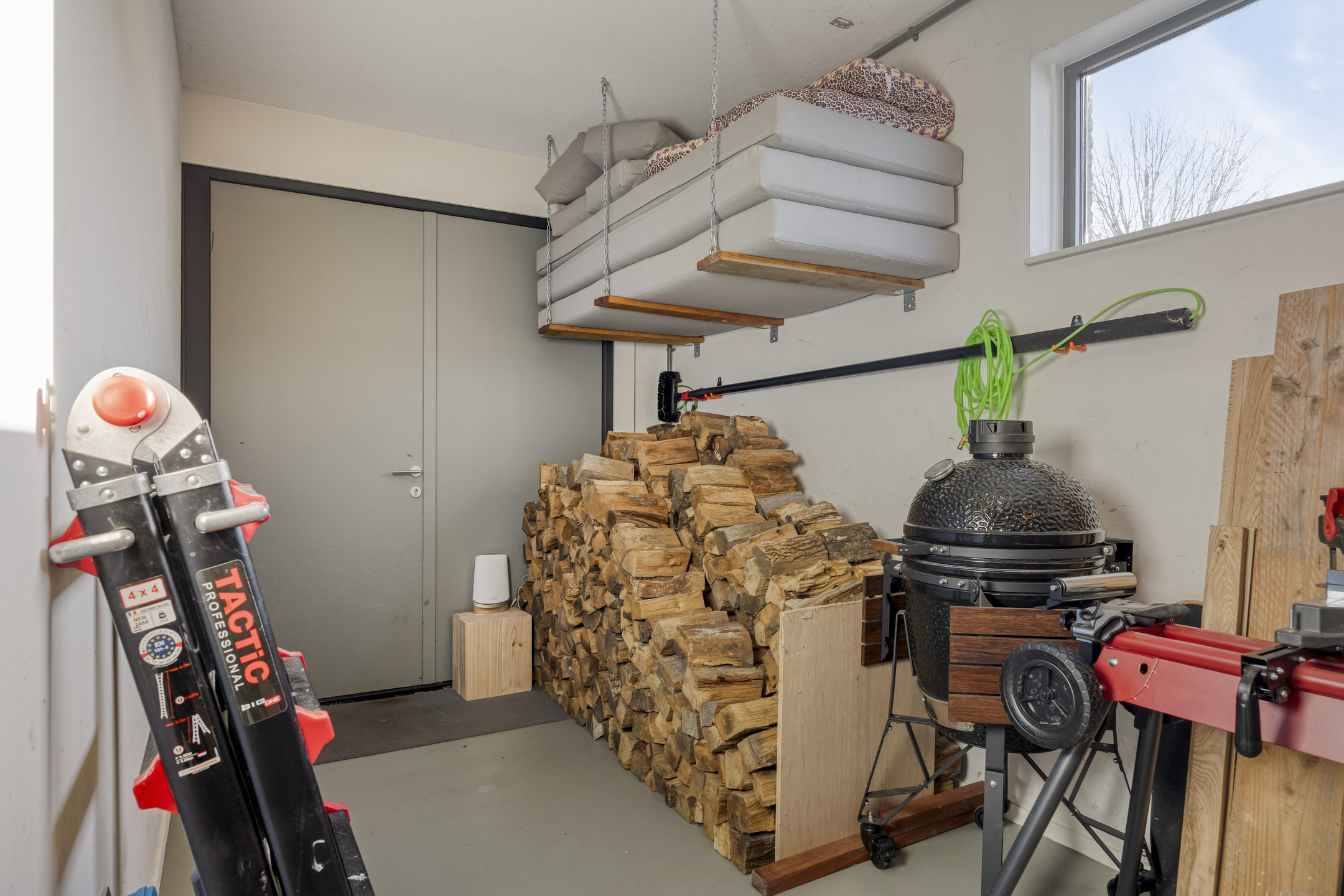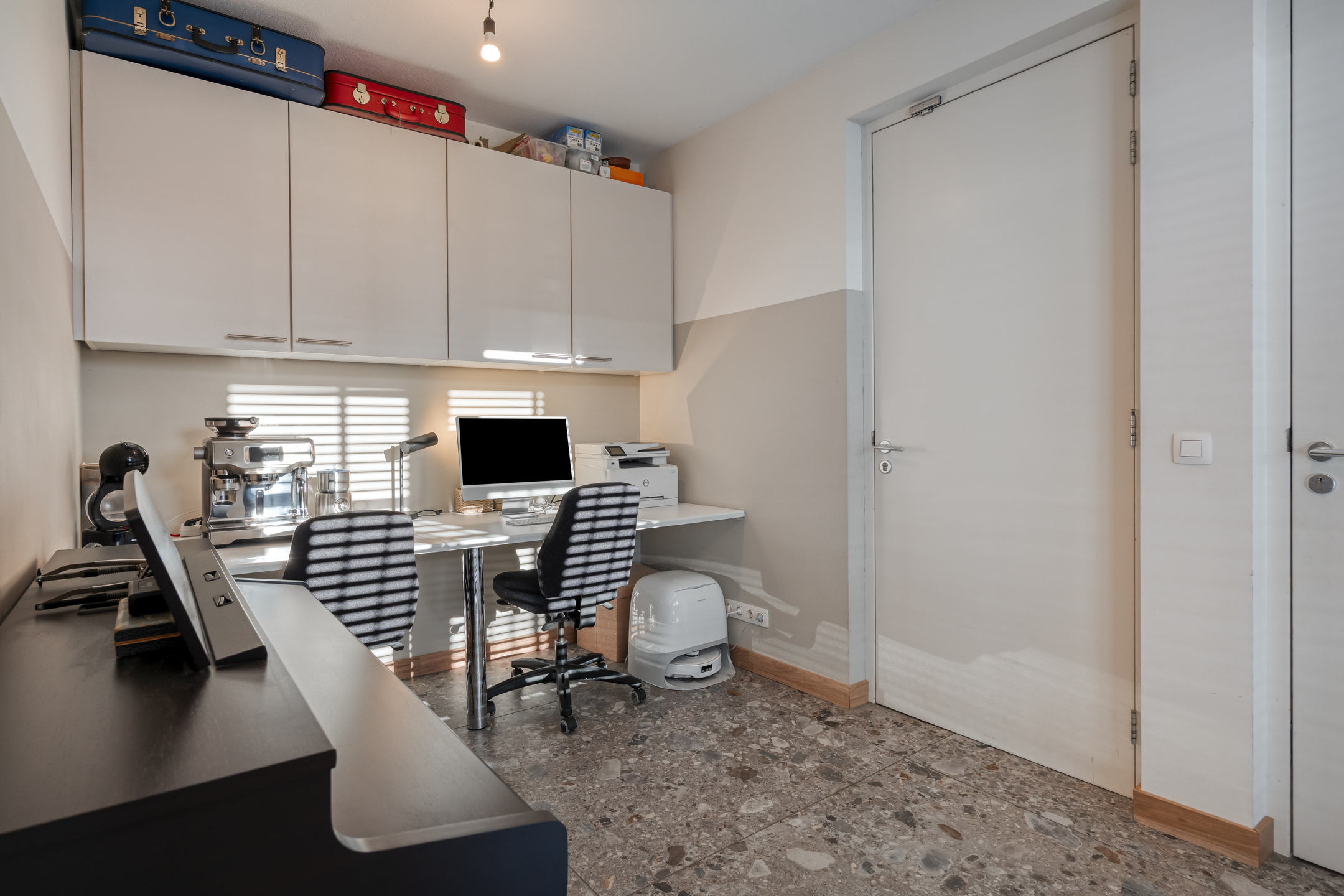 Behind the kitchen lies a transitional space currently used as a home office. From here you have access to the basement level, the garage, and the storage room. The garage and storage area can easily be divided, making it perfect for a home office or professional practice. The basement offers numerous possibilities as well—such as a hobby room, fitness area, or studio.